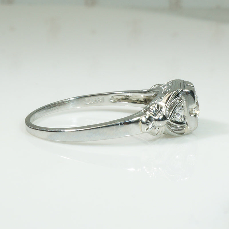 Between the fabulous filigree of the 1920s and the classic clean lines of the 1940s, there was a short span of time in the mid-1930s when one of my favorite styles of engagement rings was made. Often set with small diamonds (it was the Great Depression after all) the design of the settings was made in great detail to show off the little sparklers. This ring is a perfect example of this design era, details galore, an openwork design on the sides, bows on the shoulders, triple milgrain edges on shield-shaped settings for the tiny side diamonds, and a four-cornered pillow-like setting for the .20ct center diamond. 18k white gold and in incredibly crisp condition.