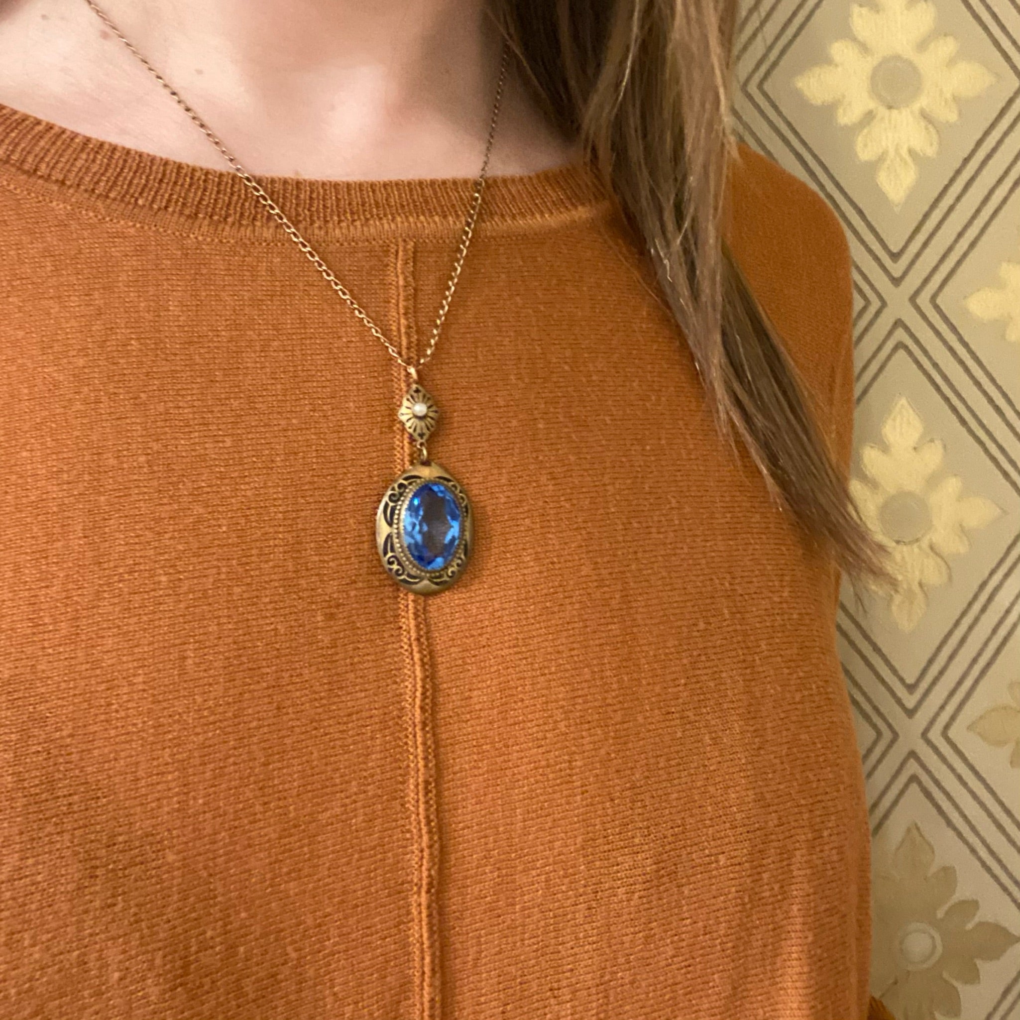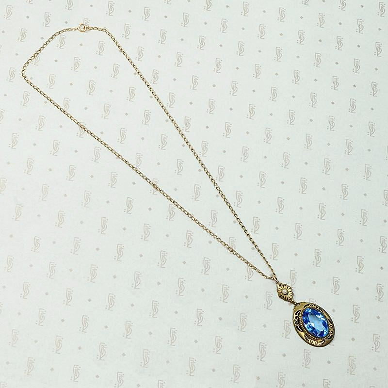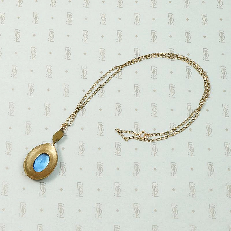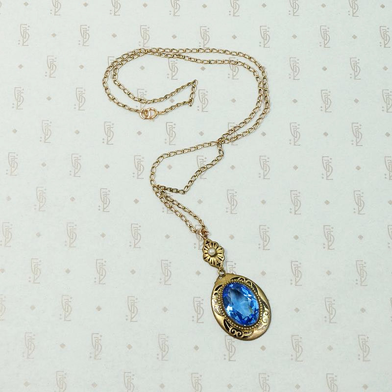 In the early 20th Century some of the loveliest jewelry was made from humble materials: brass and glass. This pretty necklace features a faceted blue glass gem set in an engraved jewelers brass frame. A little brass flower decorated with white cold enamel links the pendant to the chain. The vintage rose gold filled twisted curb chain compliments the pendant perfectly. Circa 1920.
