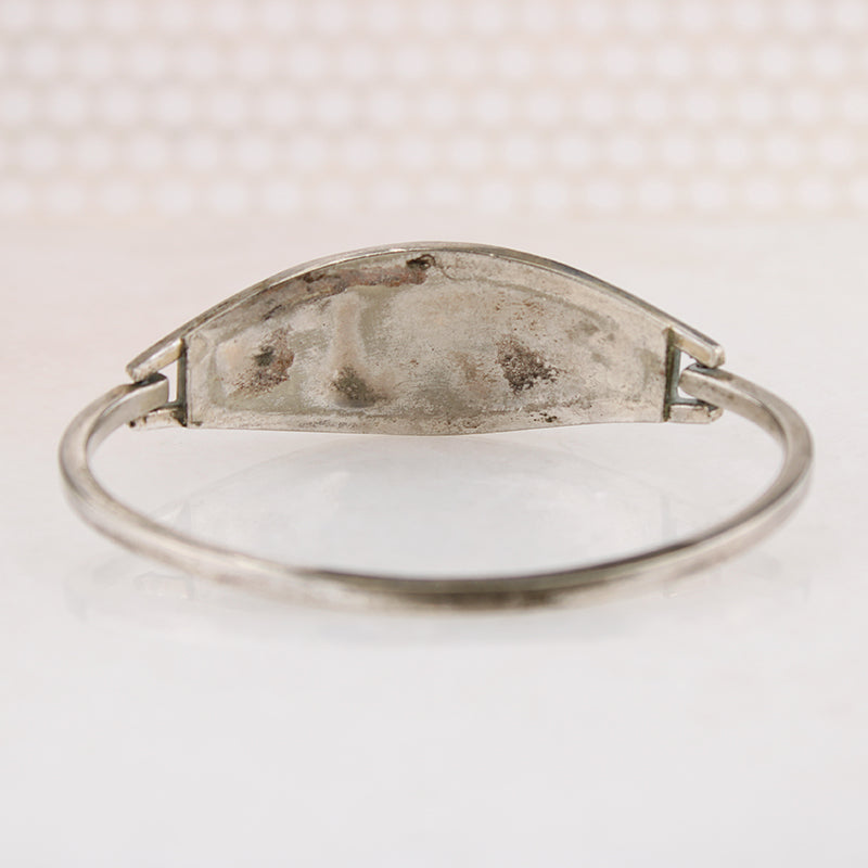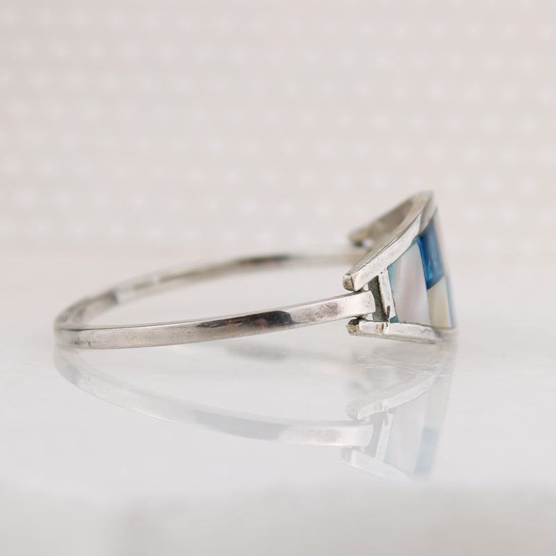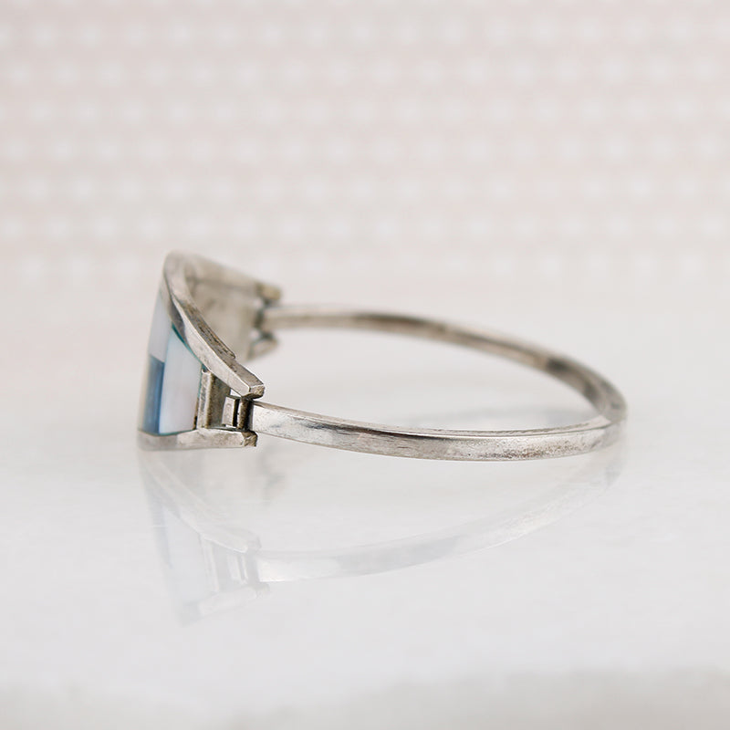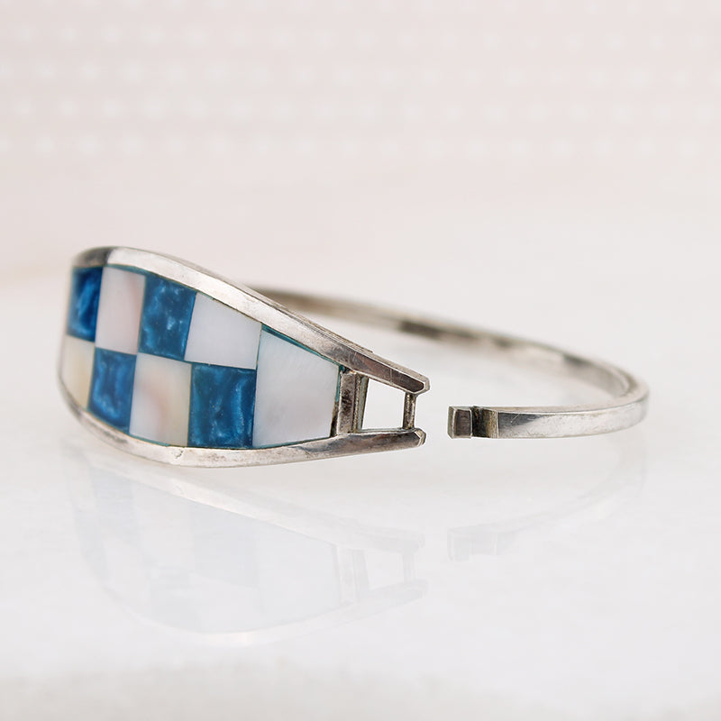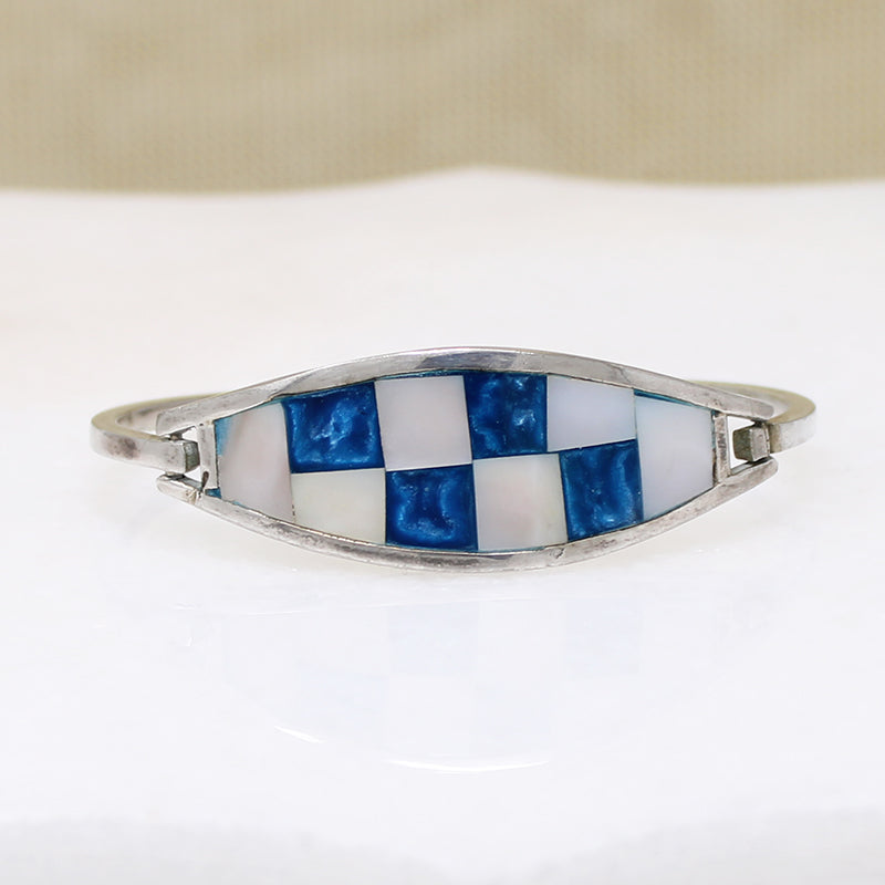A fun and delicate bracelet with a bohemian flair. Artistic mother-of-pearl squares alternate with deep shimmering blue to create a checkerboard inlay. The blue squares remind me of the Milky Way on display in an August night sky. The bracelet is silver plate, though stamped 925 sterling. The delicate band has a hinged opening and closes with an integrated notch and bar clasp. Somewhat dainty and subdued, this bracelet is perfect for breezy summer days. Circa 1970.