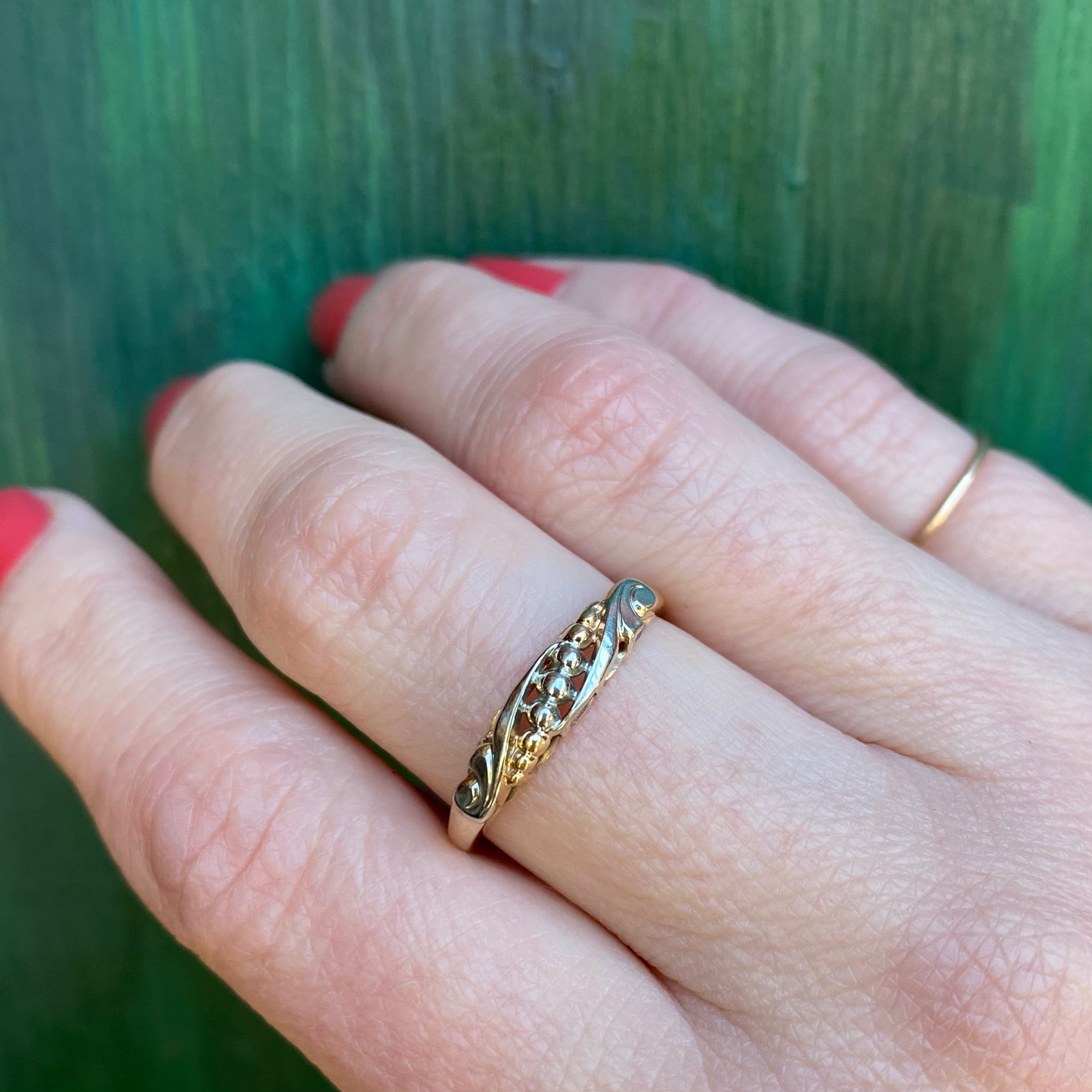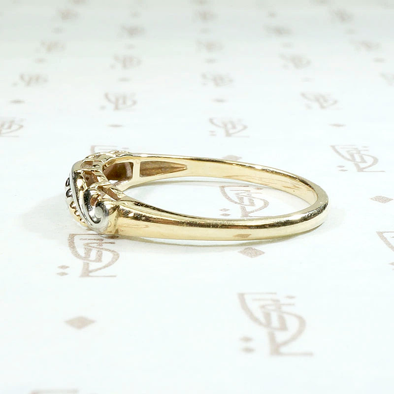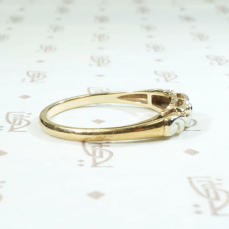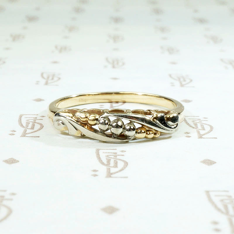 This two tone Midcentury Modern band is amazing, we have never seen another one quite like it. Asymmetric flourishes curl across the top of the ring, framing a sash of graduated balls in both white and yellow gold. The piece is beautifully sculpted and the contrast of the white and yellow gold add richness of the design. This wonderful band is fancy enough to be worn alone but it will look great paired with an engagement ring, too. Circa 1940.