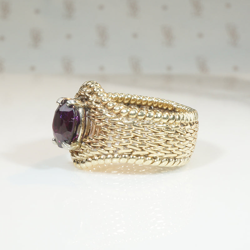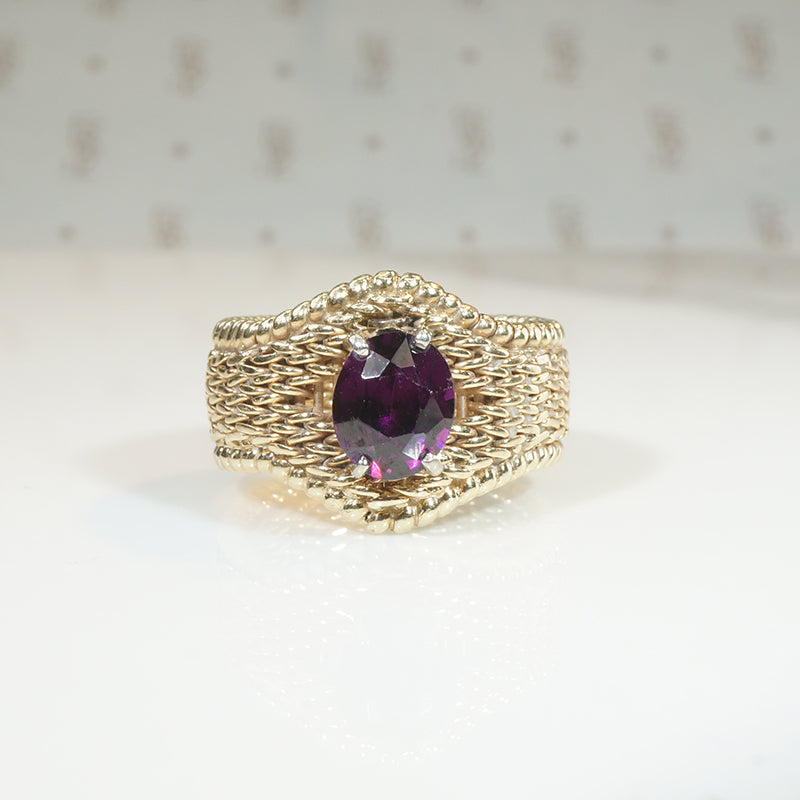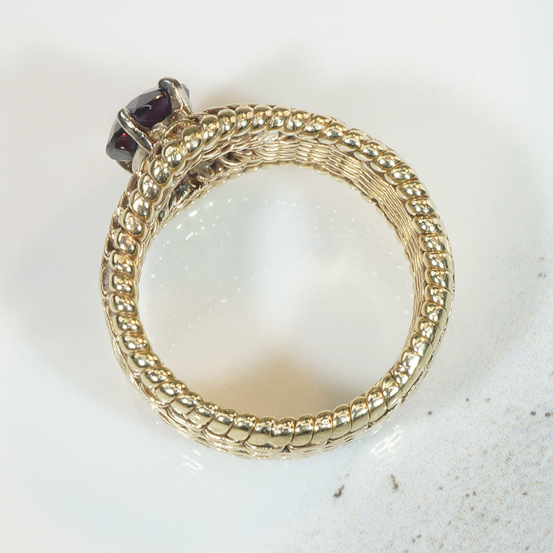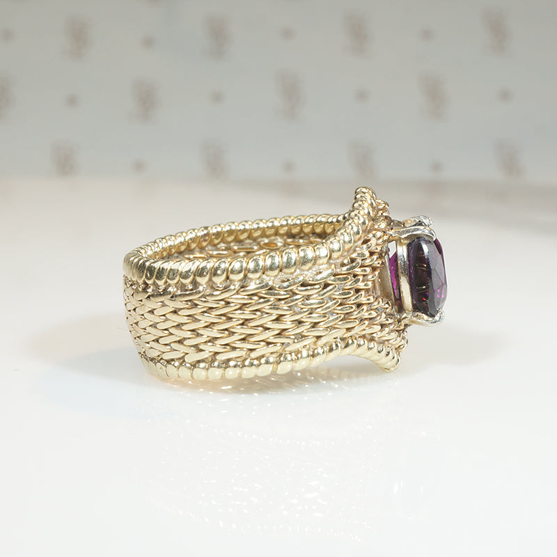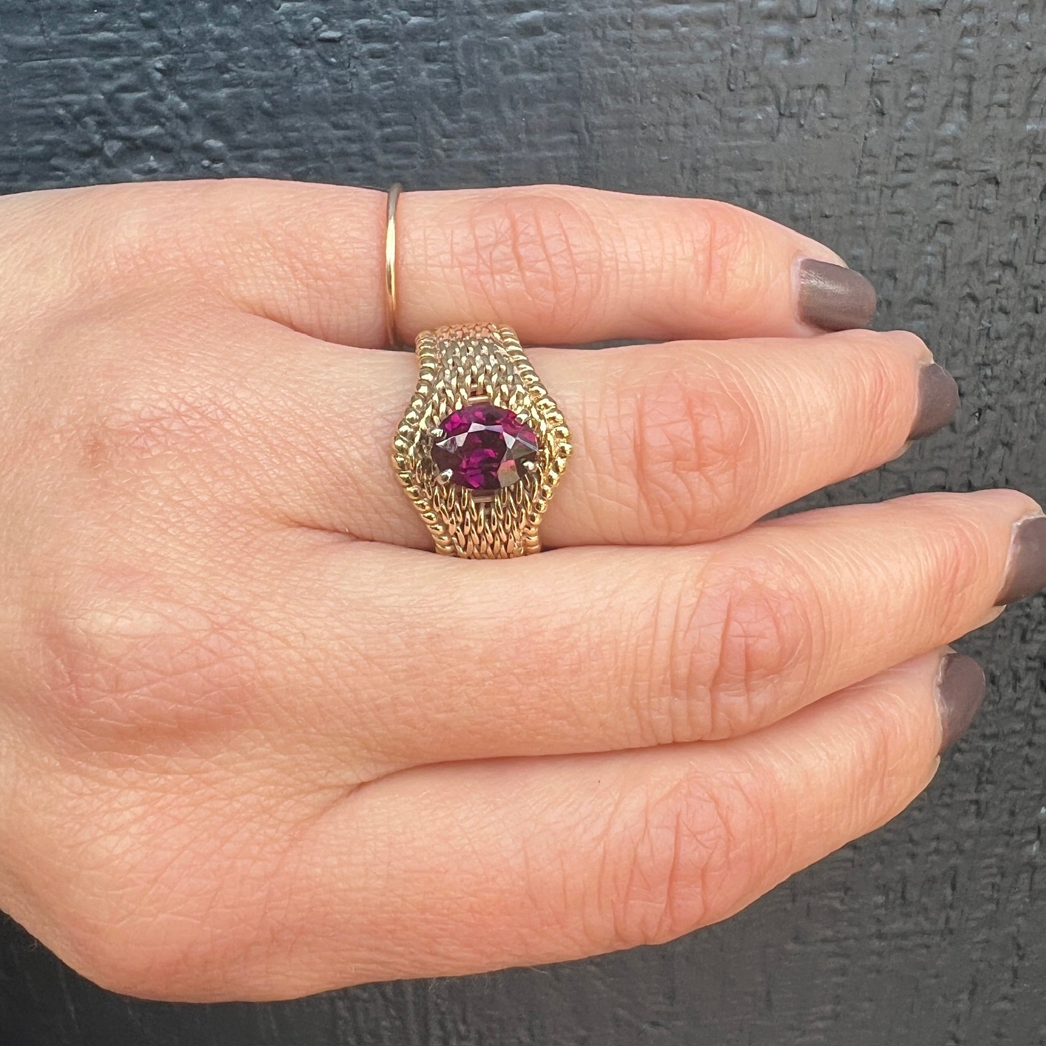 An oval rhodolite garnet sits at the heart of this beautifully crafted ring of 14k gold wire. The rich pinkish-purple garnet nestles in a four-prong head, raised slightly over the ring's wide band. The body of the ring is a tight gold weave, edged in a glossy twist. Artistic, with that irresistible idiosyncratic 1970s aesthetic.