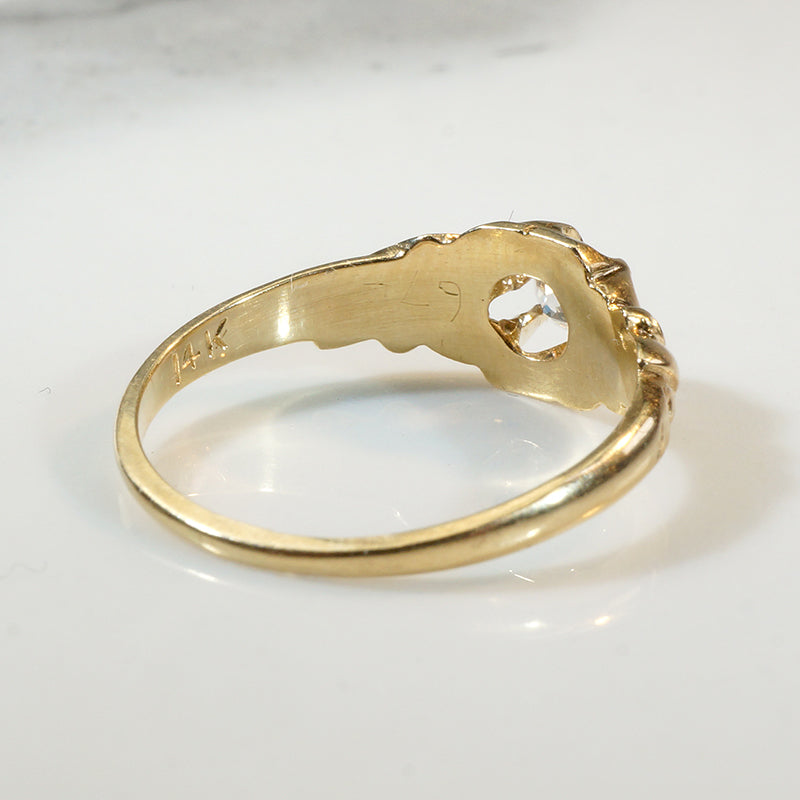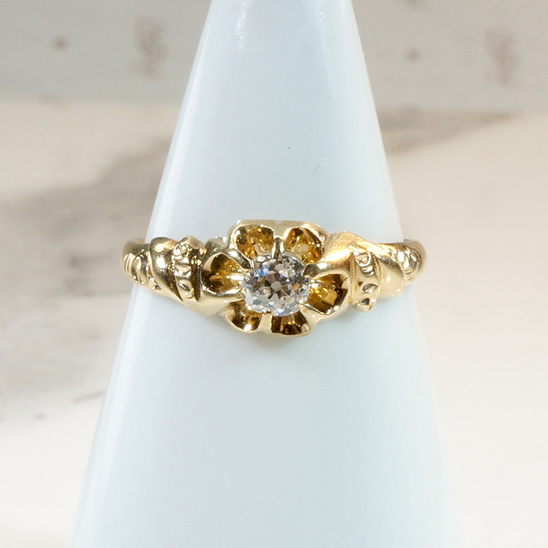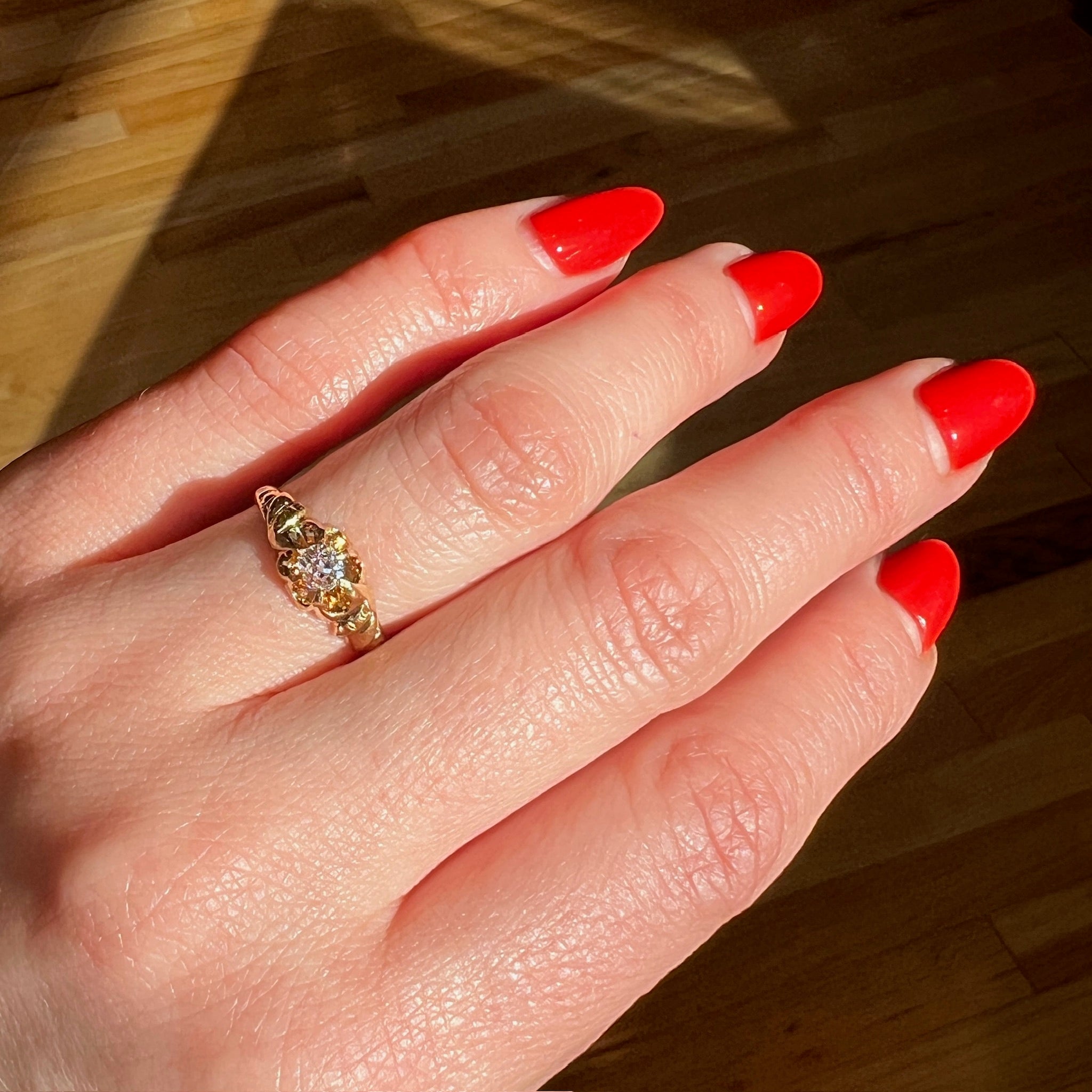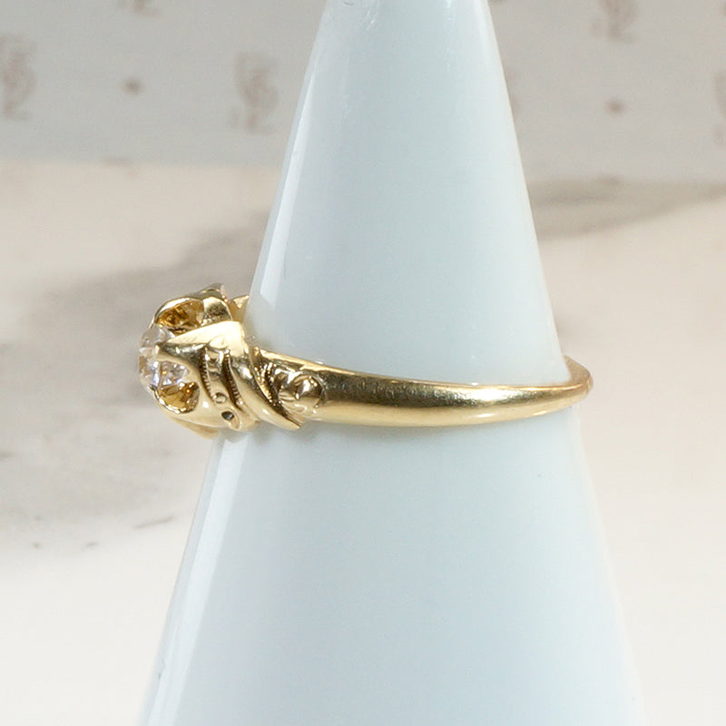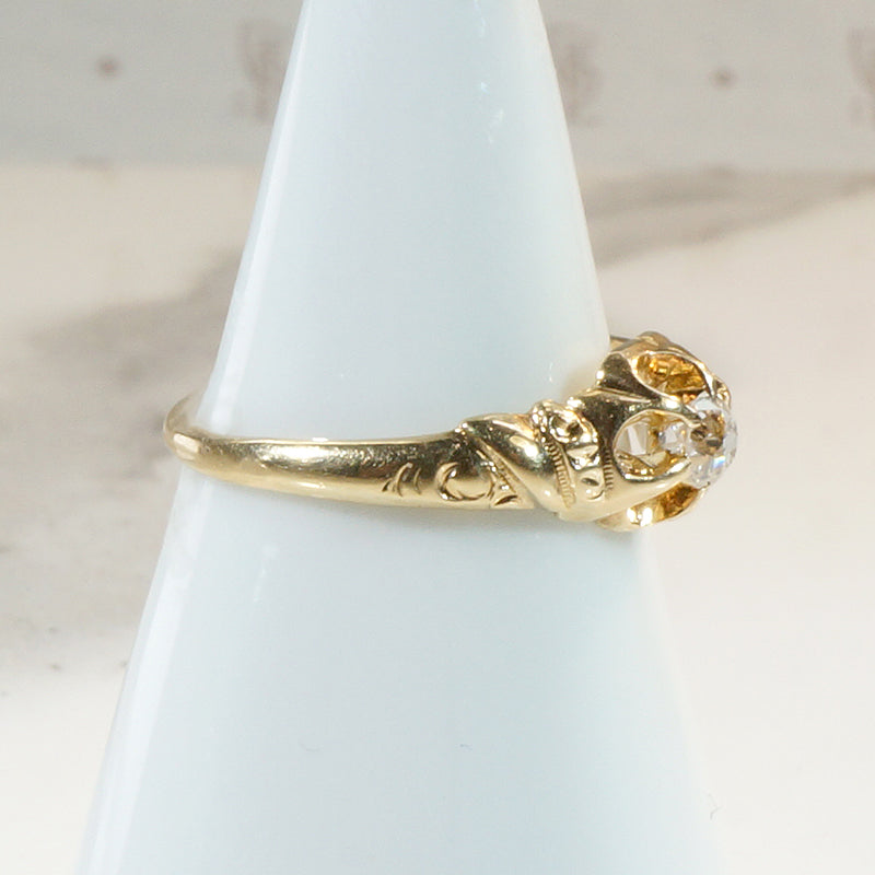 A sweet Victorian diamond belcher ring with a twist. A hypnotic .35ct old mine cut diamond held in a 14k gold setting that has been sculpted into a twist and engraved with a floral pattern. The belcher setting was popular in the late 1800s; the style offers a fluted, petal-like head and a low profile. The sculpted twist and chunky old diamond give this 19th-century engagement ring a little extra romance. Circa 1890.