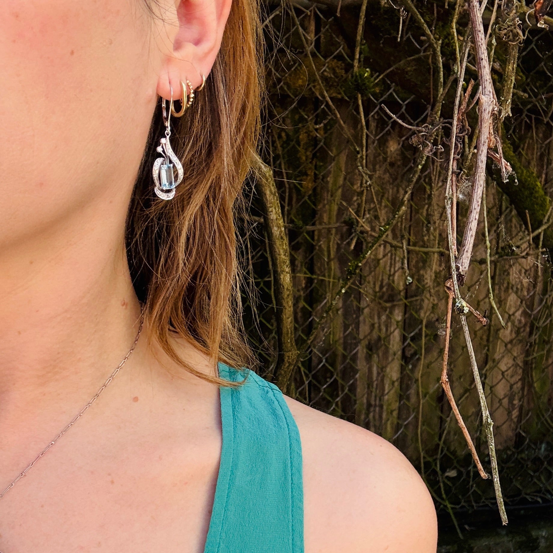 These stunning earrings are set with lovely blue Aquamarines and sparkling diamonds. The curving arcs that hold diamonds and hand engraving give the impression of whimsical flora framing the aquamarines. The earrings are suspended from modern platinum lever back ear-wires. Circa 1905.
