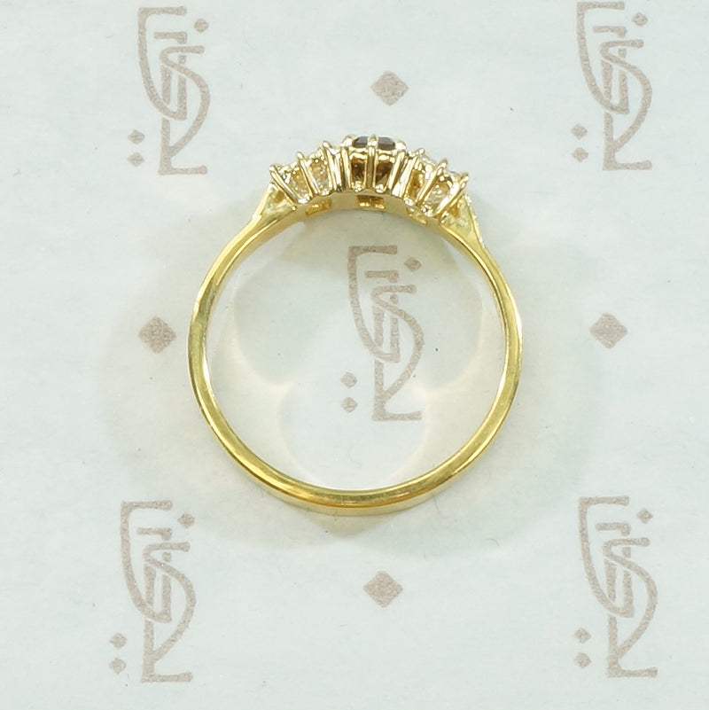 Diamond Details.....The center diamond is a .27ct SI2 Cognac colored diamond circa 1950. The flanking diamonds have a total carat weight of .38 carats and are VS-H. The total weight of this ring is .75 carat.
