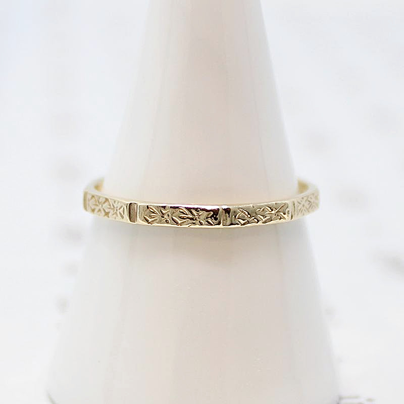 An unusual Art Deco style band cast in recycled 14k yellow gold. The narrow band has a beveled exterior that is engraved with an abstract floral pattern. A very stylish option in a larger size, this ring will make a handsome wedding band.