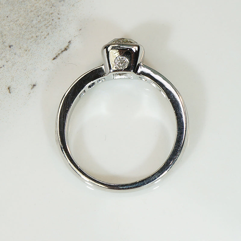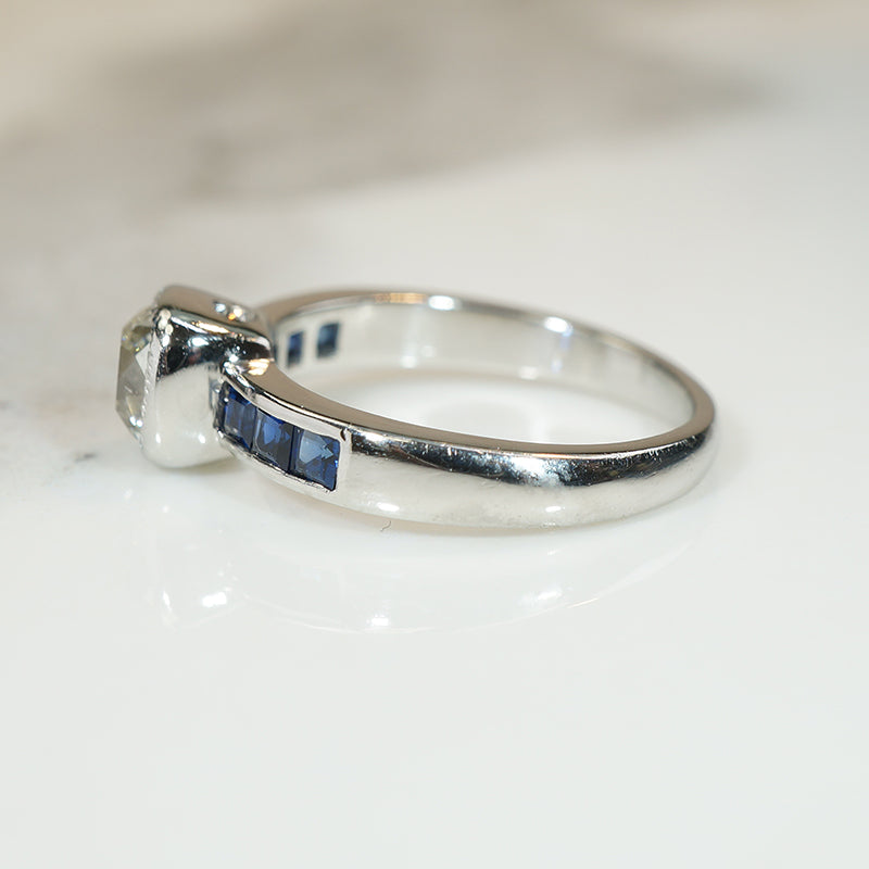 Wonderfully unique this Platinum and Old Mine Cut Diamond Engagement Ring has channel set natural blue sapphires to either side. The wonderfully chunky diamond has a bright white sparkle and a large open culet it is bezel set and on either side a tiny round diamond is set in the bezel. The diamond is late 1800's and the setting mid 20th century.