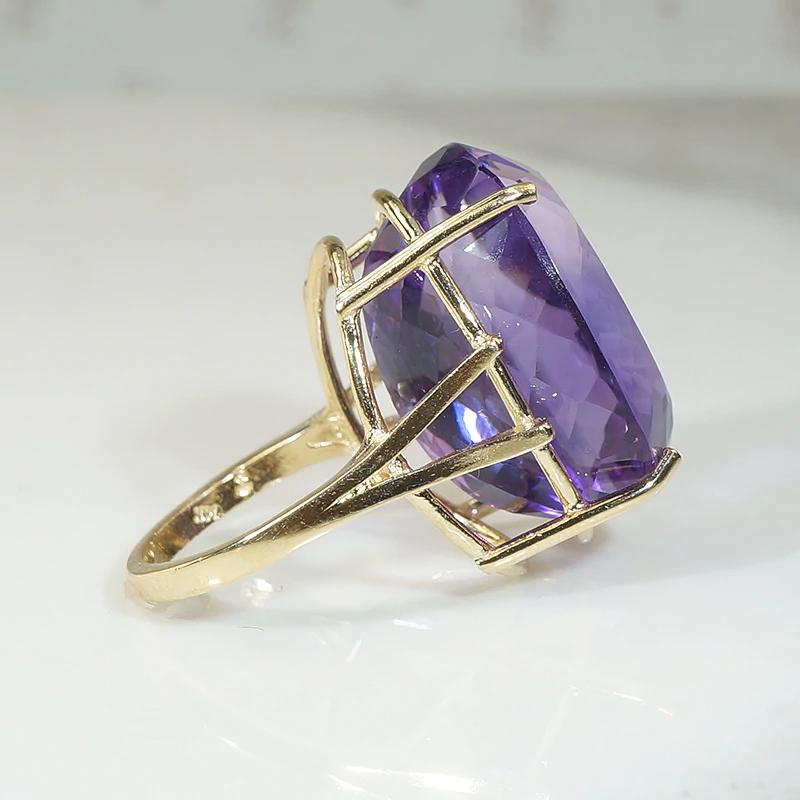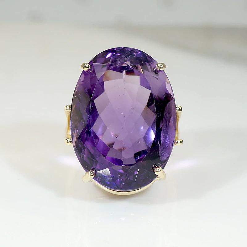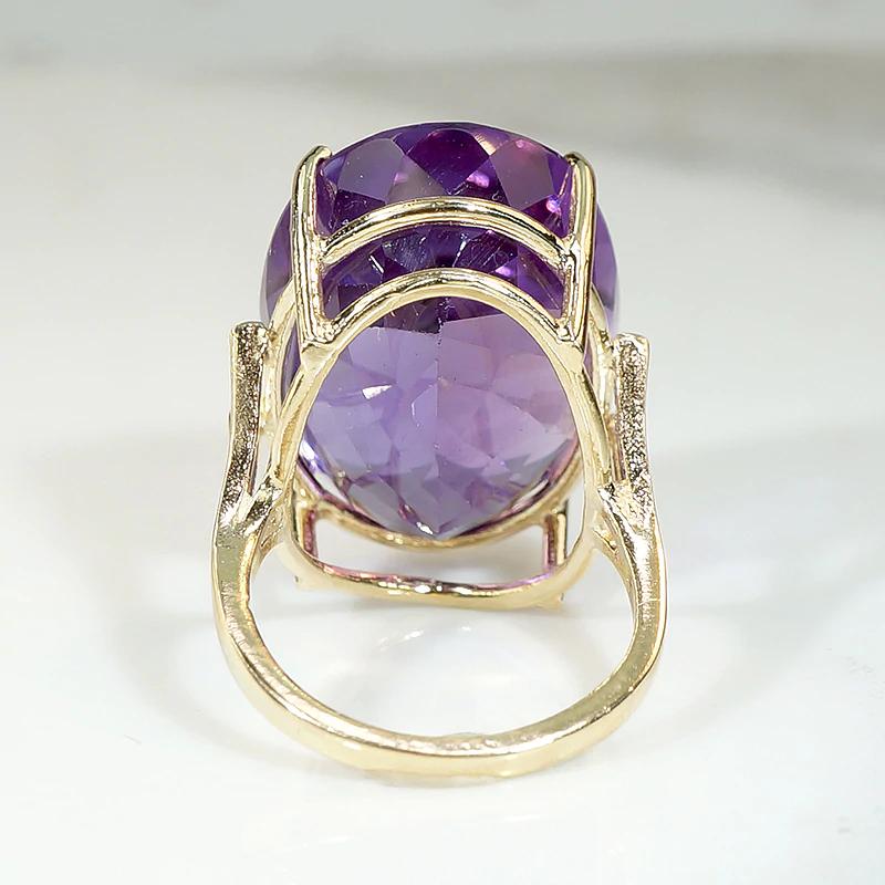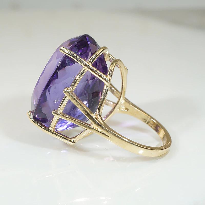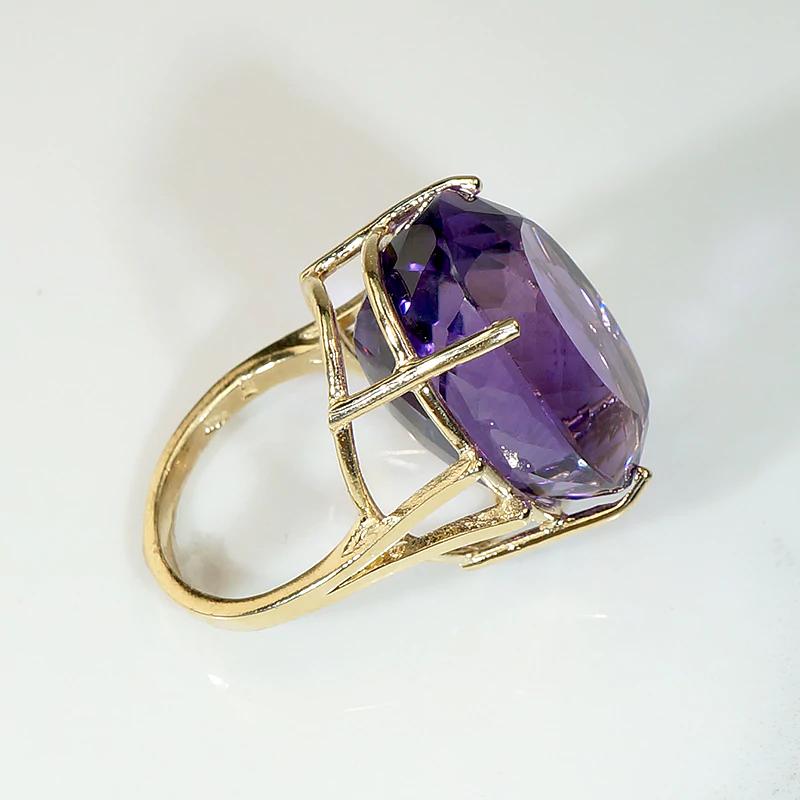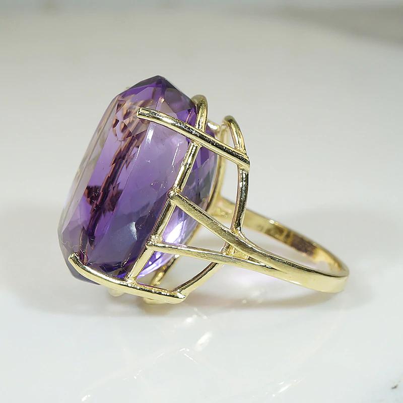 Regal purple amethyst cocktail ring in 14k yellow gold. The big, bold oval cut amethyst is prong set in a light and airy basket, with split shoulder, a curvaceous gallery and a narrow band. This ring has a high profile, perfect for attracting all the attention it deserves. Circa 1960.