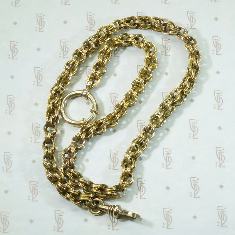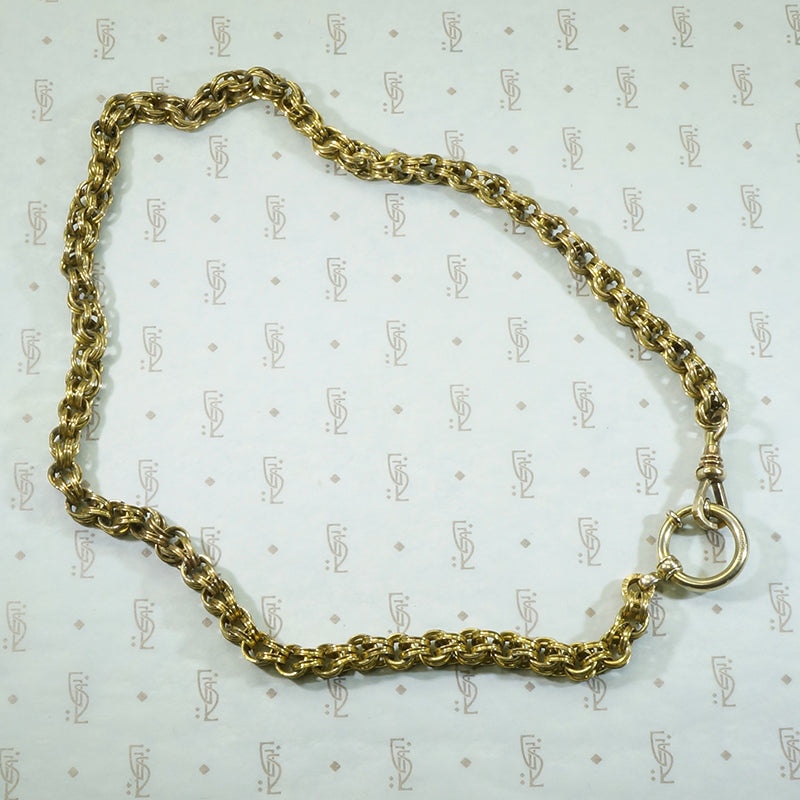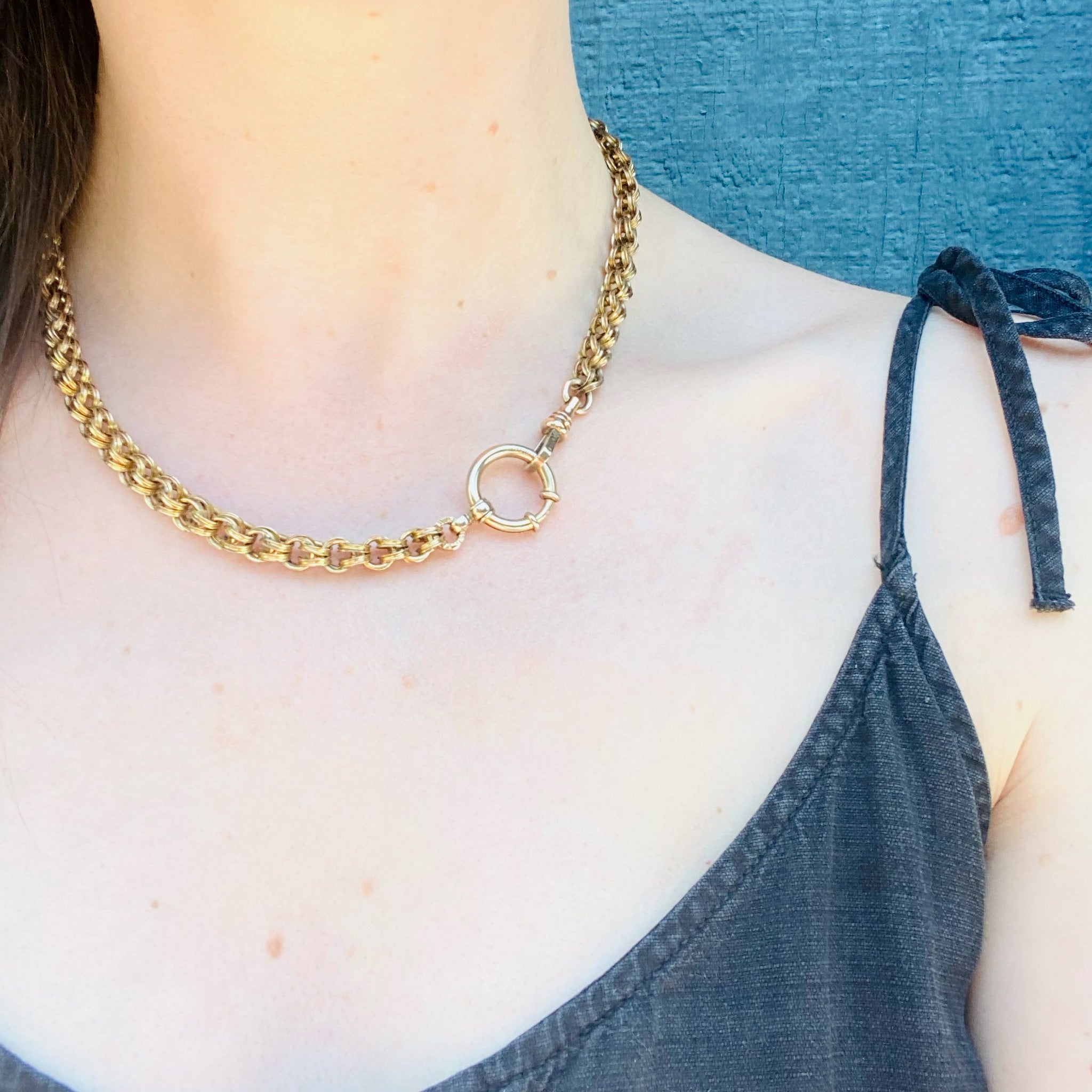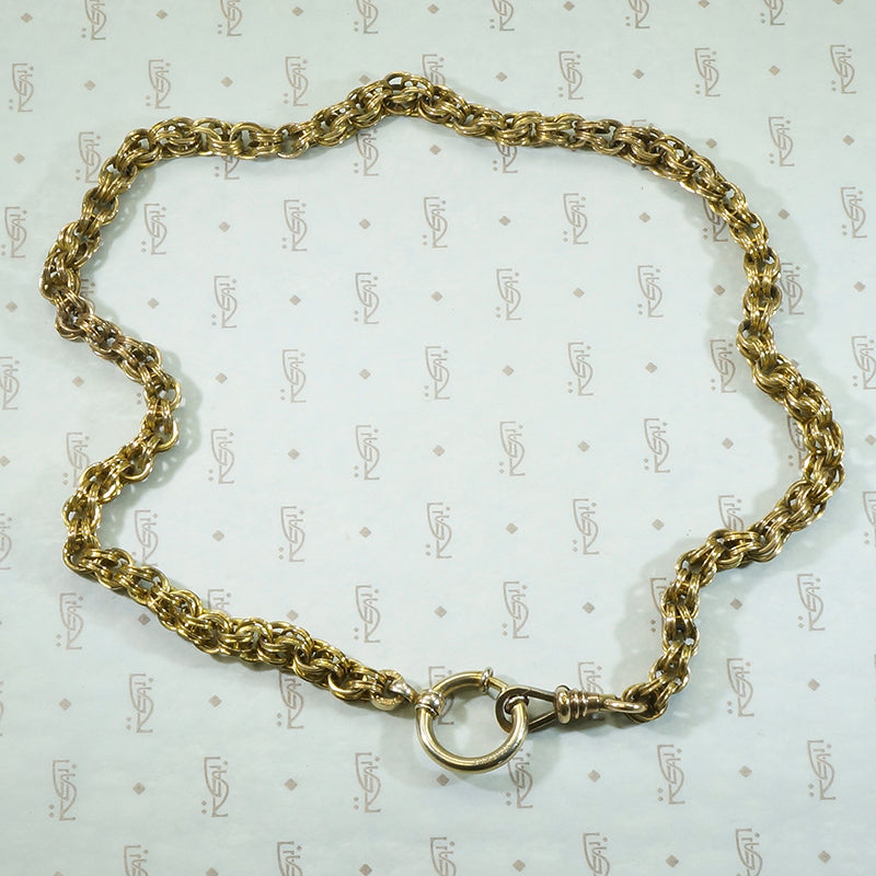 I finally found an Antique bolt ring worthy of this double link fancy chain from the 1800's! The chain is substantial, each link double and carved in a curve, at one end I attached a good sturdy swivel hook and from the other a nice big bolt ring. The bolt ring will hold several bits, bobs, charms and fobs. The perfect foundation piece for your necklace stack. The chain is gold filled circa 1860 and the gold filled findings date from circa 1900.