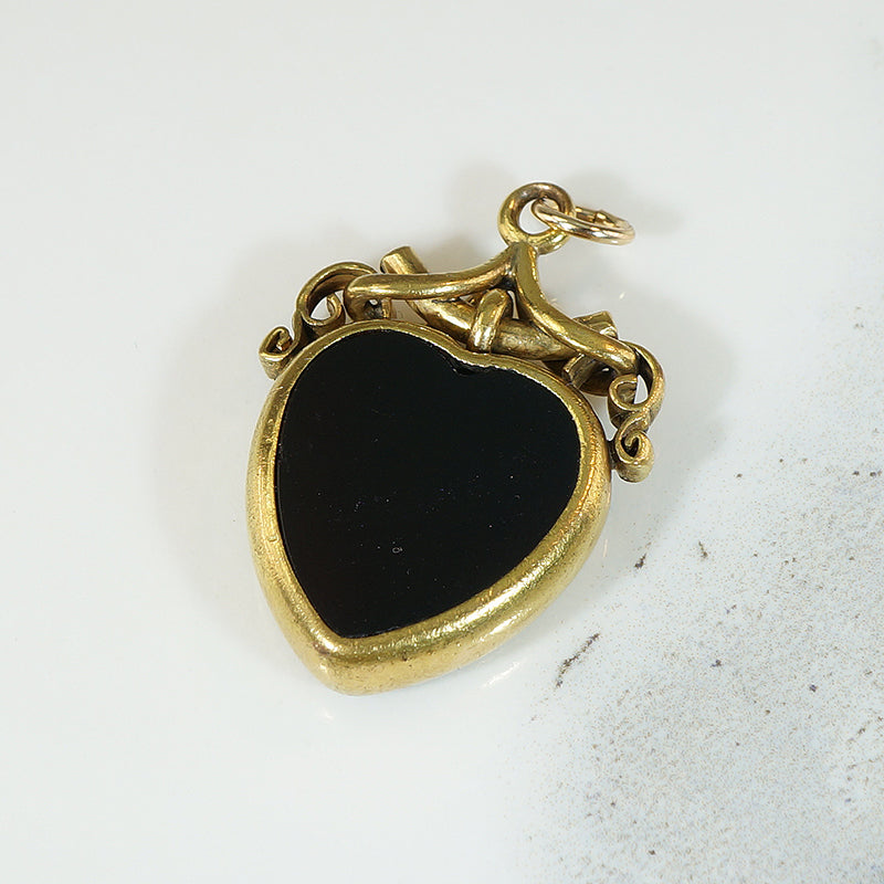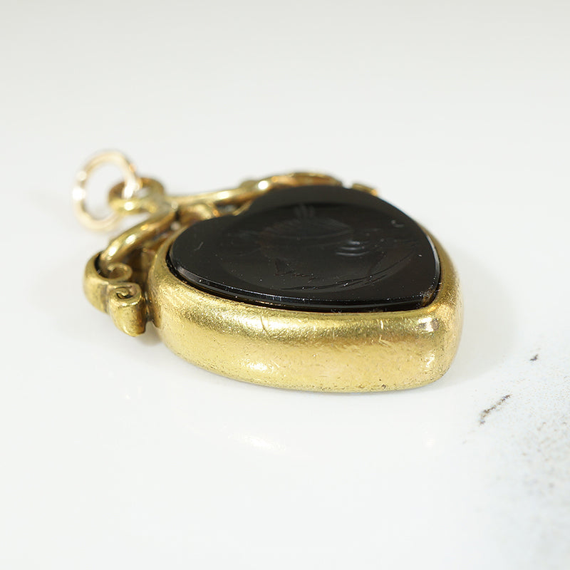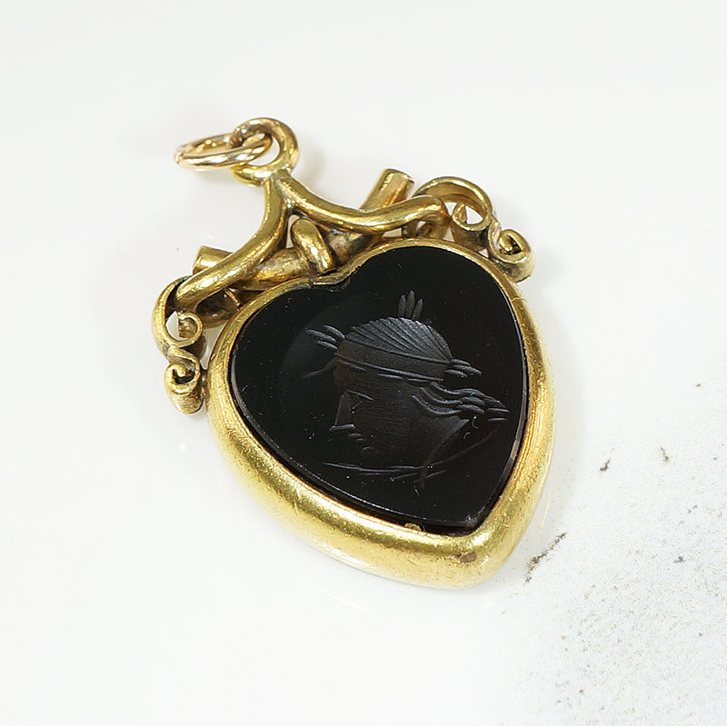 What a delightful love token! A heart-shaped Onyx Intaglio carved with a youthful face is set in this beautifully embellished Gold-Filled Frame. The top of the thick, gold-filled strap is wonderfully elaborate. A half-circle curves up below the bale catching all the luck as it rains down upon your heart. Twists and curls highlight the heart's curves and anchor the bale, which glides up to a steep peak. An attached jump ring allows this heart to be worn in any manner you like. Circa 1880.