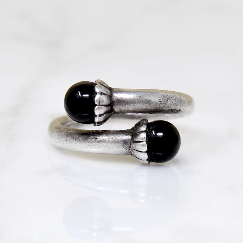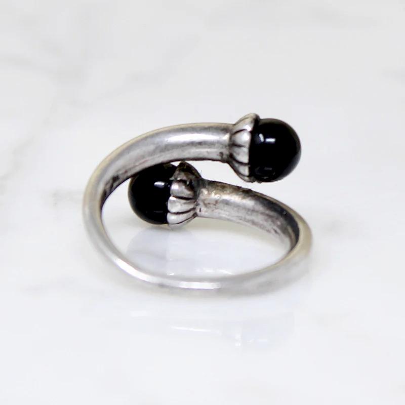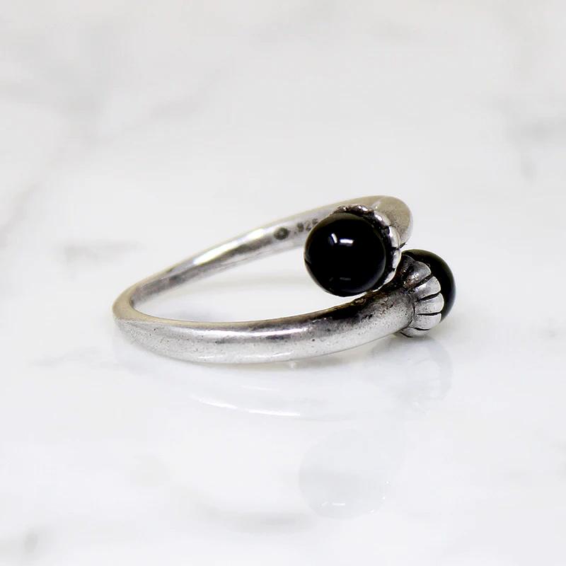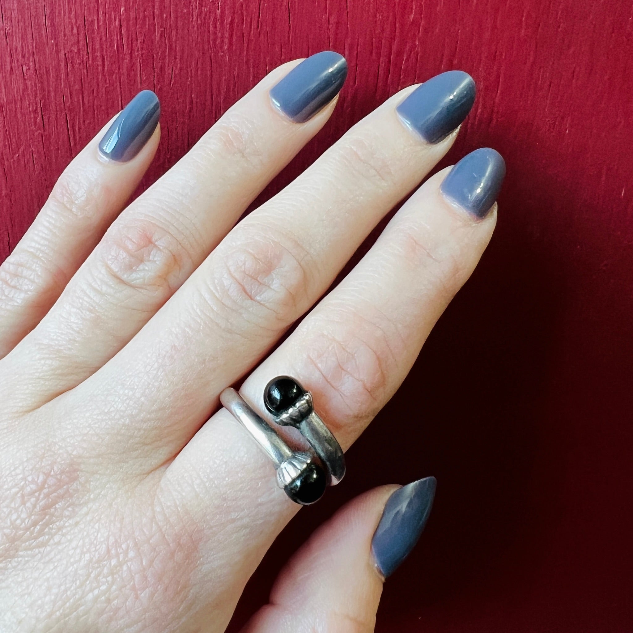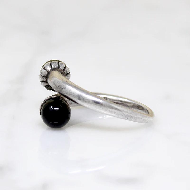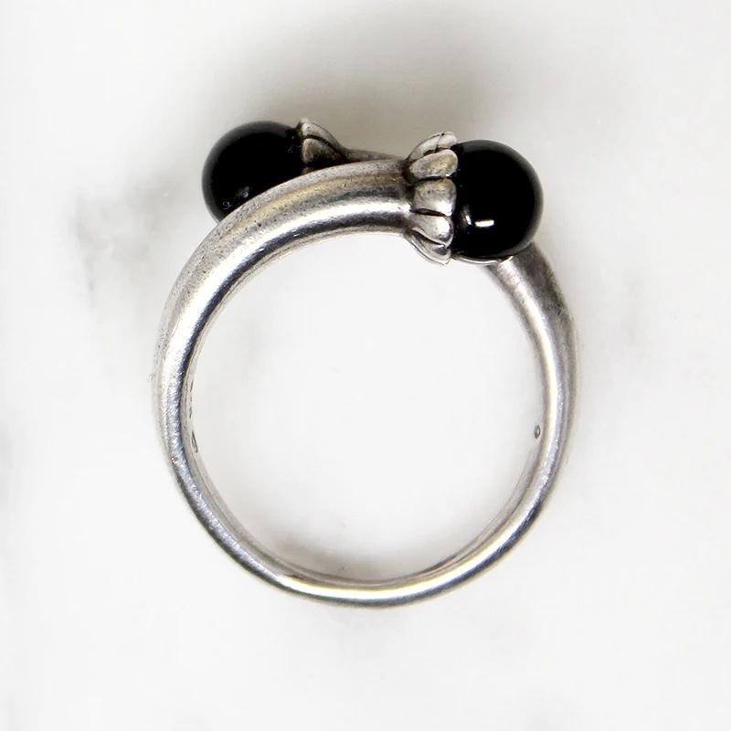A fun vintage bypass ring with a tapered sterling silver band terminating in two onyx balls. The onyx orbs nestle together seated in fluted cups, creating an organic bud-like effect. Sterling and black onyx are the quintessential Rock & Roll combo of this awesome era. Circa 1980.