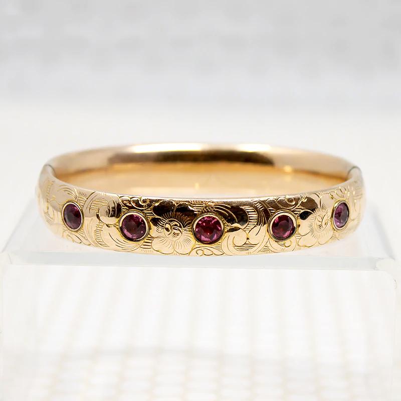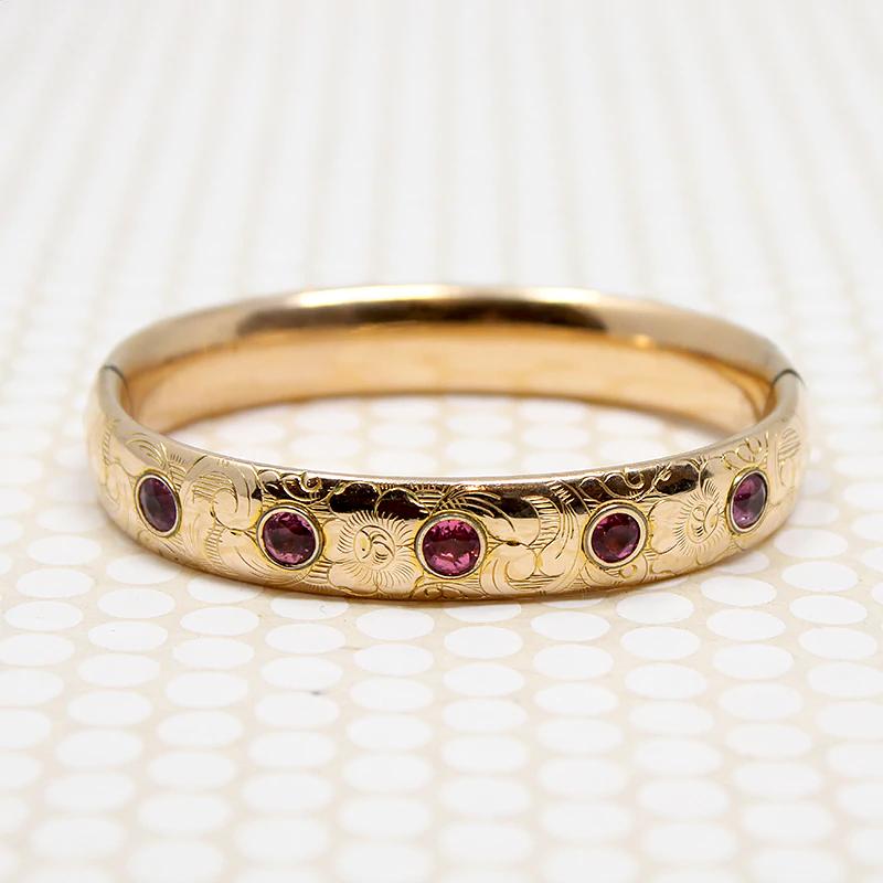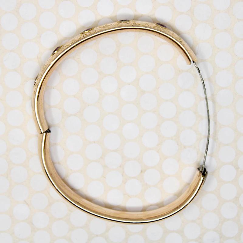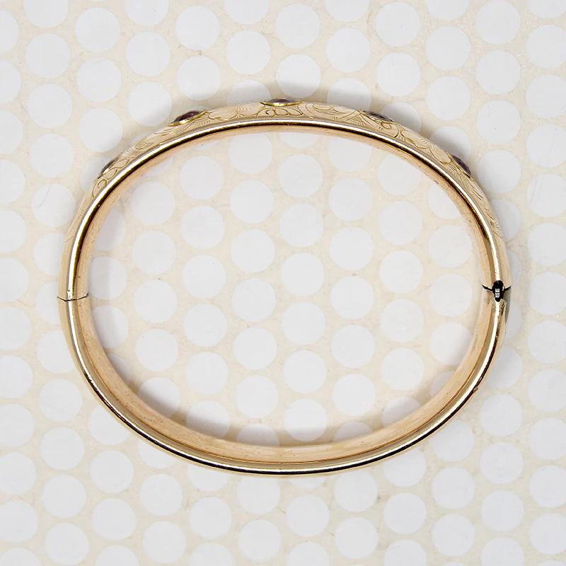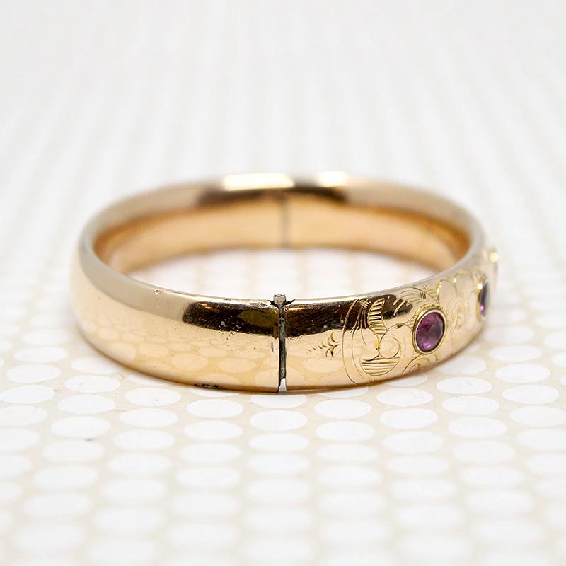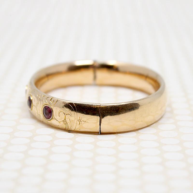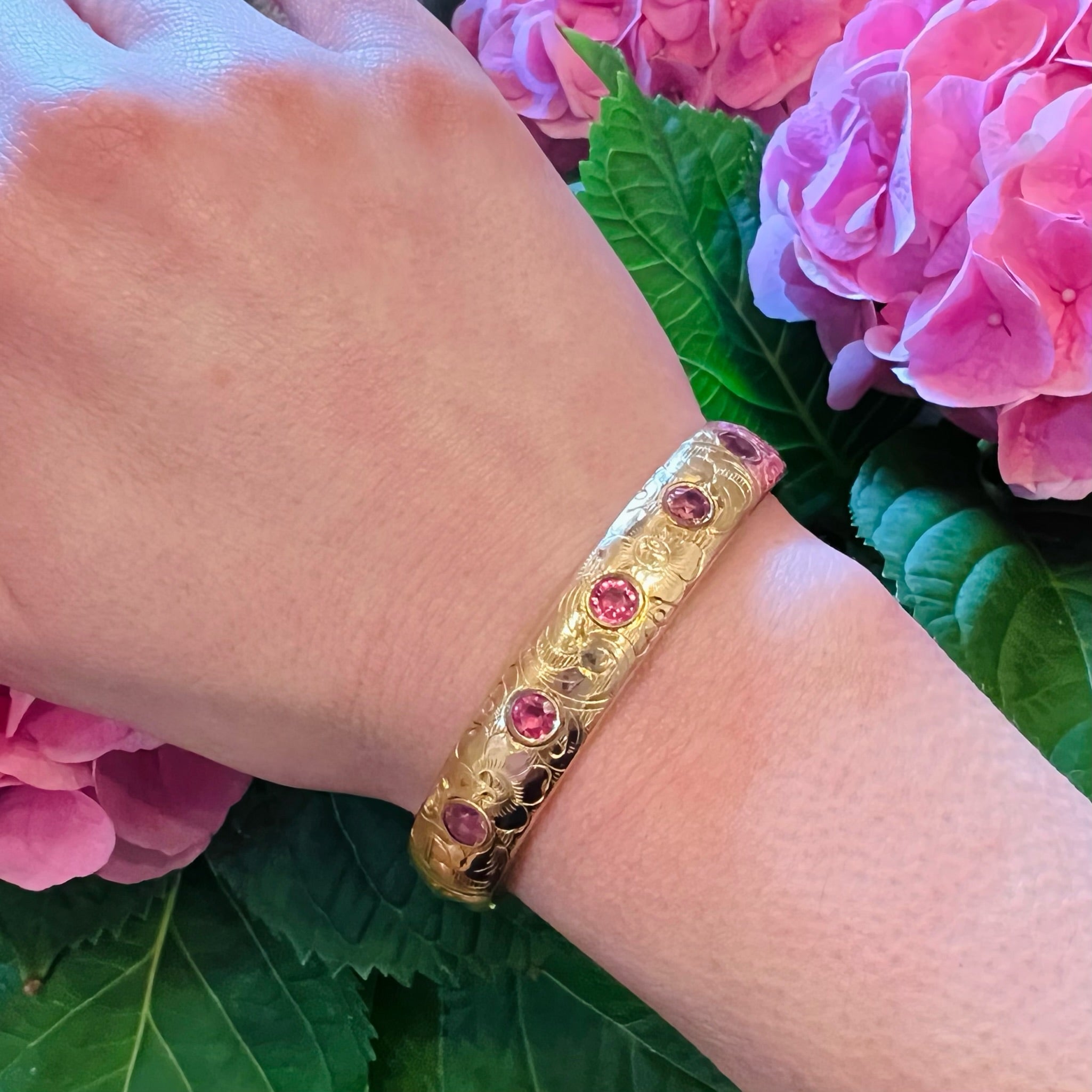 This blushing beauty of a bangle is rosy gold-filled metal, set with vibrant pink paste gems and engraved with flowers. Just lovely. The gold-filled metal is bright and shiny, and the paste sparkles like mad. The bracelet's clasp and hinge are both in very good working order, with a bar for security. A romantic piece that will go with everything. It will look great in your bangle stack, too. Circa 1890.