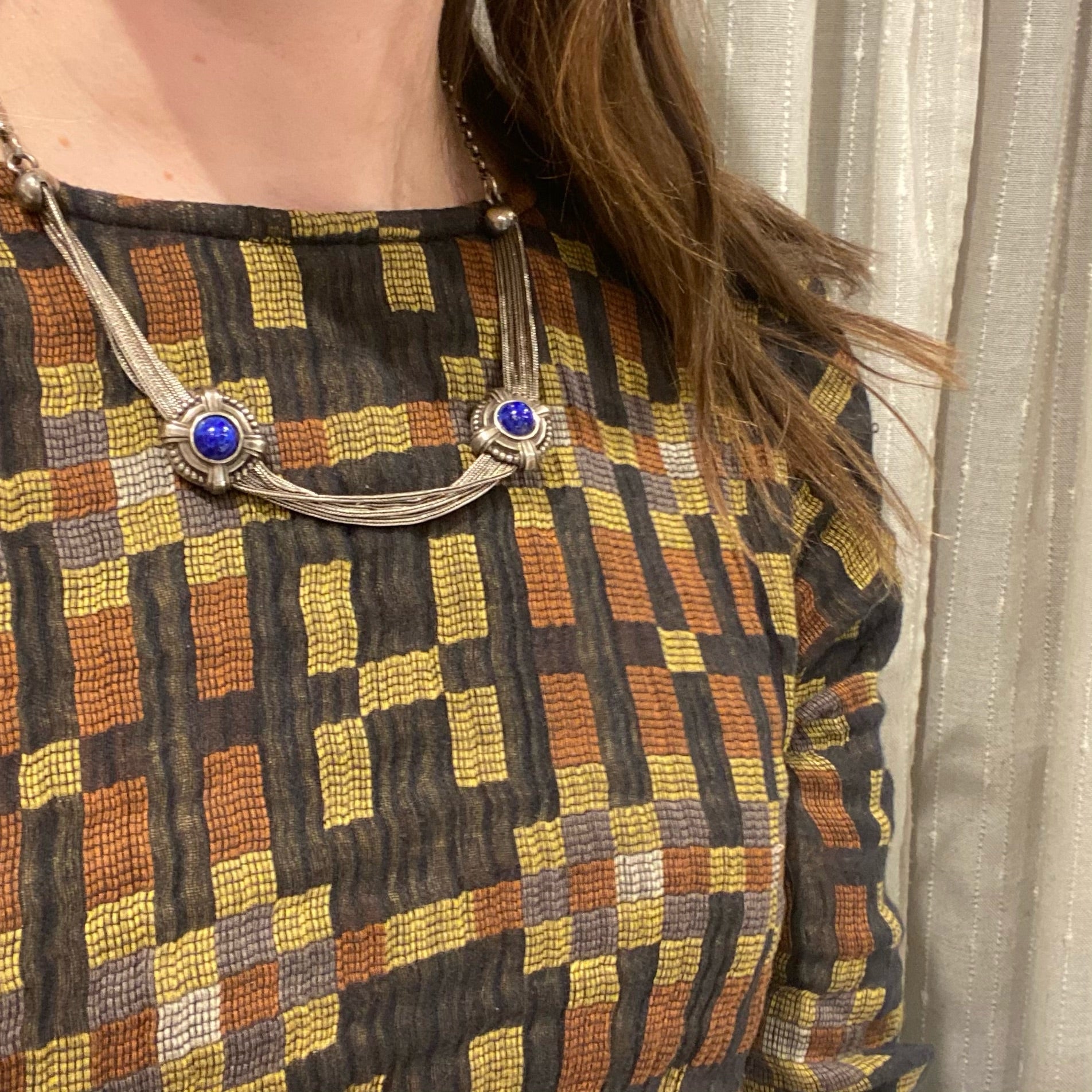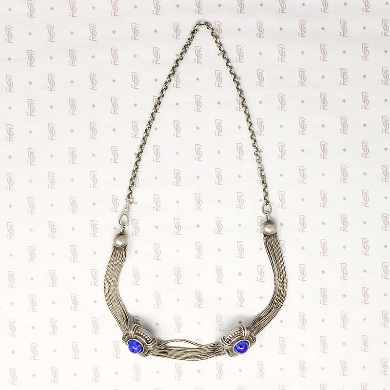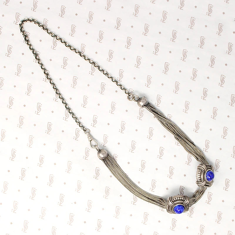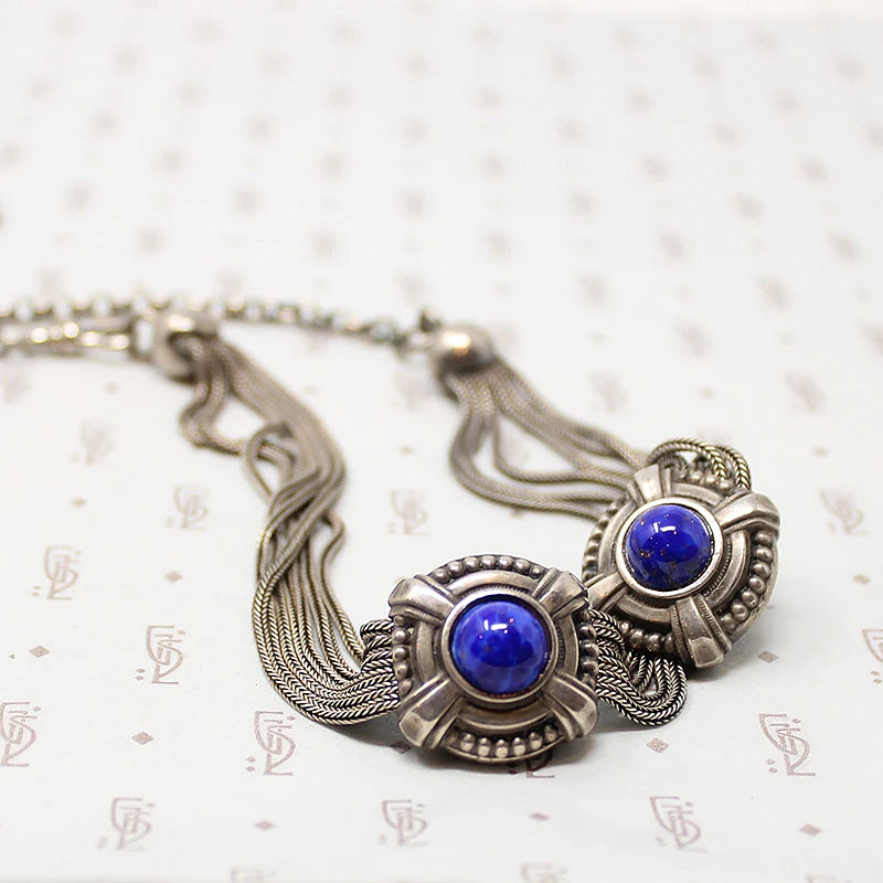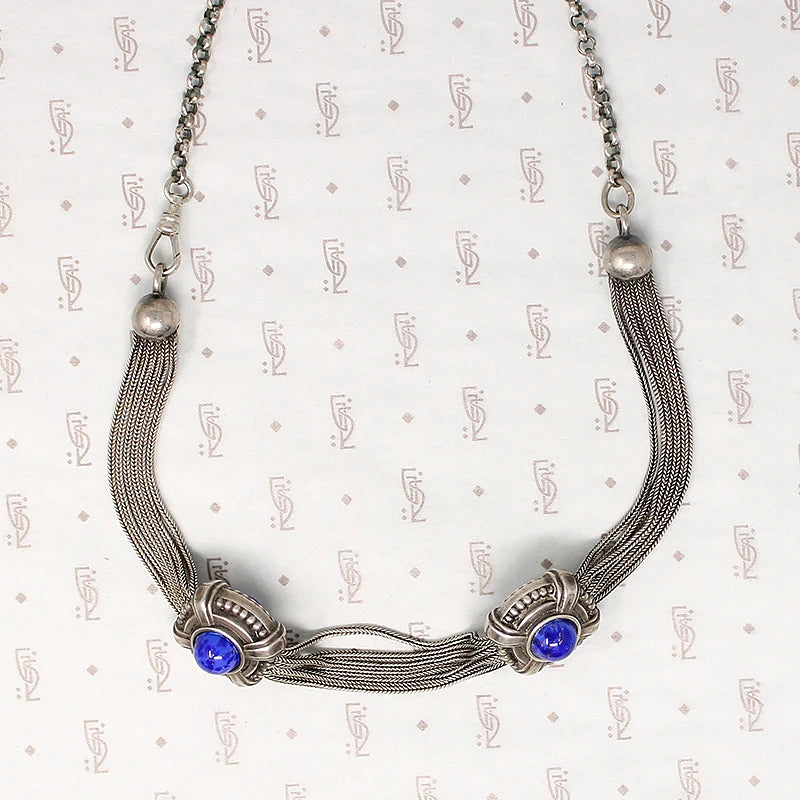 This interesting necklace makes a bold bohemian statement with its bright color and appealing textures. Two ornate sterling silver slides move freely upon a swag of sterling silver foxtail chains. The slides are set on both sides with cabochons of lapis-blue glass. The foxtail chain swag depends from a sterling silver cable chain. The necklace is finished with a silver watch hook that clasps on the side where the two segments of chain meet. Irresistibly tactile and so dramatic.