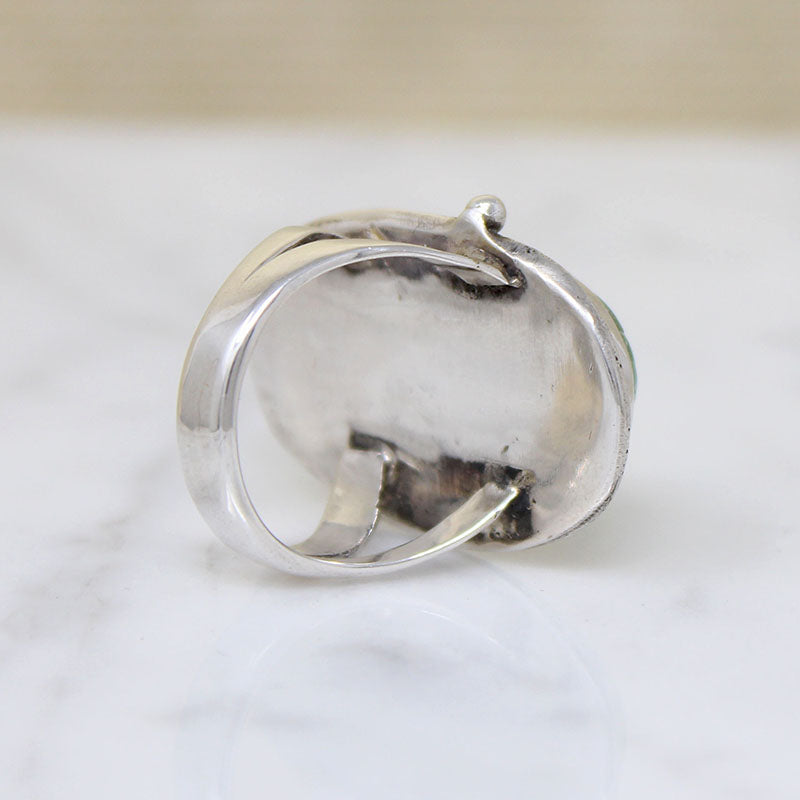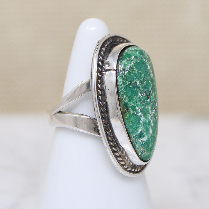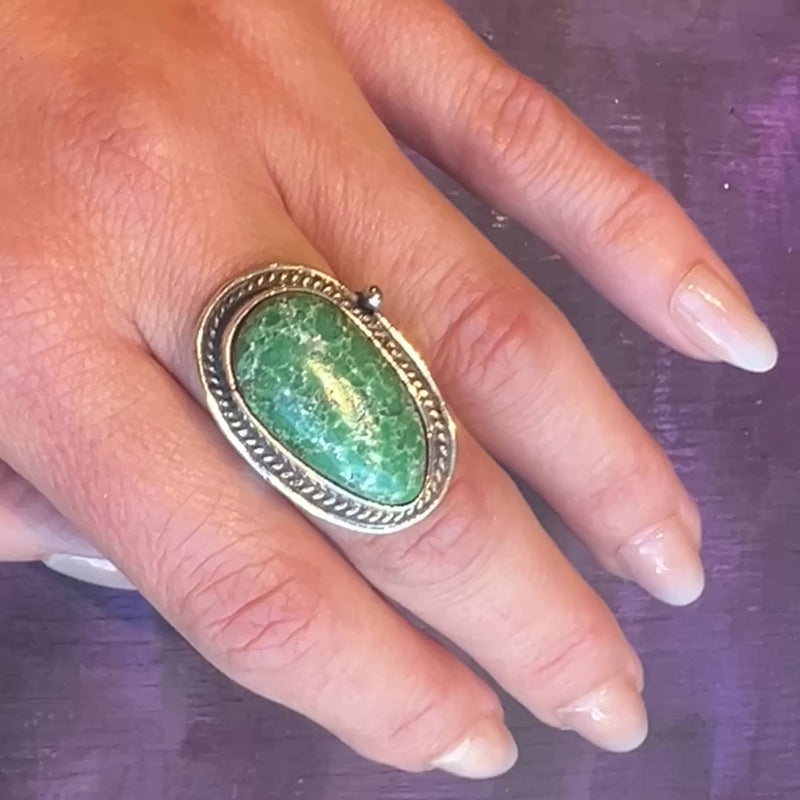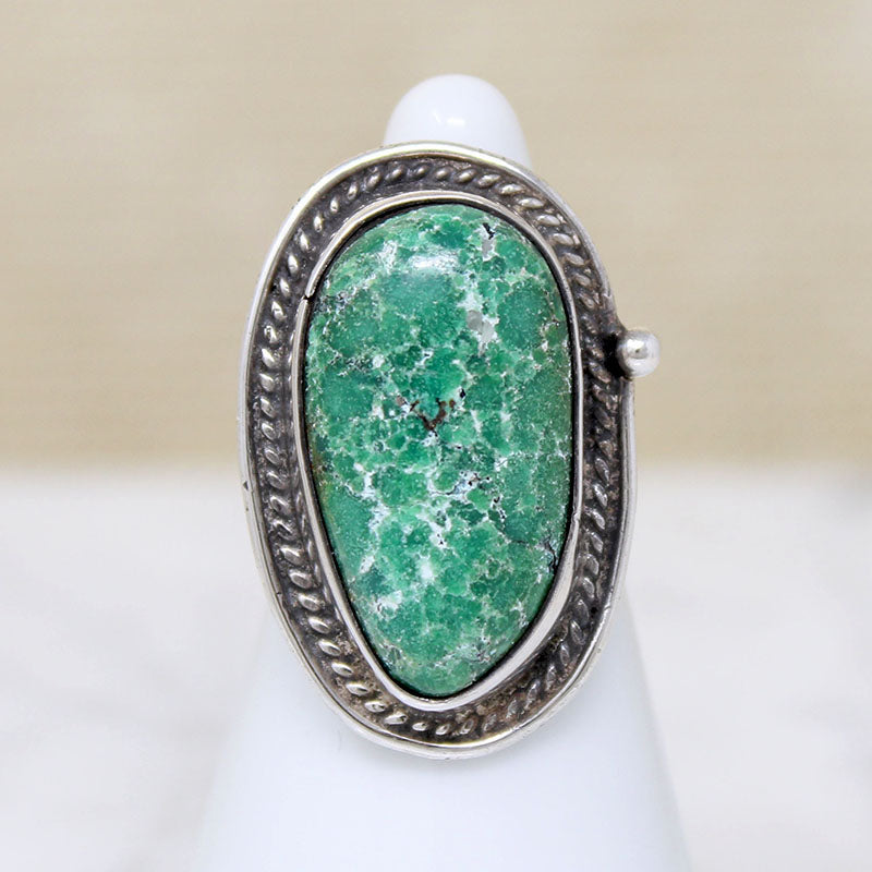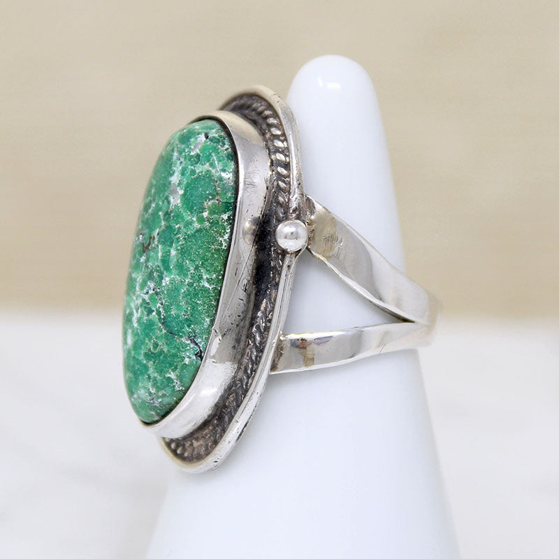 A bold Native American turquoise and sterling silver ring. The turquoise nugget is an incredible shade of green with an unusual crystalline matrix. The stone sits in an irregular oval setting, framed in twisted silver wire. A single, jaunty silver bead accents the top of the ring. Split shoulders taper into a flat band. Circa 1970.