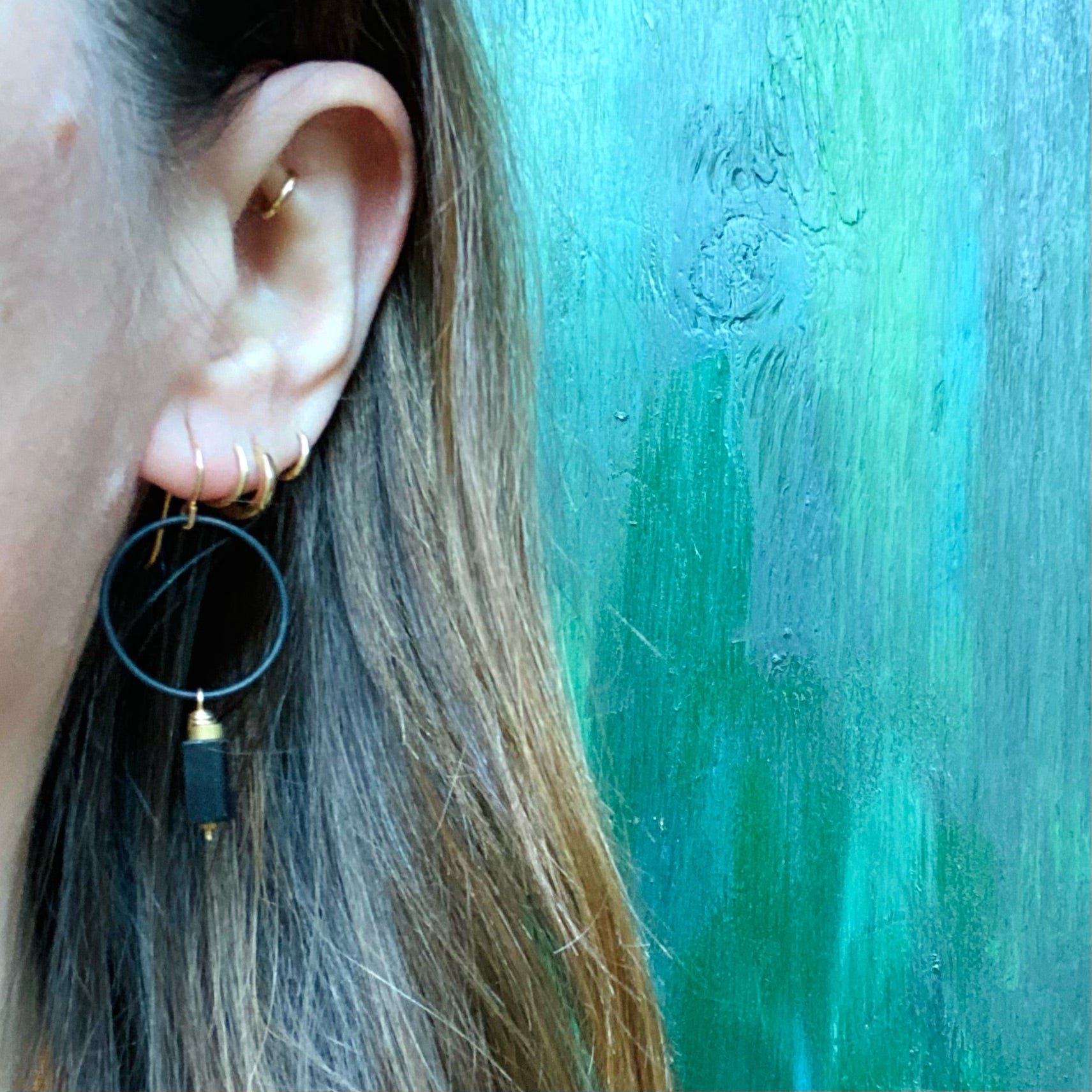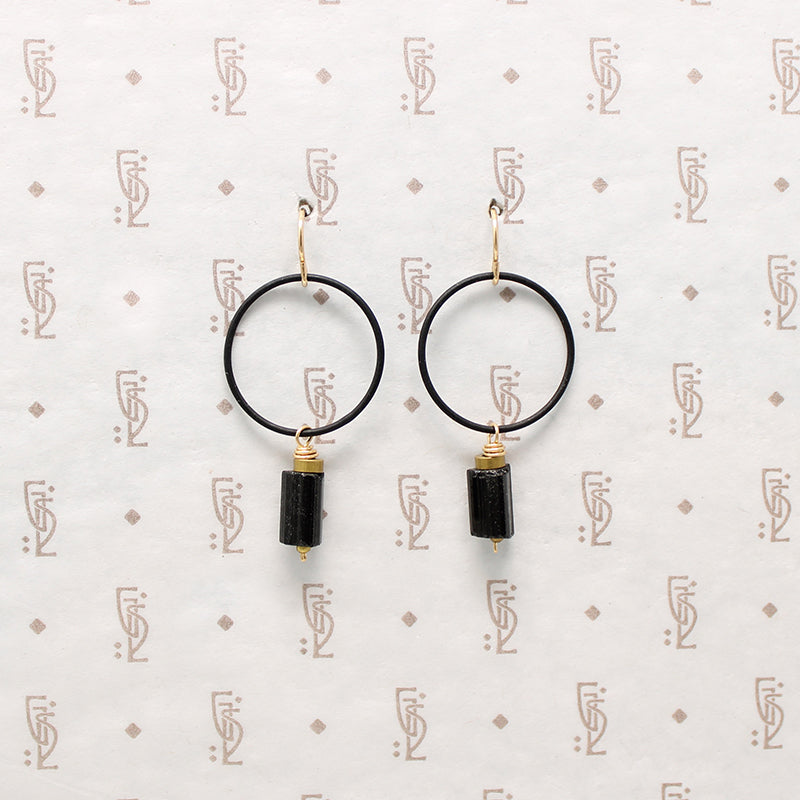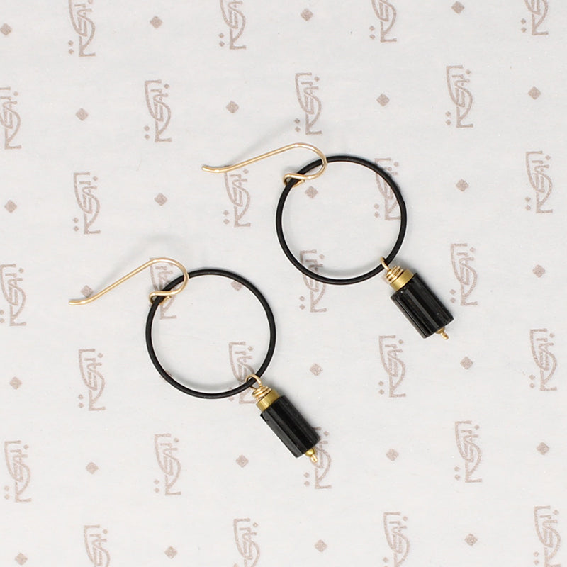 These sophisticated artisan earrings have an elegant appeal. Pillars of black tourmaline hang from blackened brass rings and are accented by golden brass beads. Black and brass are a classic pairing, and black tourmaline has the property of absorbing negative energy. These earrings will become a new favorite. The French ear wires are gold filled.
