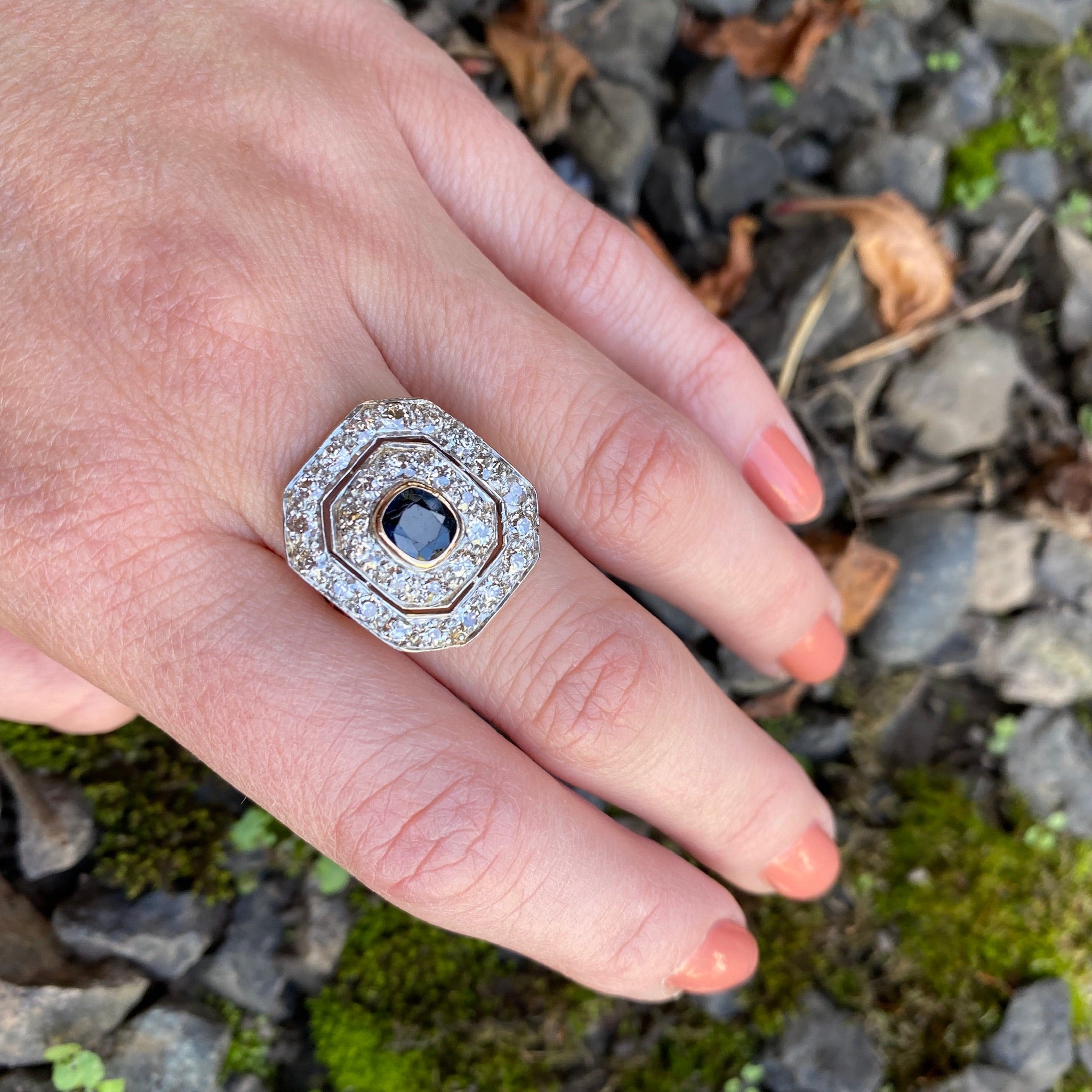 Gem Details.....The central gem is a 1 ct cushion cut natural blue sapphire. There are 28 old European cut diamonds surrounding the sapphire with a total carat weight of 2.01. The diamonds are VS/I clarity and K/L color.