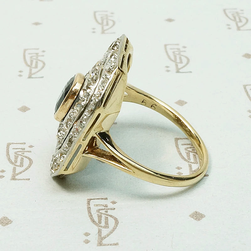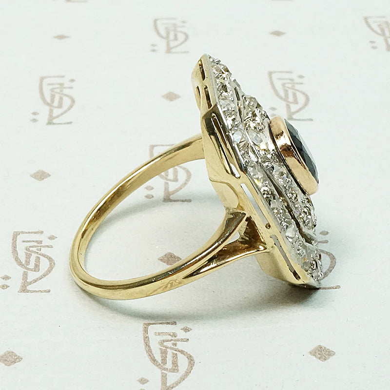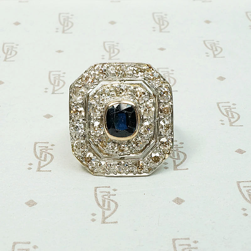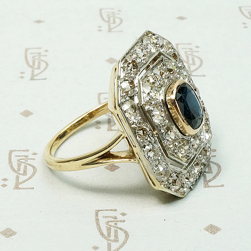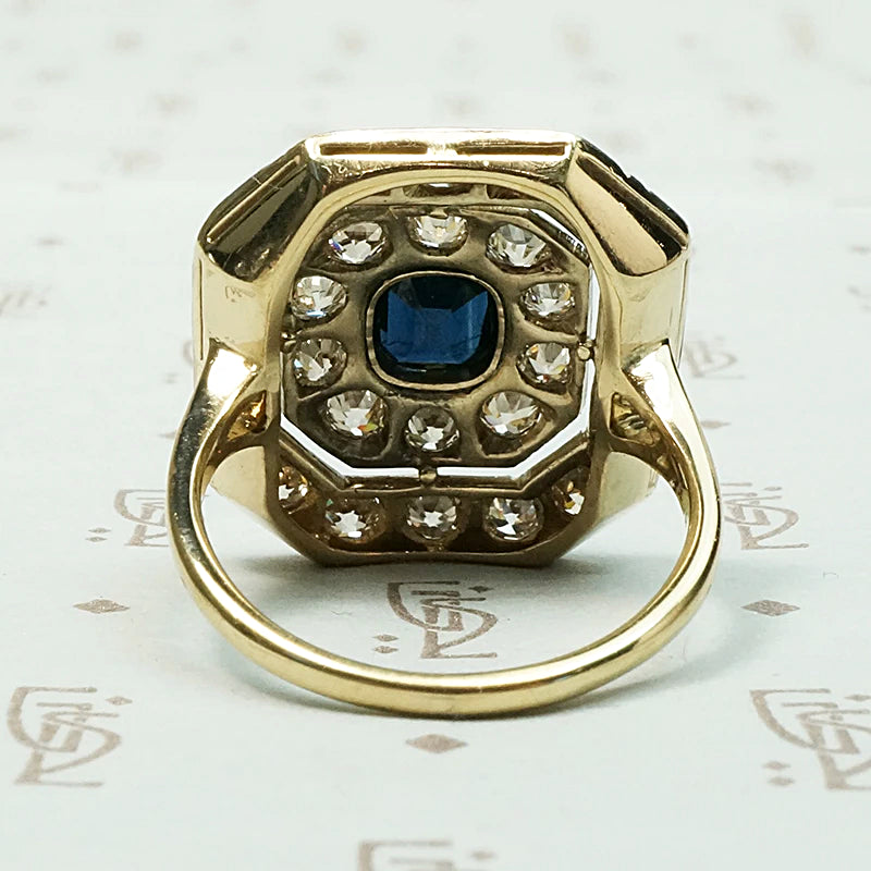 A dark blue cushion cut sapphire sits at the center of a double halo of fabulous glittering diamonds. The diamonds are bead set in an elongated octagon platinum top, classically Art Deco in its forms. The sapphire nestles in a raised yellow gold bezel. The platinum top sits over a 14k yellow gold split-shoulder ring with lovely ajouring. This mixed metal construction technique is so luxurious and versatile, too. The inside of the ring's shank is stamped "56," which is interpreted as a Russian mark for 14k gold. A breathtaking example of early 20th Century glamour. Circa 1910-20.