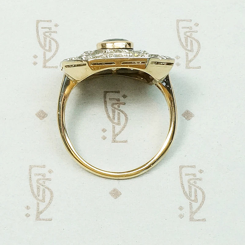 Details.....The ring is currently a size 6.5. We will size it up or down two sizes, free of charge. Please contact us if you need this ring sized more than two sizes, it may be possible for a small fee. The gem set top measures 20.9mm by 19.1mm and the band is 1.6mm wide. In Very Good Antique condition. You should always expect some wear on vintage and antique jewels, we consider it part of their charm.