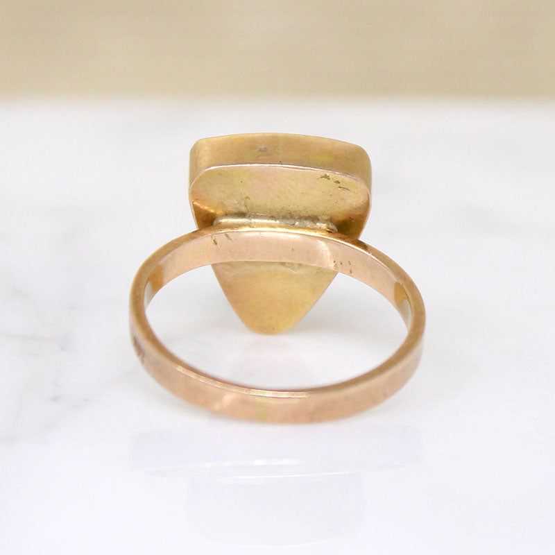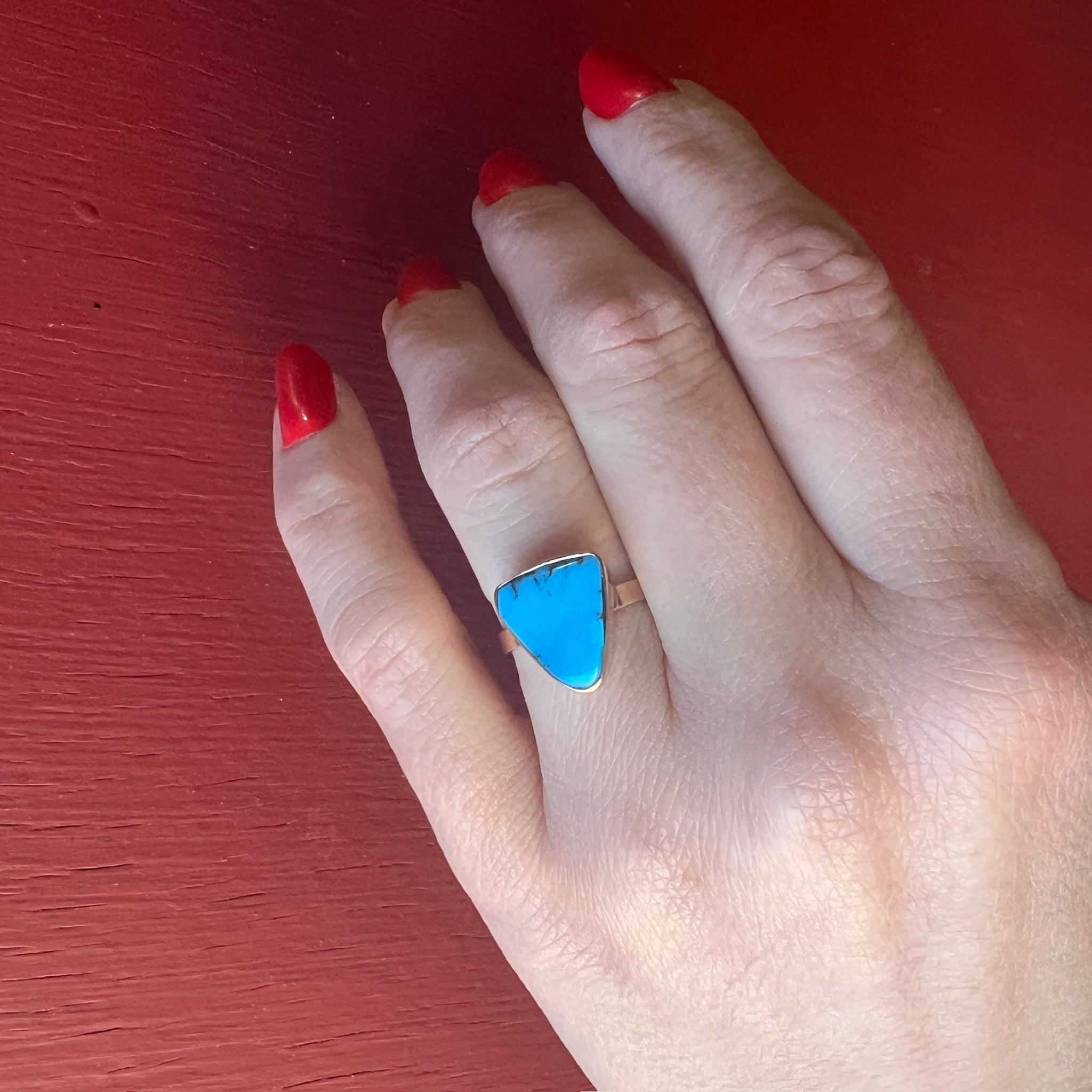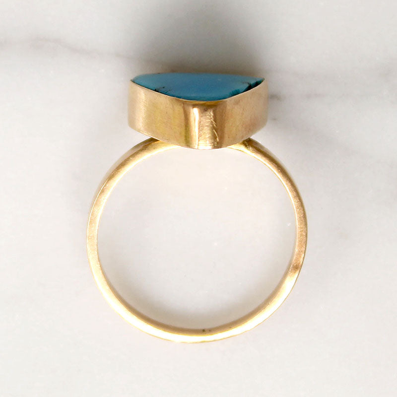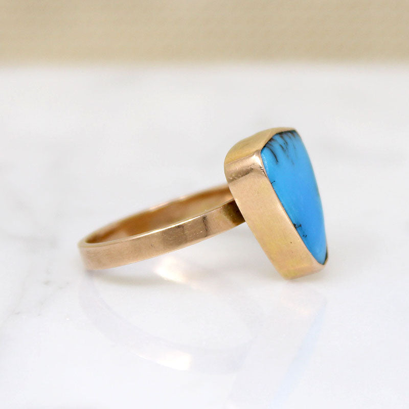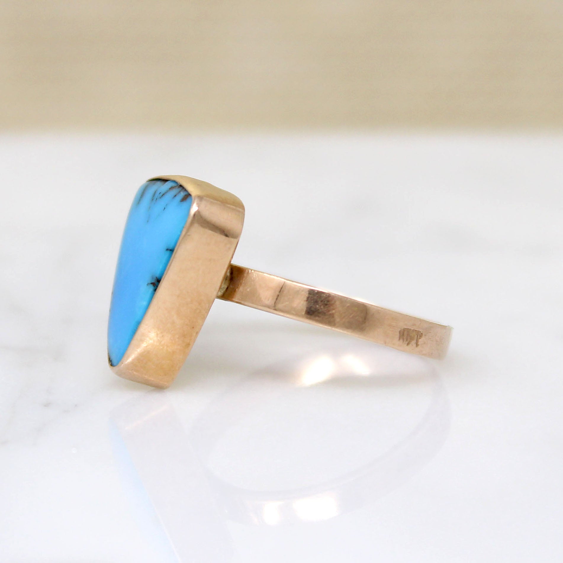 A triangular turquoise with a brilliant blue color is displayed in a plain 14k gold ring. The stunning stone sits in a raised gold collar atop a flat gold band. Hints of black matrix fringe the turquoise's edge. Sublimely simple, all the better to display the intense color of the turquoise. The exterior of the band is marked "14k." Circa 1970.
