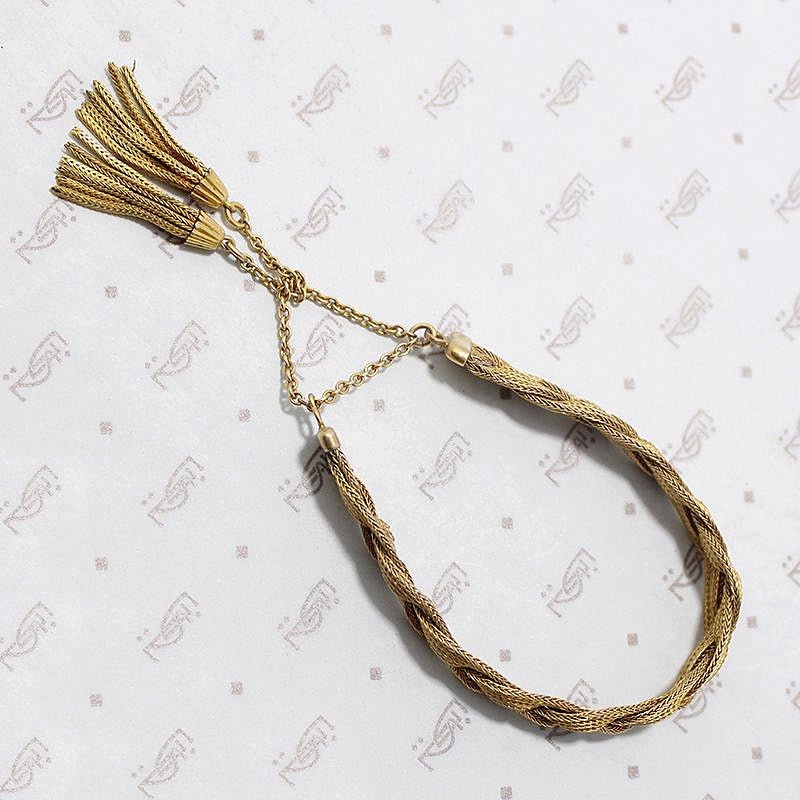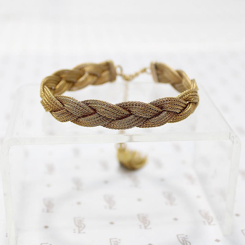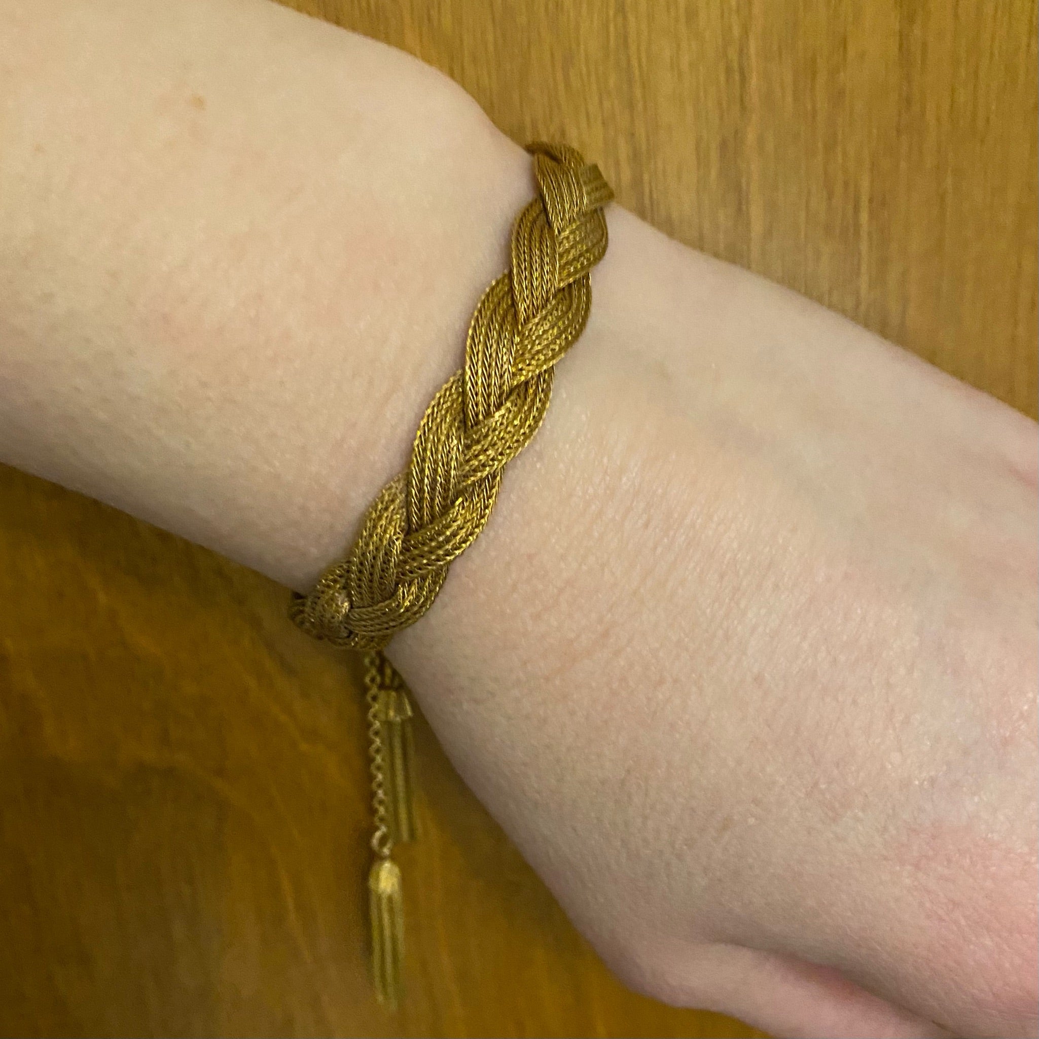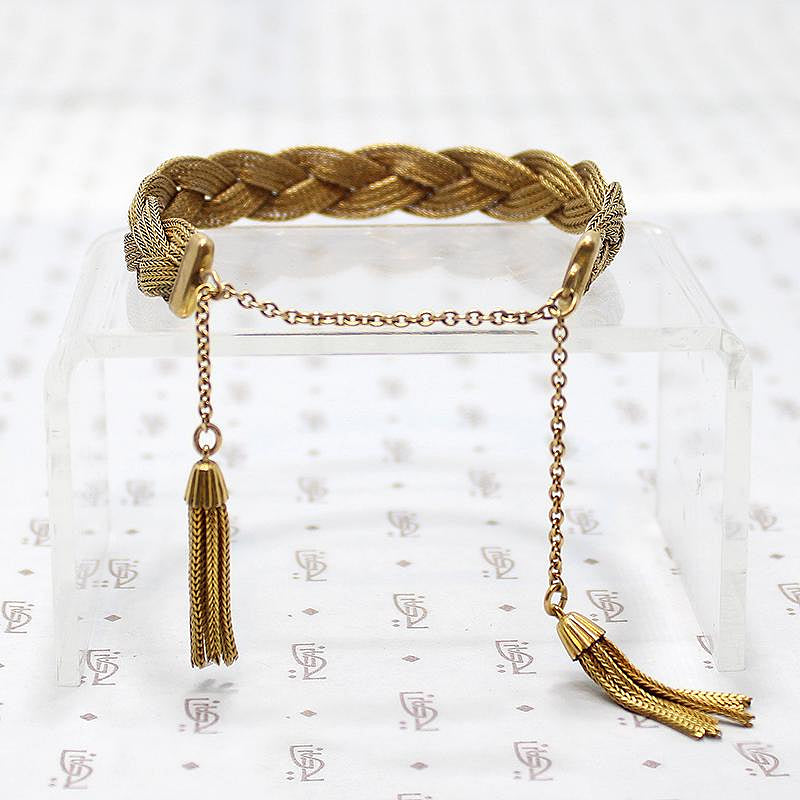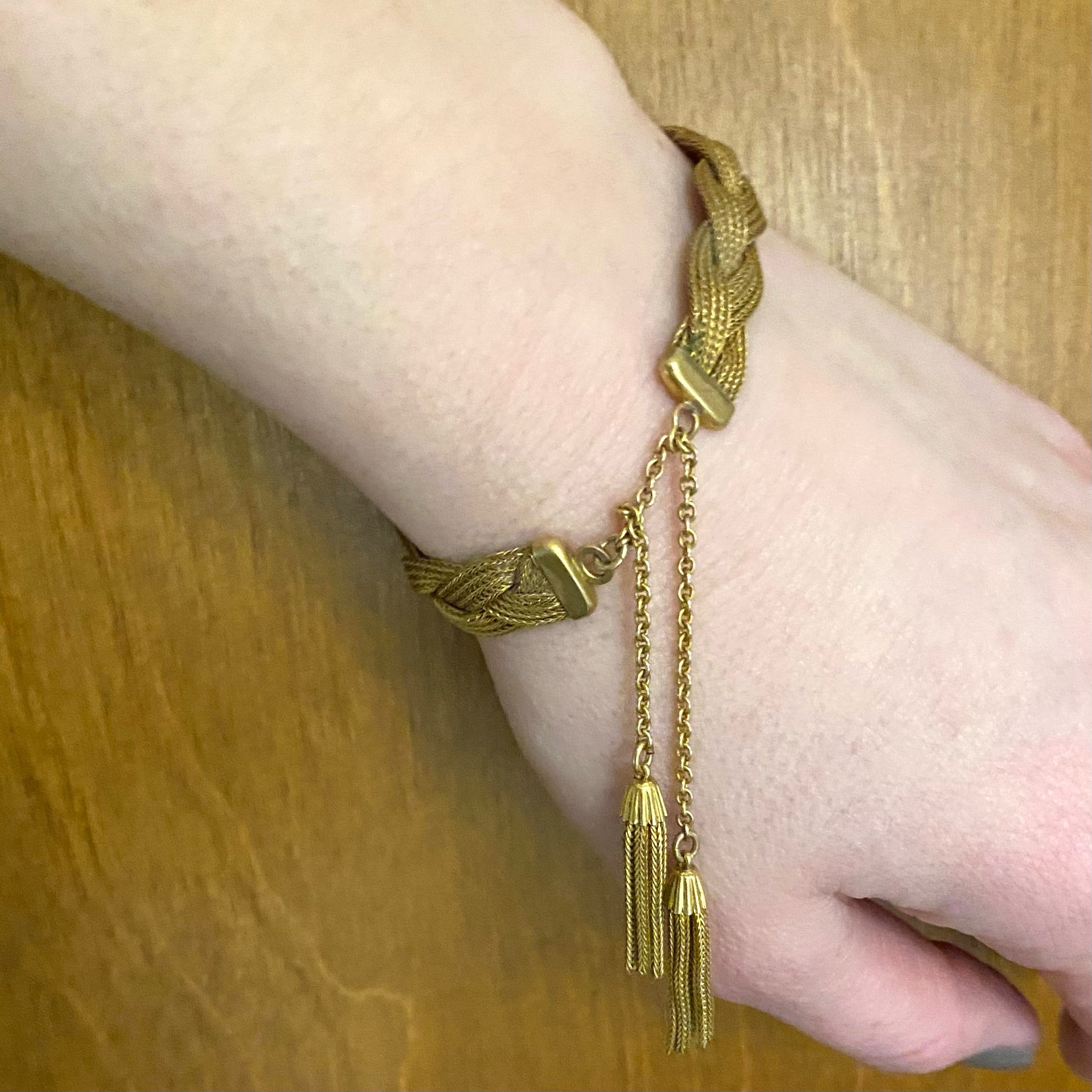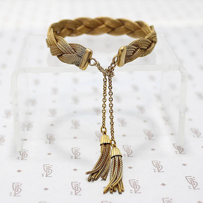This bracelet is brilliant, beautifully engineered and gorgeous. The main body of the bracelet is a length of braided and capped foxtail chain mesh. A segment of cable chain that ends in two sassy tassels of capped foxtail chain ties the bracelet closed, lariat-style. Irresistible texture and movement. This piece is made of gold filled metal, a luxurious look with an affordable price. Circa 1900.