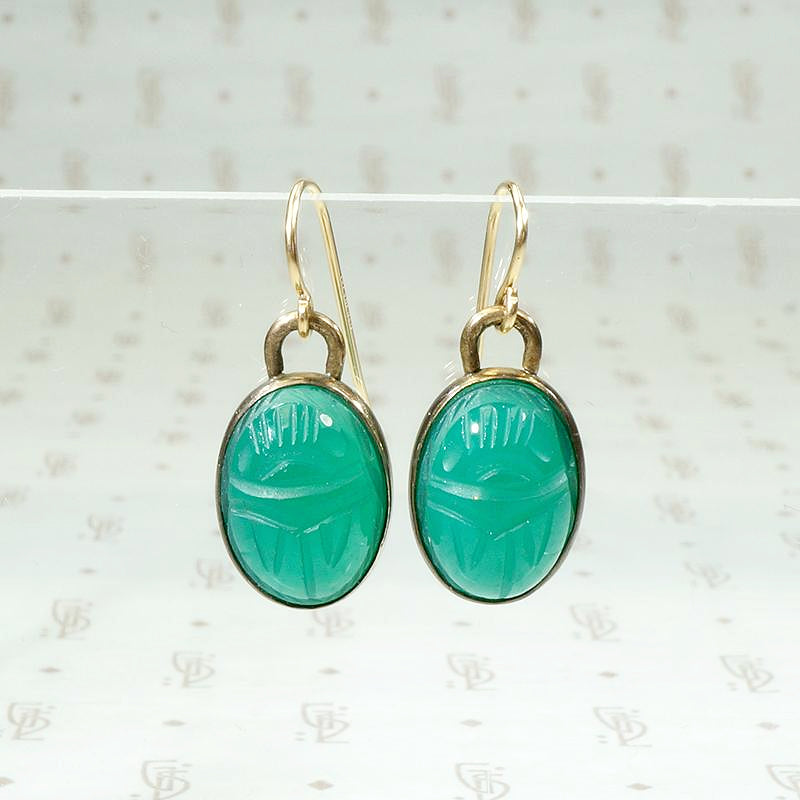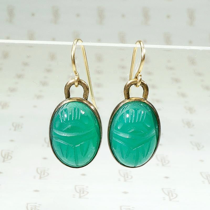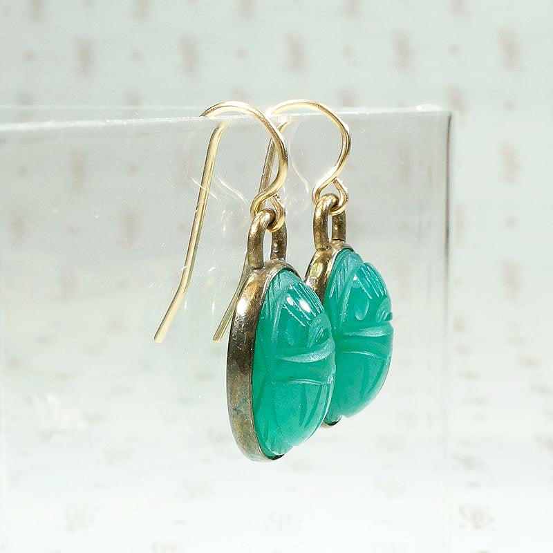 I have always loved the brightly colored scarab jewelry popular in the middle of the 20th Century. These brilliant green scarab earrings are a lovely example. The scarabs are hand carved from natural, deep green chrysoprase set in gold filled bezels with gold filled ear wires. Circa 1950.