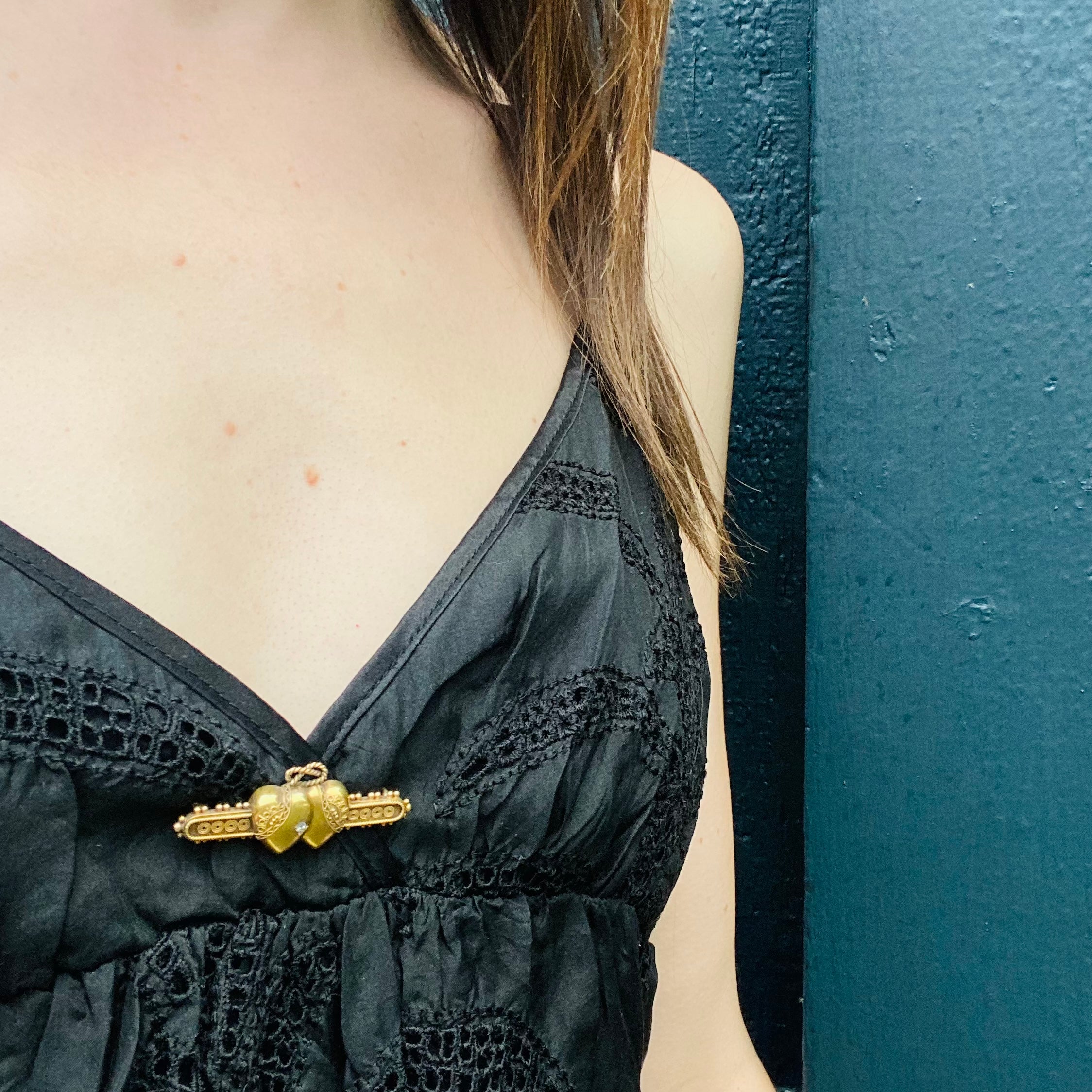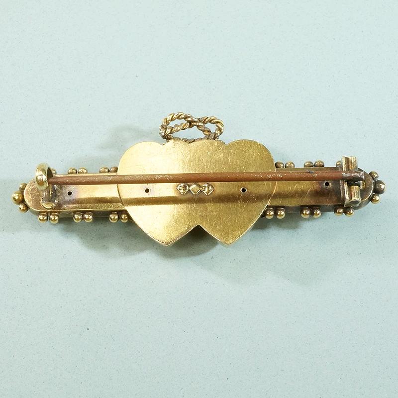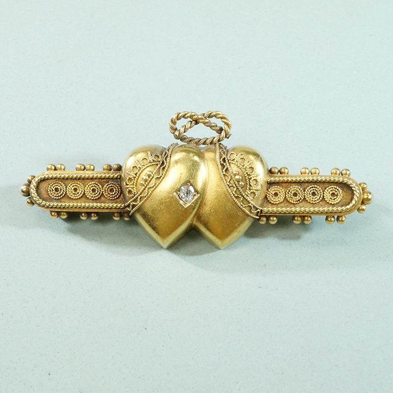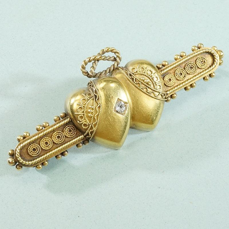 An interesting version of the Luckenbooth brooch, with two entwined hearts crowned by a knotted rope. A tiny diamond is inset in one of the hearts. The double hearts rest upon a bar pin of mellow 15ct gold. Lovely Etruscan Revival details cover the piece, with fine granulation, beads, and wire work. So sweet and romantic, with refined craftsmanship. Circa 1890.