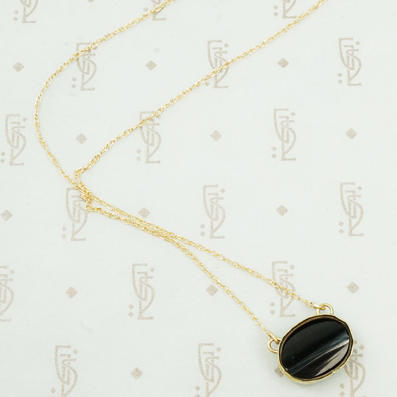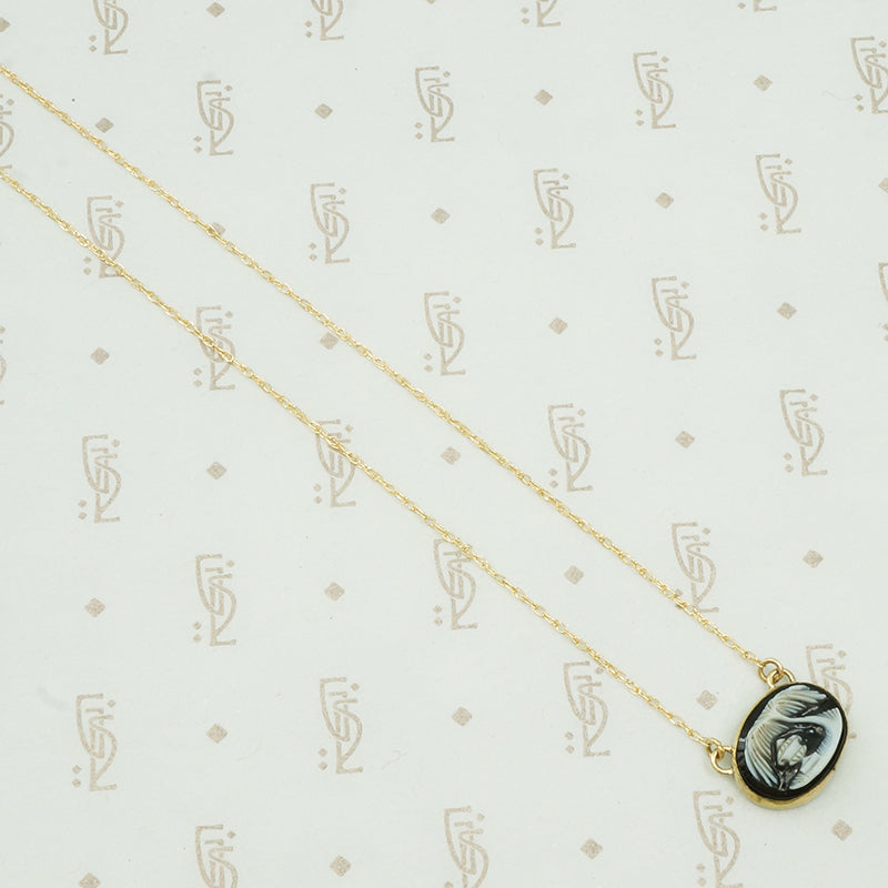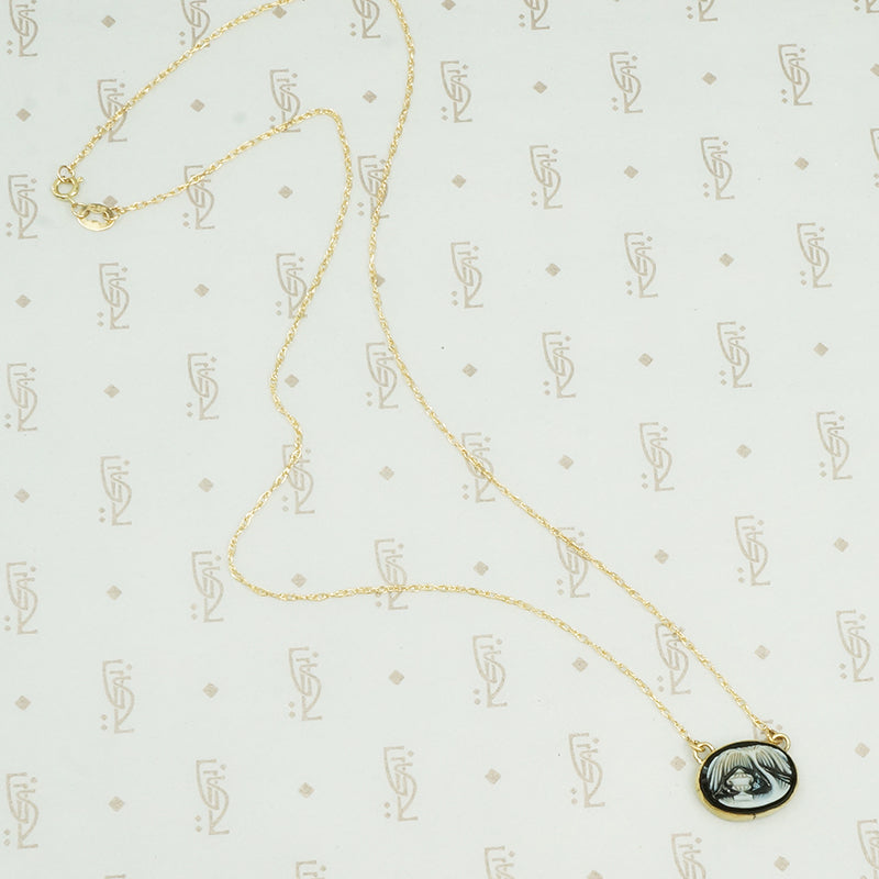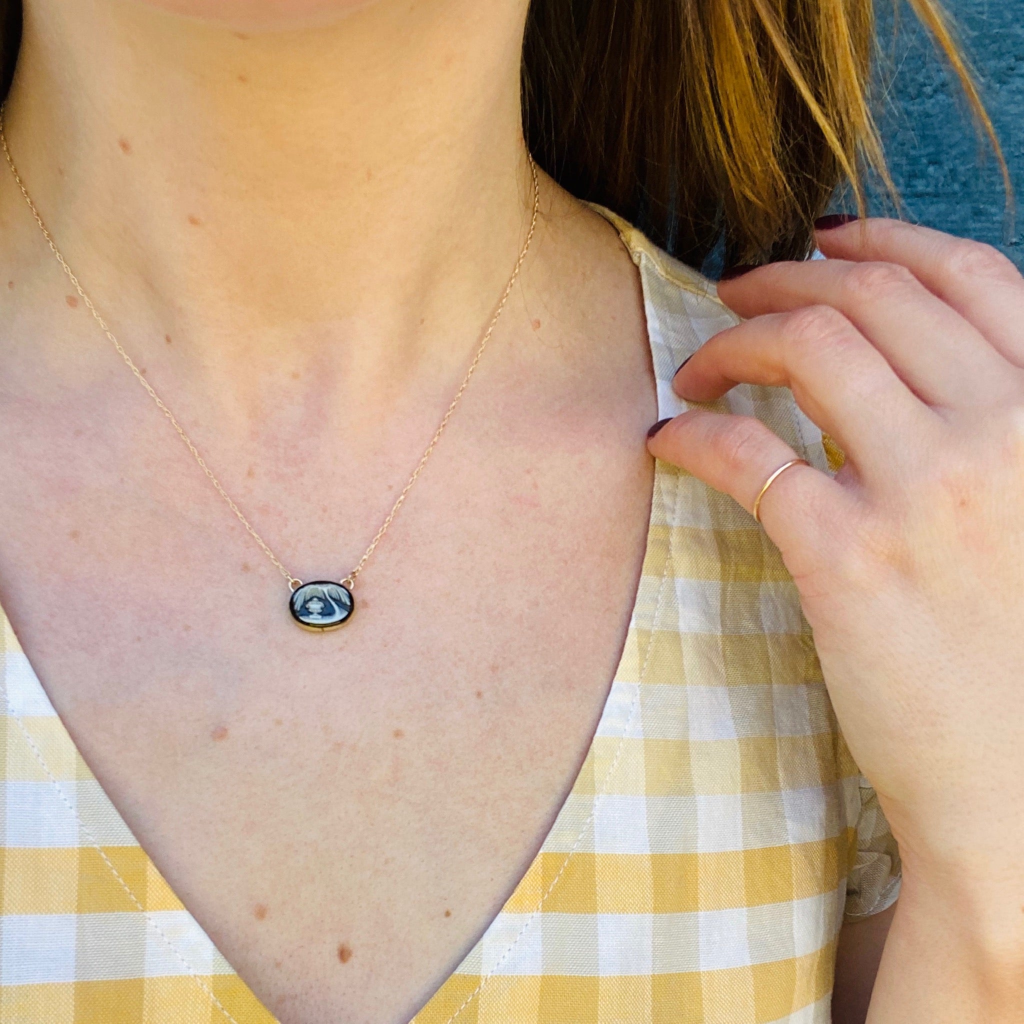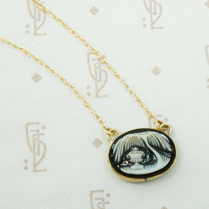 I discovered this extraordinary carved banded black and white agate in it's original bezel frame and had our lovely Brie add rings and a chain to bring it back to life as a necklace. This scene is a popular one in mourning jewels of the late 18th to early 19th centuries, a Funerary Urn on a plinth set under a Weeping Willow tree, the trees branches draping over the urn. Death was a part of everyday life and to commission a jewel as a remembrance of a loved one lost was commonly done. The agate in its frame date from circa 1820, the new chain is recycled 14k gold.