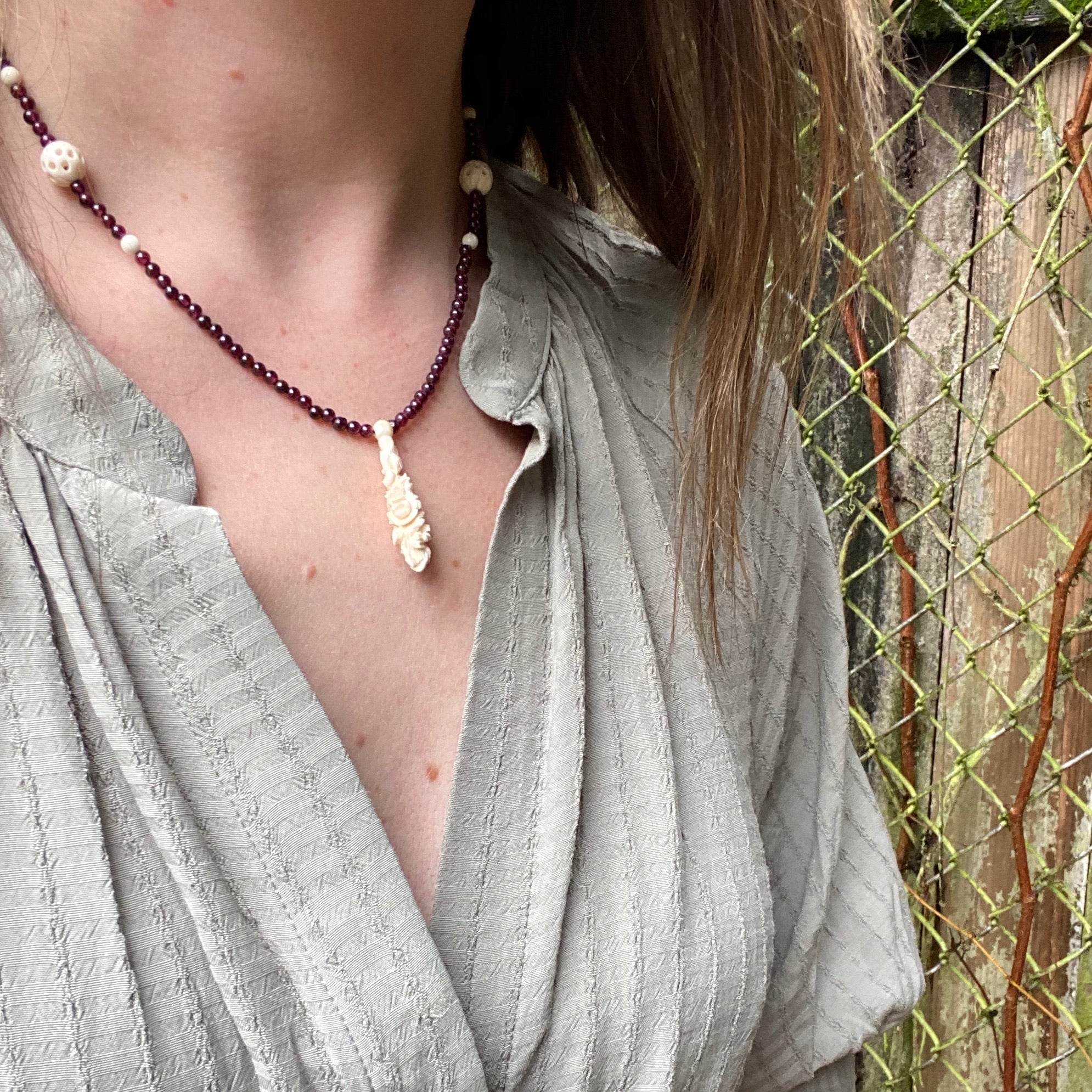 Vintage round black currant-colored garnet beads are strung alongside ornately carved bone beads. The garnet beads glow with a deep glossy warmth. A teardrop-shaped bone pendant completes the piece, it is closely carved with roses. The necklace is finished with a sterling silver lobster clasp. We adore that juicy black currant-color. It's no wonder garnets symbolize love.