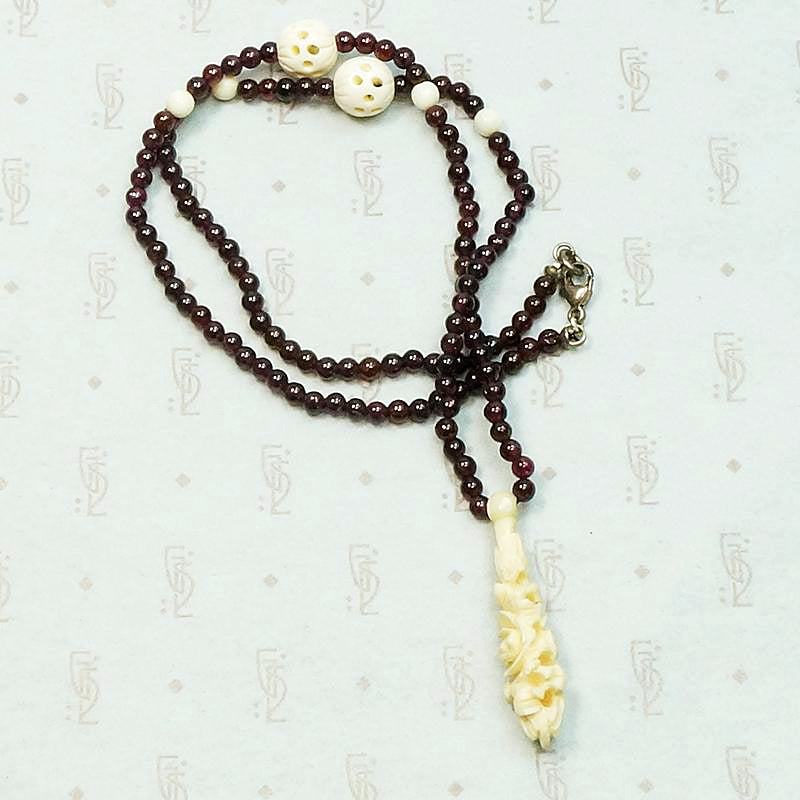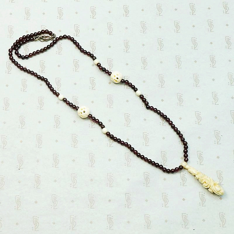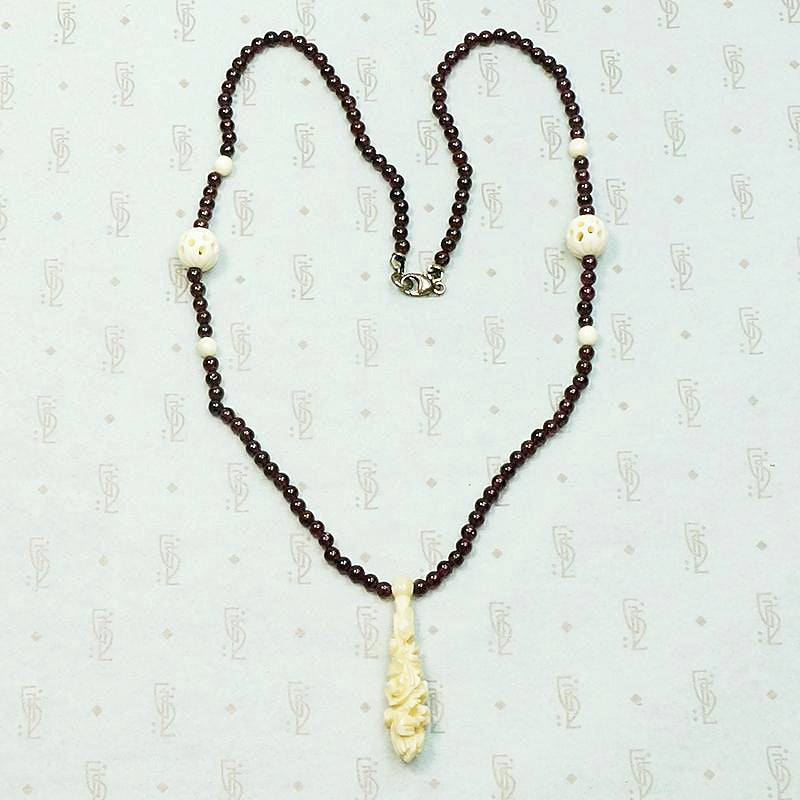 Details.....The necklace measures 20" long. The garnet beads measure 3.2mm and the bone beads are 8.5mm. The carved bone pendant measures 1.43" by 0.34".