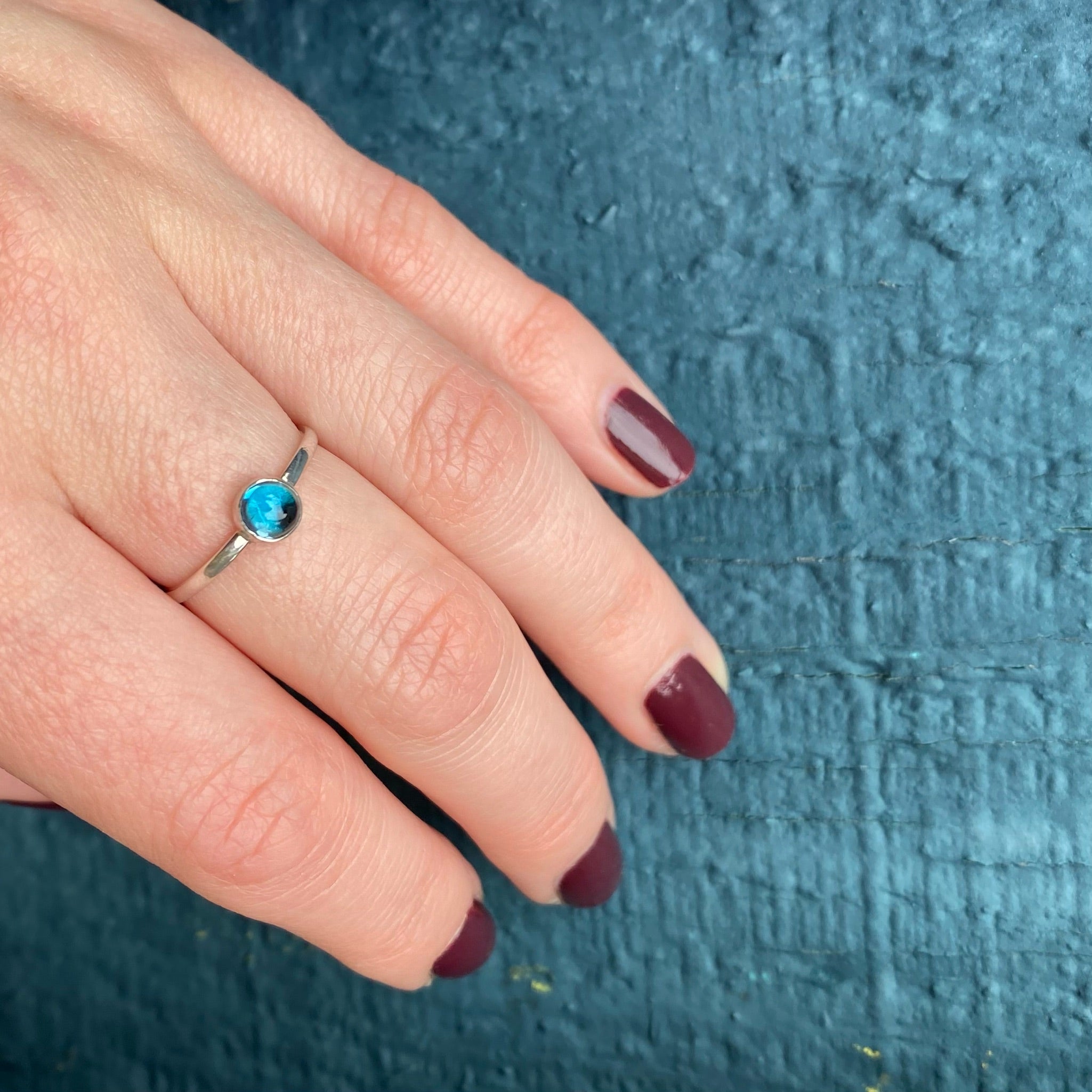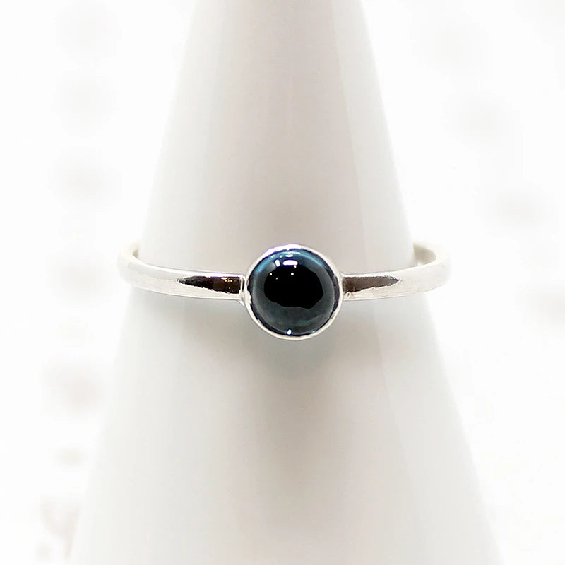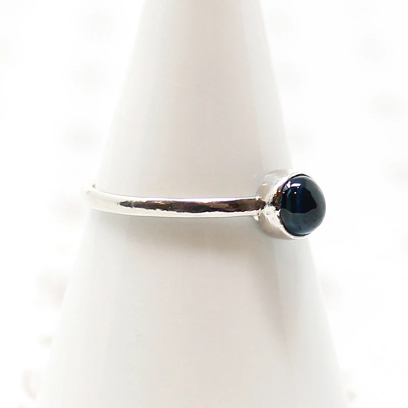 A cerulean cabochon of blue spinel is simply bezel set in recycled sterling silver. Spinel is a recent addition to the modern birthstone list; in 2016 spinel joined peridot as one of two August birthstones. Blue spinel is thought to strengthen mental power and purify negative energy.