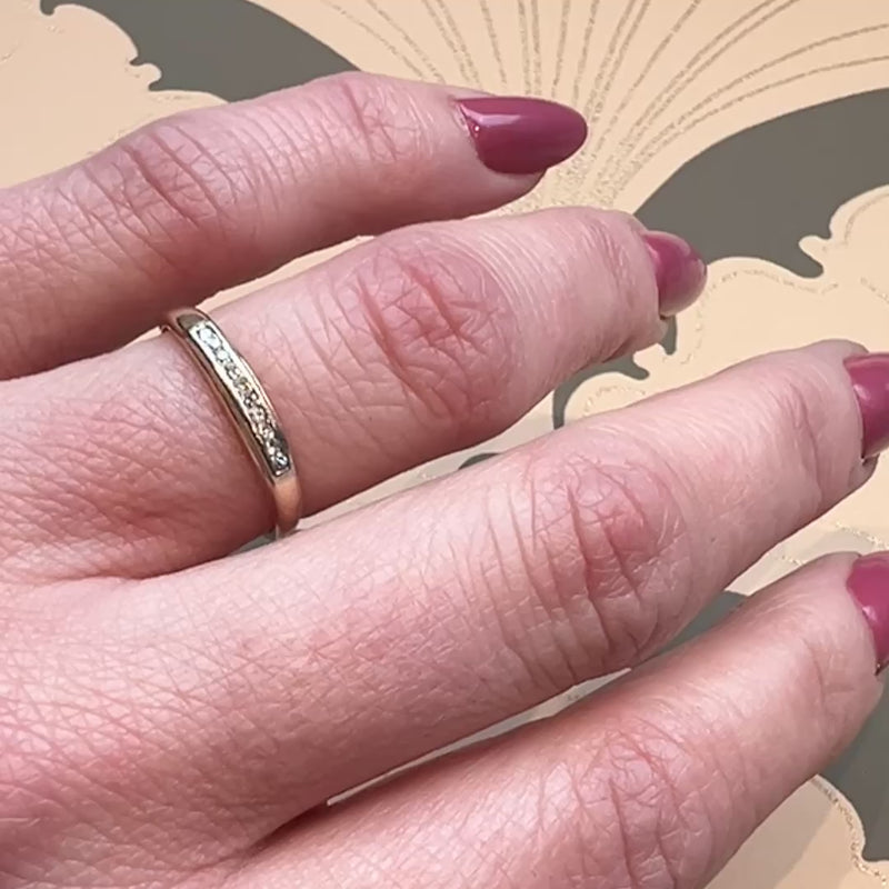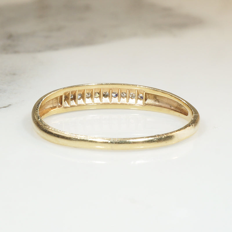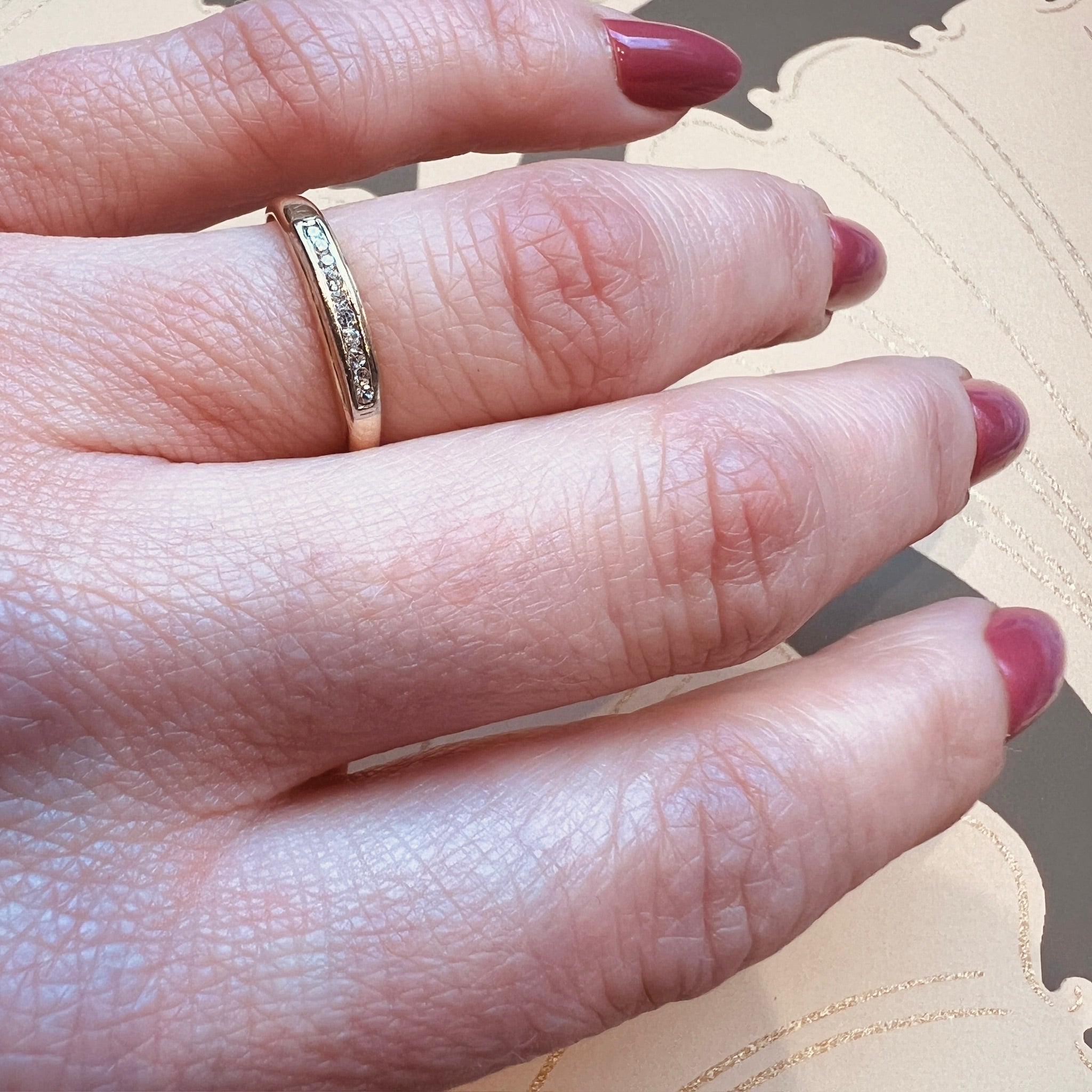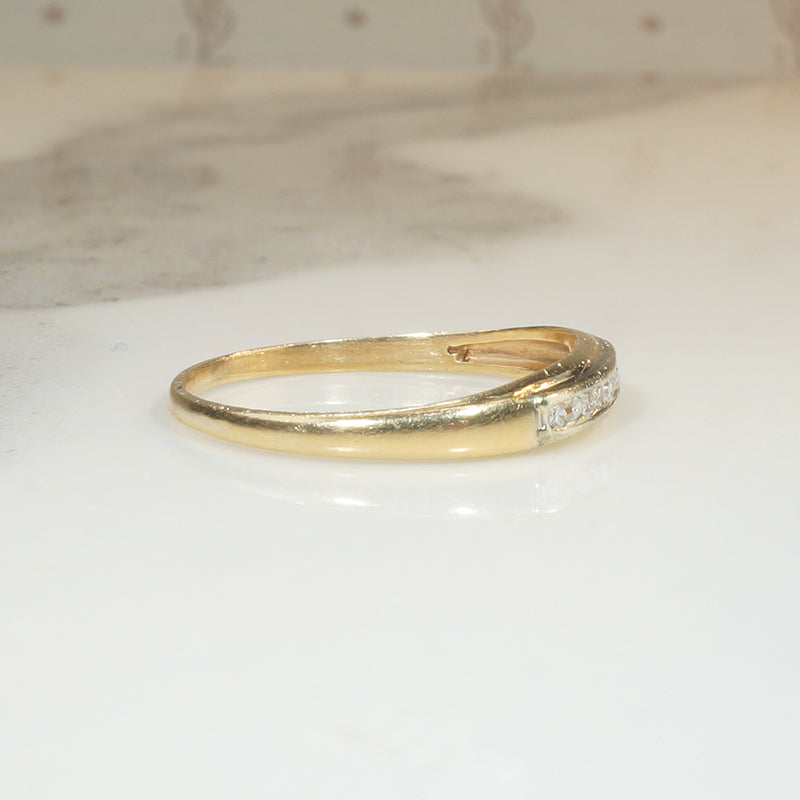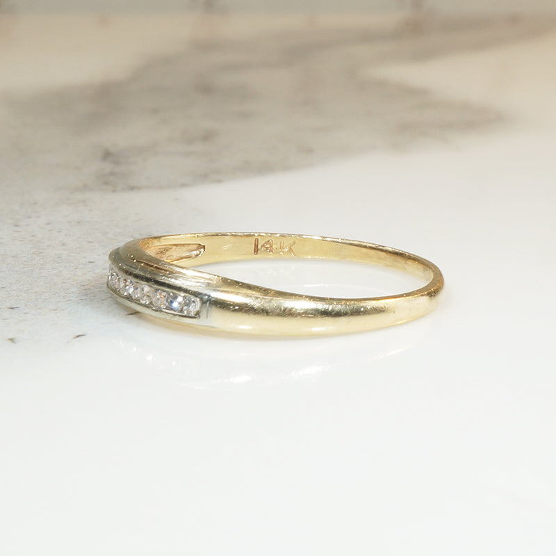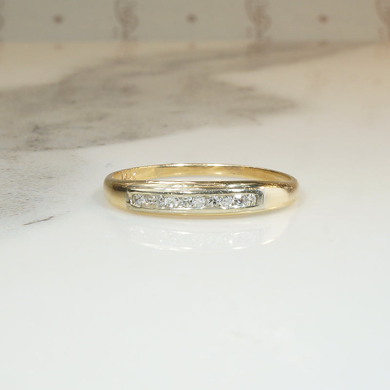 A pretty and petite diamond wedding band. Perfect to pair with your vintage engagement ring or to add to your favorite band stack. Ten bright diamonds are channel set in 14k white gold on a 14k yellow gold band. Two-tone gold makes this lovely band so versatile it will go with everything. Circa 1940.