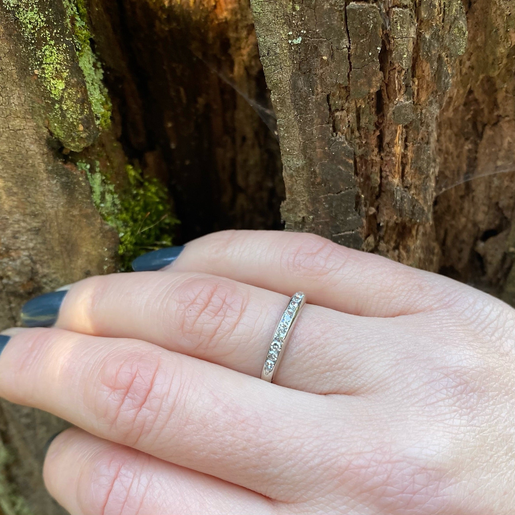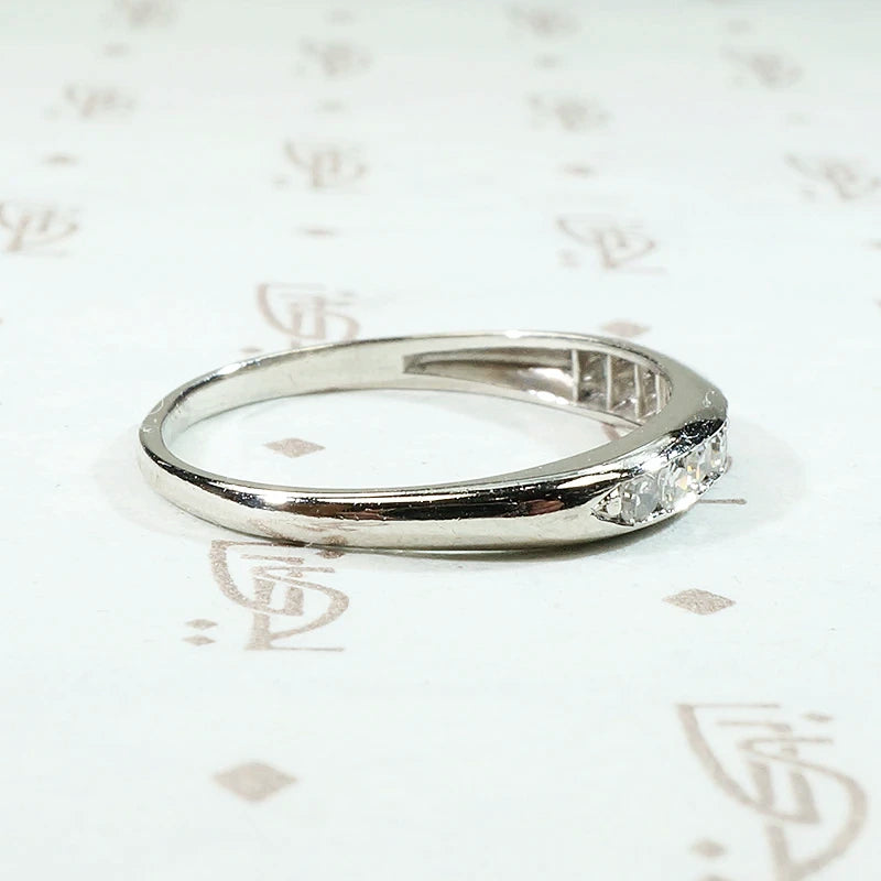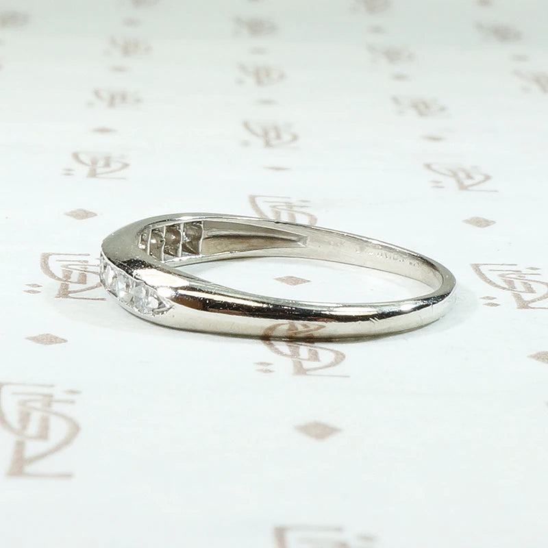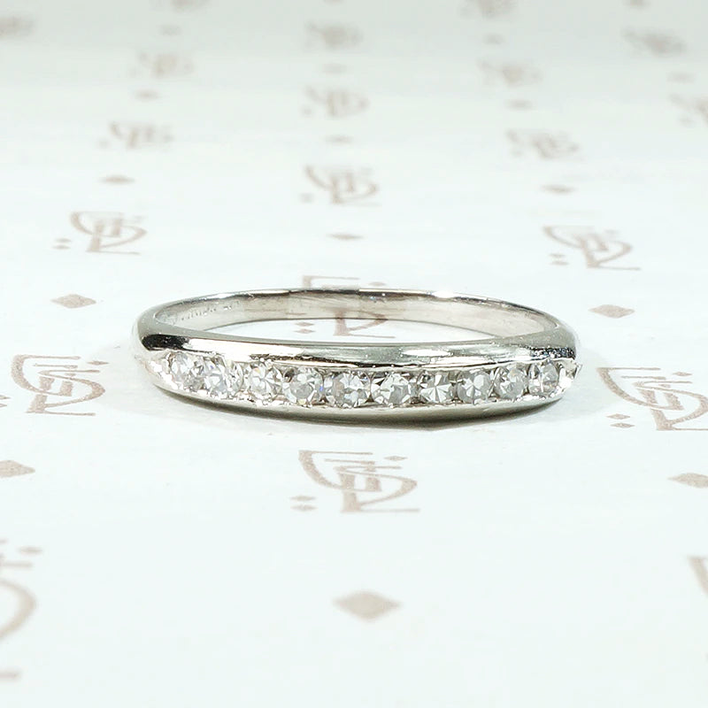A sleek and slim vintage wedding band with diamonds set in platinum. Ten pretty diamonds are channel set across the front of the ring. It is a simple design that showcases the 0.15tcw of diamonds, a more generous carat weight than we usually see in this type of band. An elegant wedding band that will look great with anything you choose to pair it with. Circa 1930.