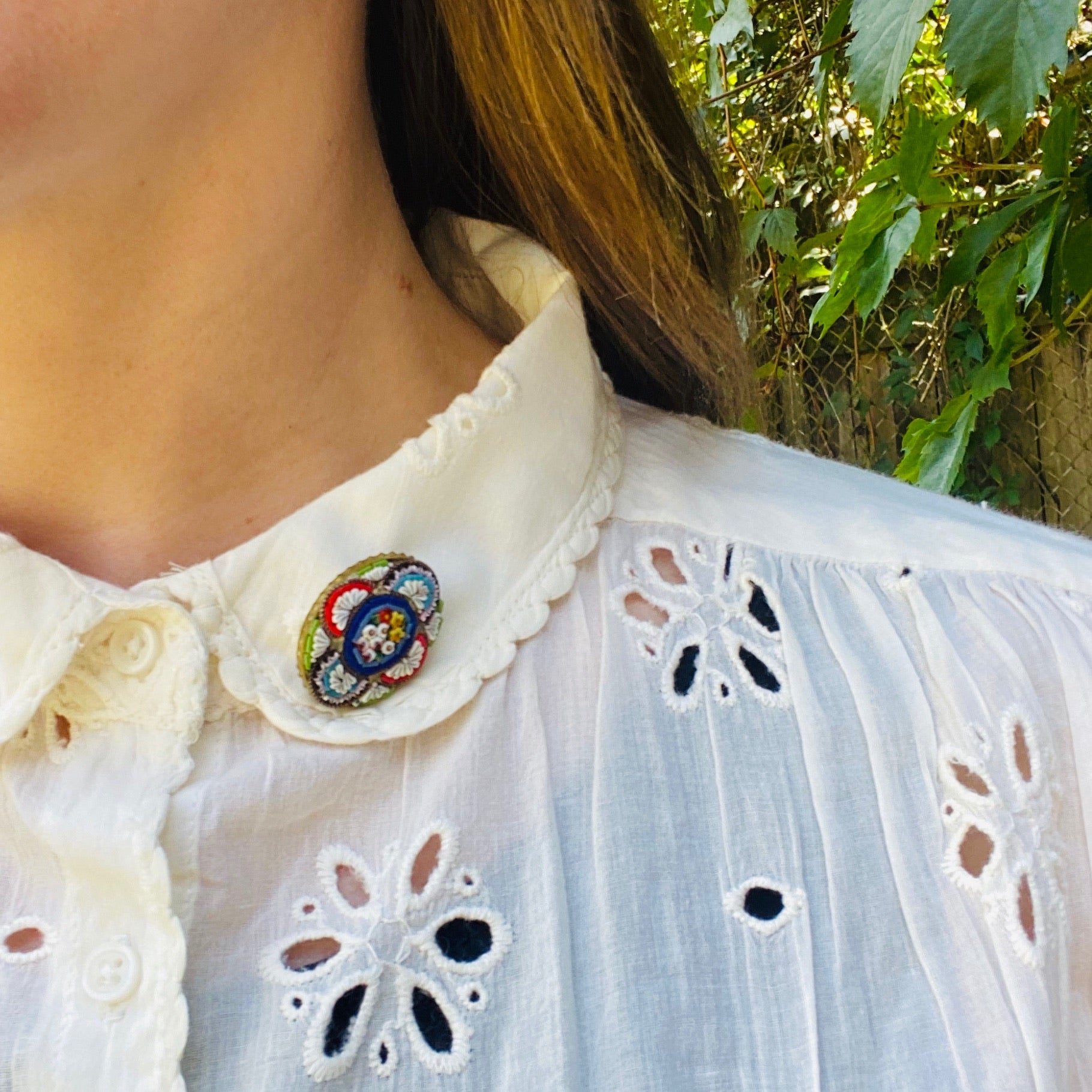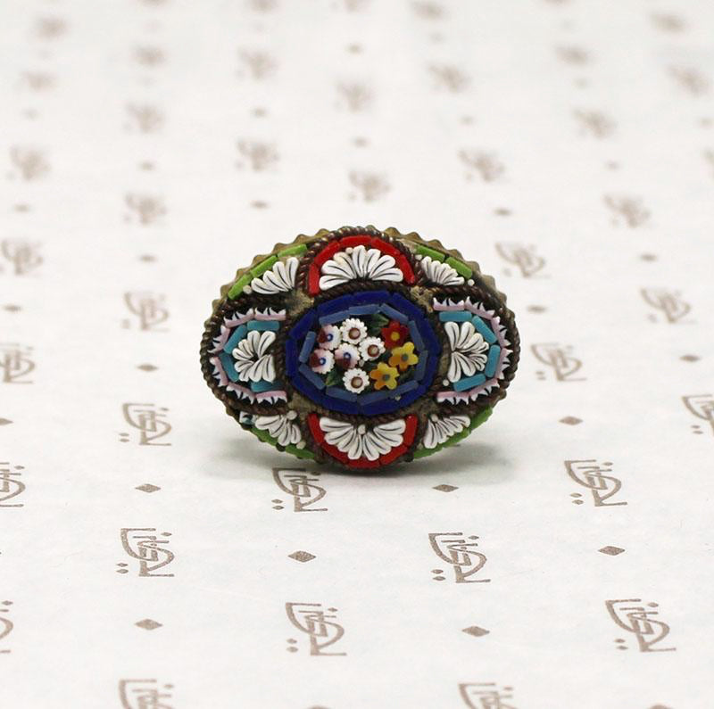 This cheerful micro mosaic brooch is fun and charming. A posy of flowers is surrounded by a design depicted in vivid tones of red, blue, green, violet, teal, yellow and white. A micro mosaic is created using the tiniest pieces of tessera (glass, in this case) to create depth and detail such as a painting would have. This mosaic is set in a pretty brass frame. It was most likely a travel souvenir, the back is marked "Made in Italy." Circa 1950.