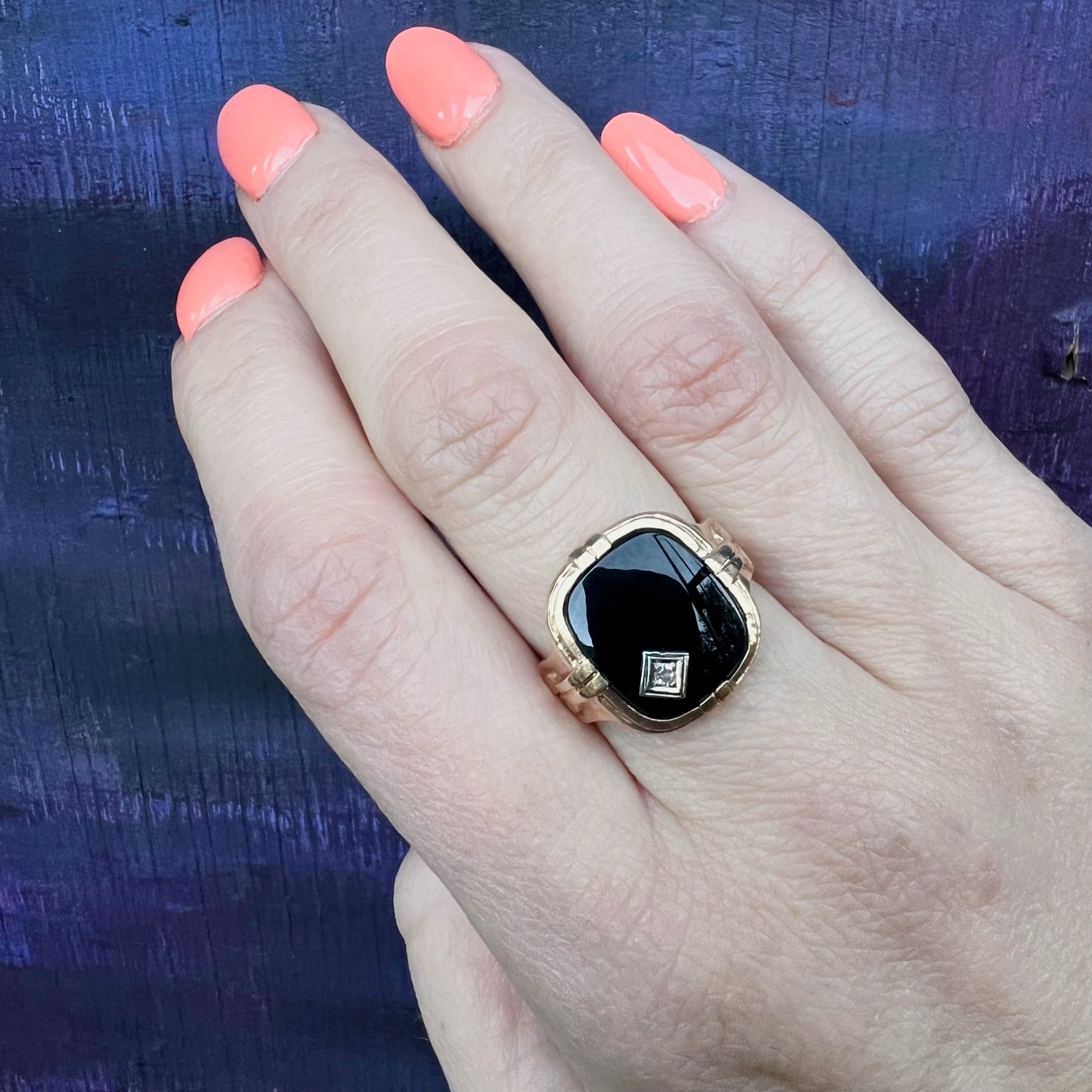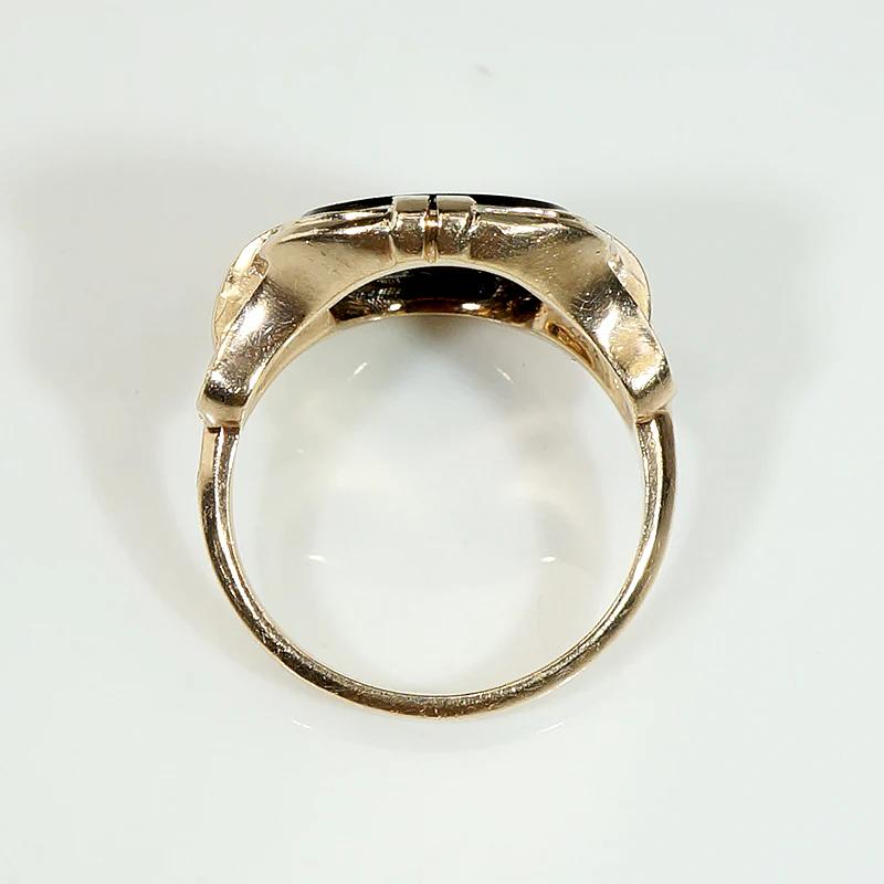 The black onyx and diamond ring is a beloved staple of the Art Deco jewelry wardrobe. This lovely example is pretty and refined. A cushion of glossy black onyx is accented in one corner with a white gold lozenge set with a sweet wee diamond. The 10k yellow gold setting is sculpted with bold lines and scrolling at its shoulders. This piece is easy to wear and versatile, and the asymmetry of the ring charming. Circa 1930.