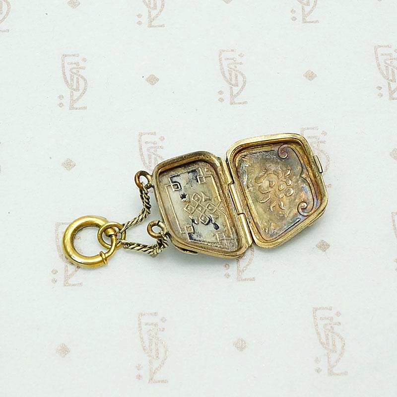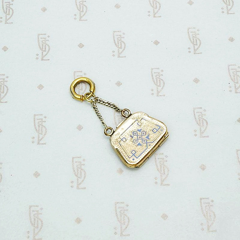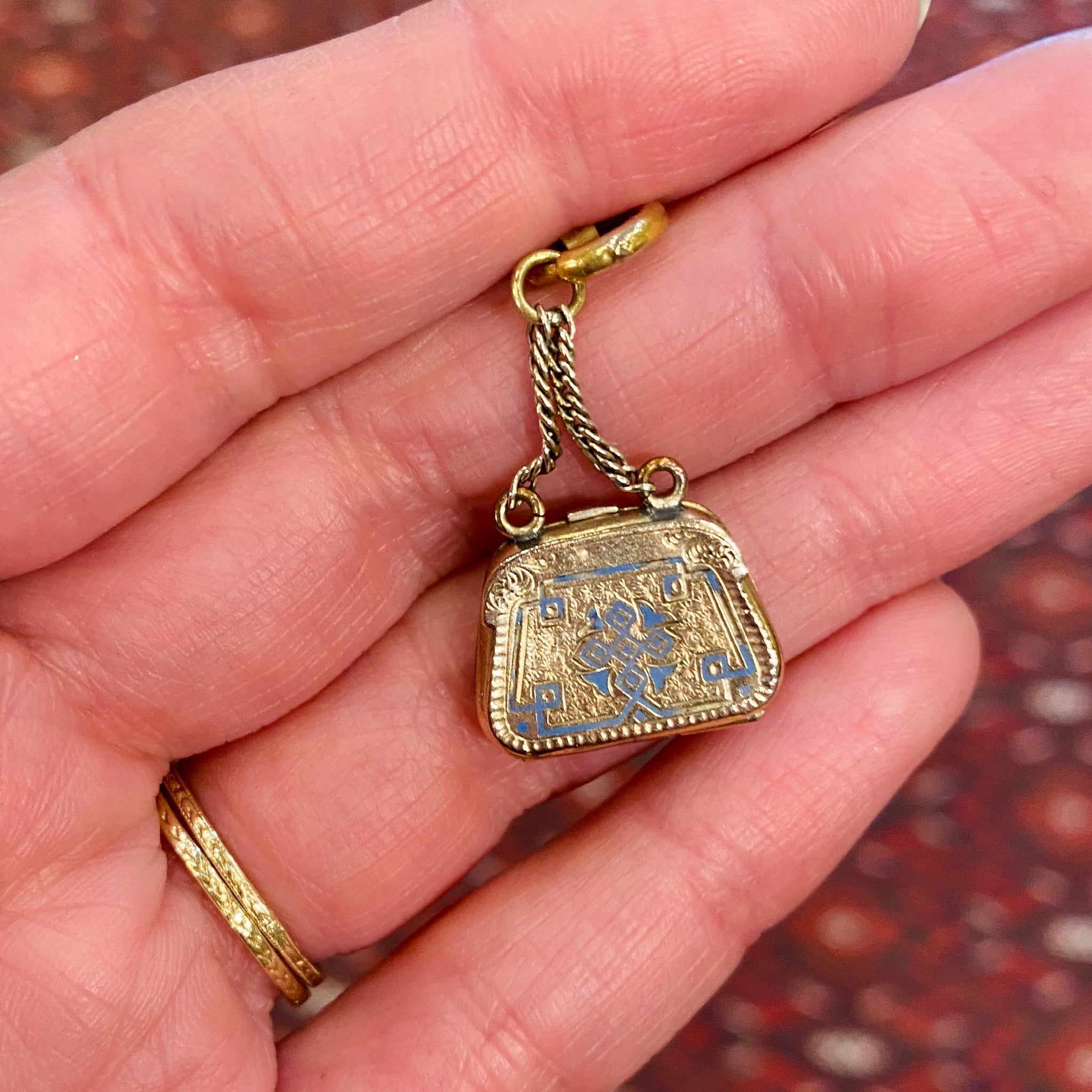 This absolutely charming charm is shaped like a wee purse. This charm is extra special because it opens, just like a real hand bag. The purse is made of 15ct gold sheet, decorated with sky blue enamel forget me not flowers and Aesthetic Movement geometric designs. It hangs on an antique gold filled spring ring, which makes it easy to attach/detach the charm from anything you like. Circa 1860.
