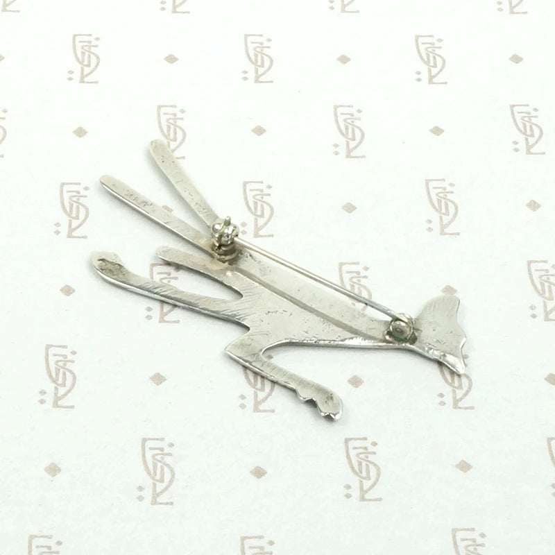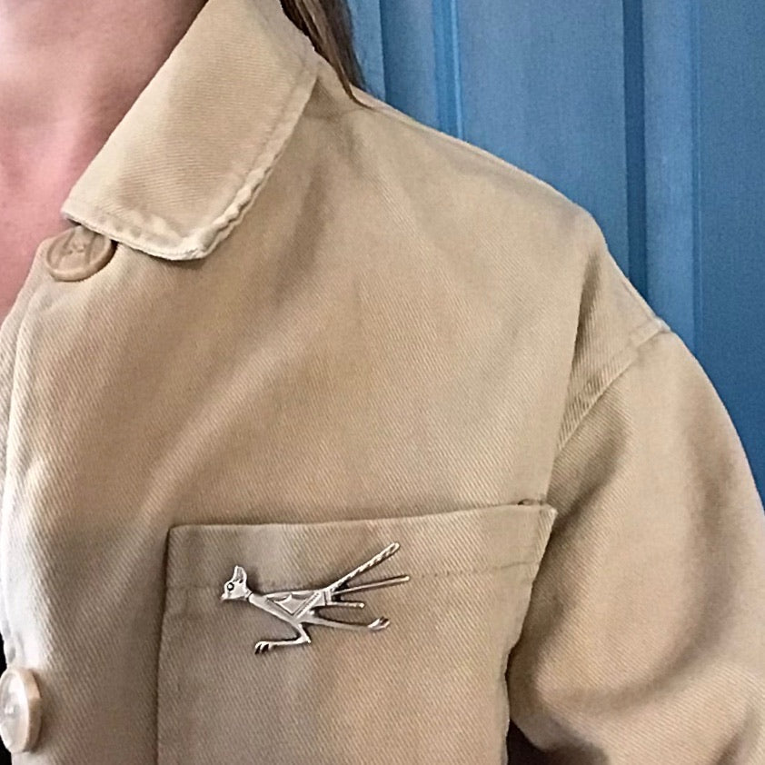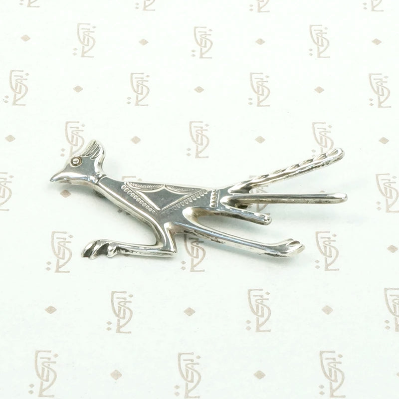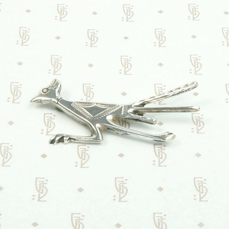 A charming sterling silver brooch in the shape of a stylized roadrunner. He looks so speedy! Circa 1970.