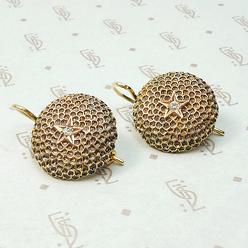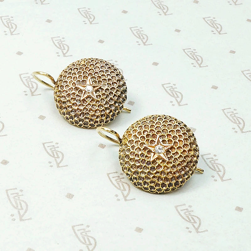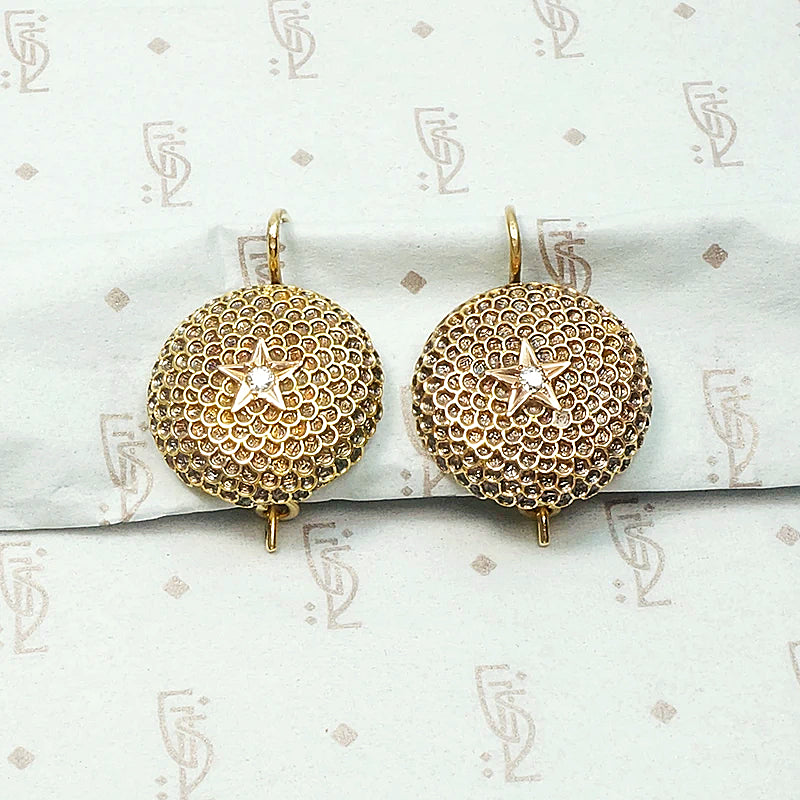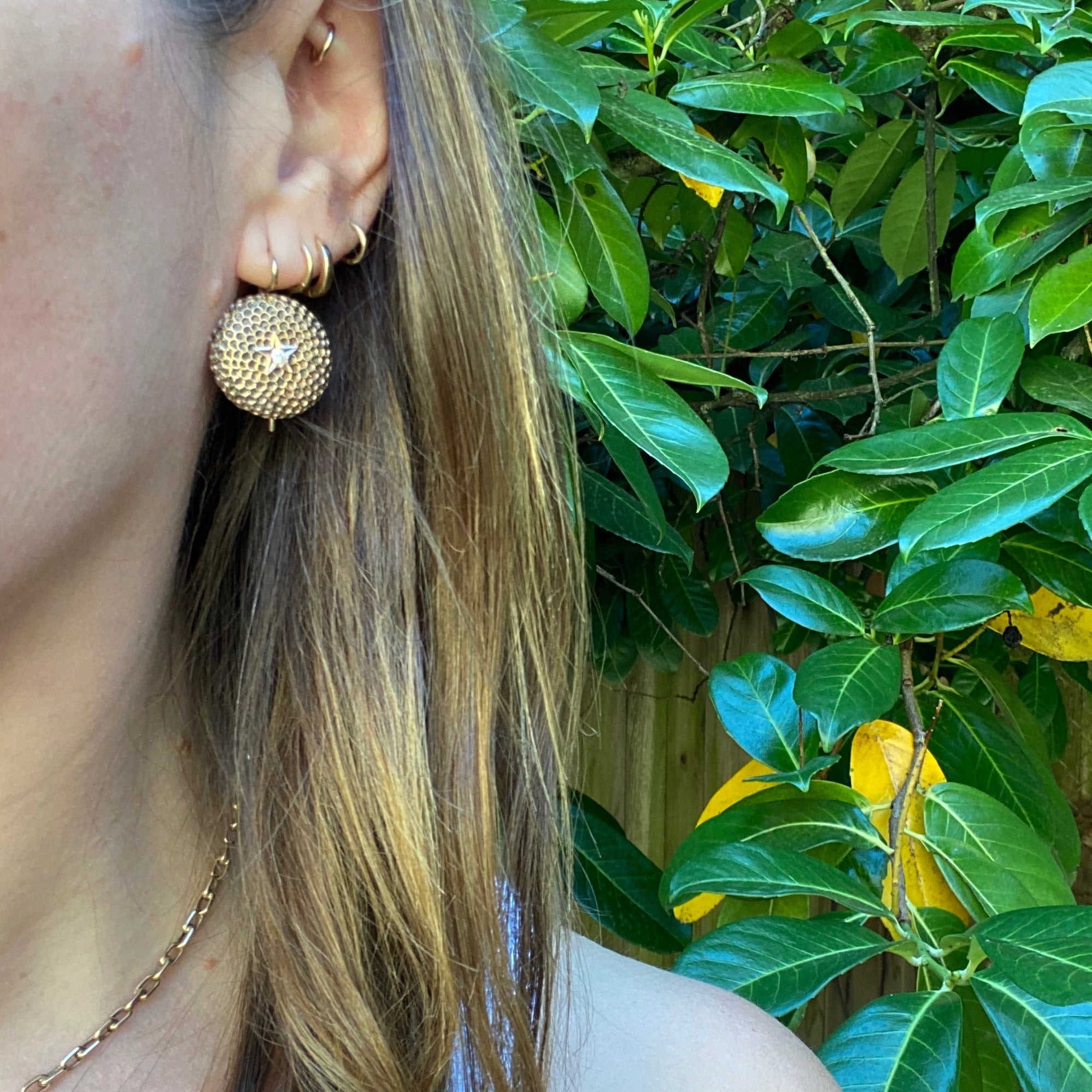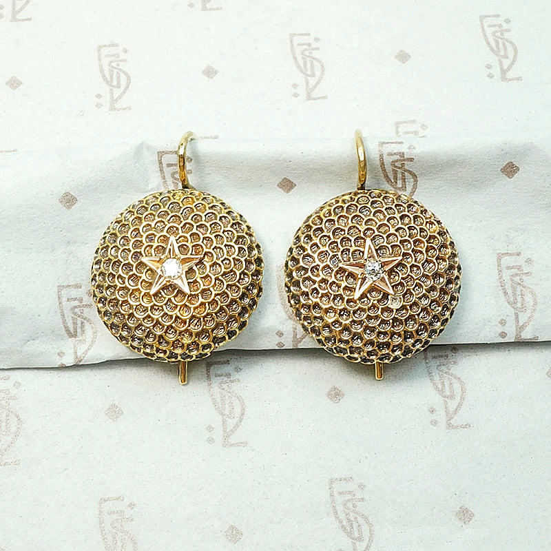 Charming Victorian earbobs. The earrings are crafted of 14k yellow gold with tiny diamonds star-set at their centers. The surface is scalloped all over with tiny petal-like details. The bobs are reminiscent of chrysanthemums. A light bloom covers the surface, further adding to their allure. The ear wires are a modern replacement and hook closed for security. Circa 1890.