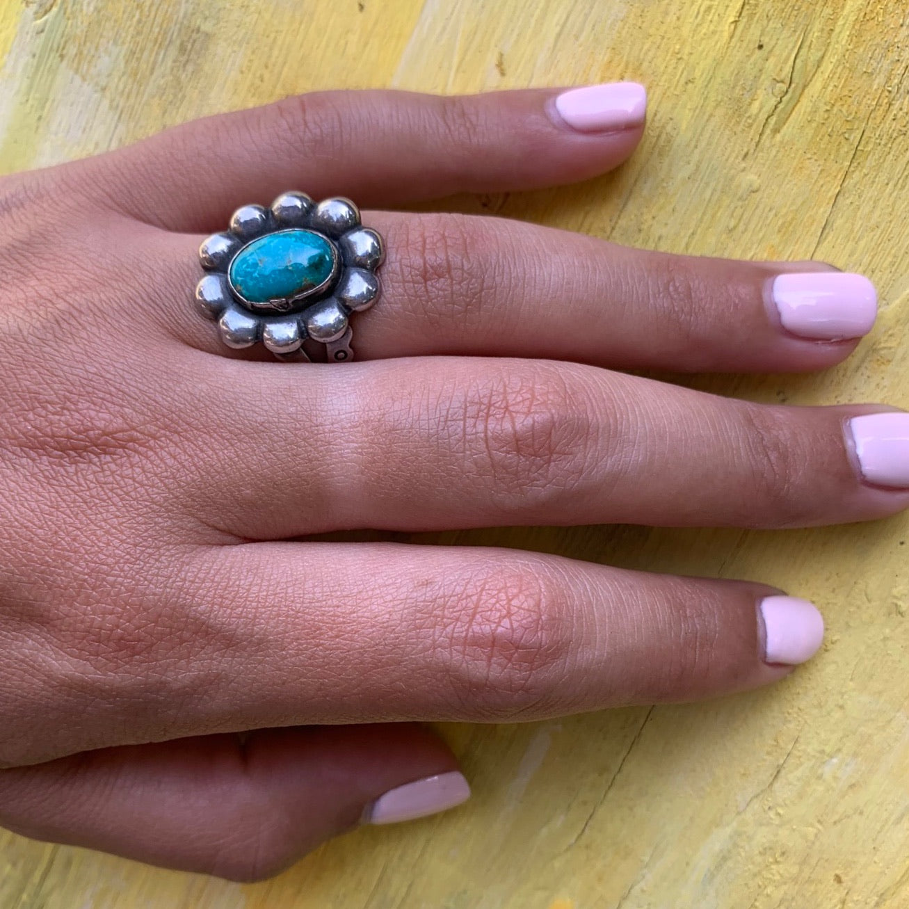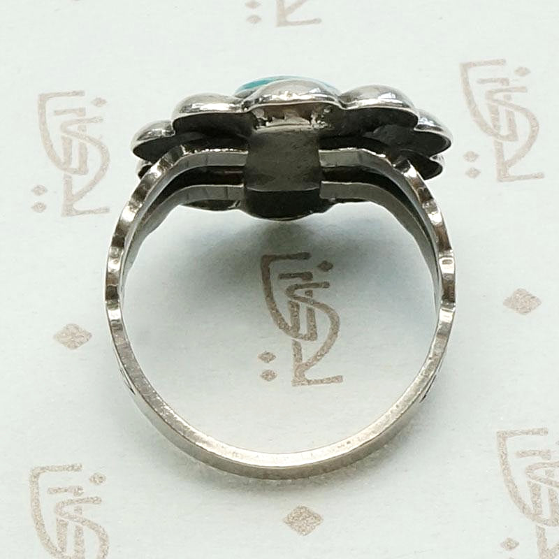 A vivid aqua blue natural turquoise is set in the center of a sterling silver daisy. The stone is bezel set and surrounded by puffy petals. The top of the machine made ring is set over a decorative, split shouldered band. A fun and cheerful piece. Circa 1970.