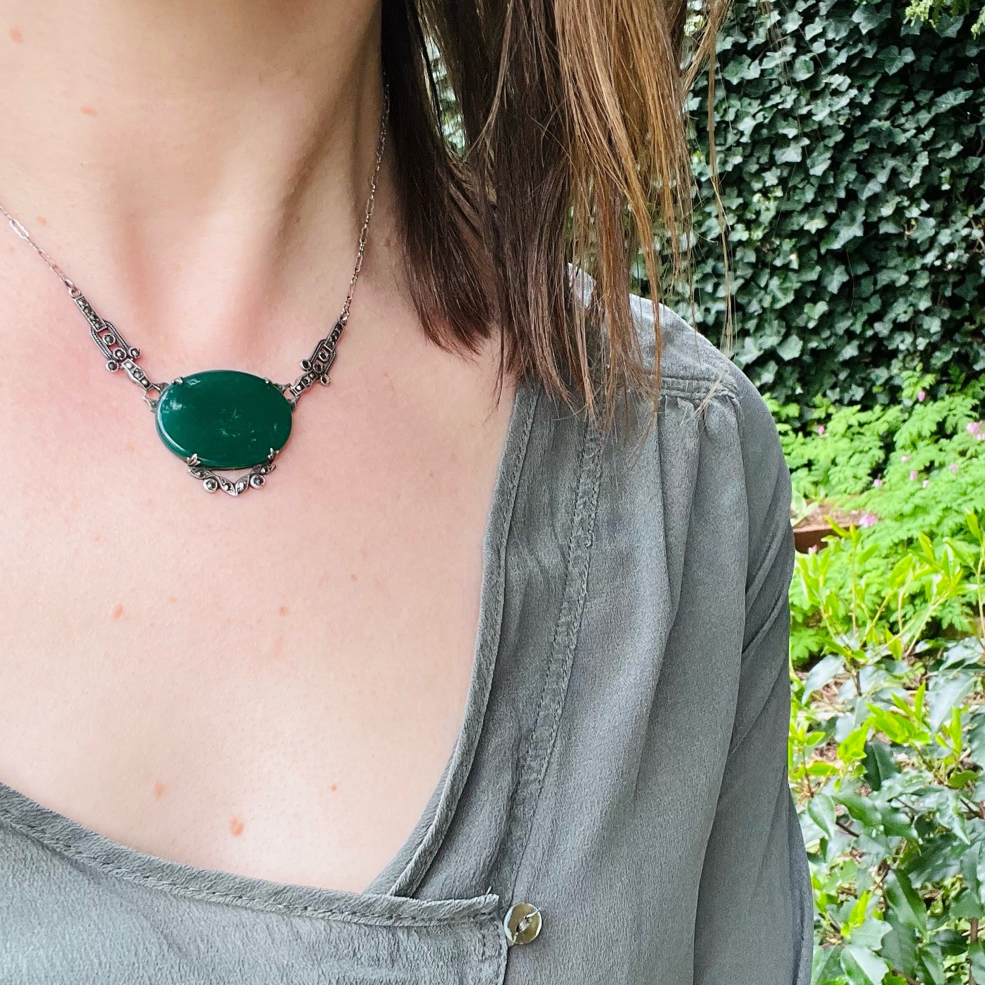 This Art Deco chrysoprase necklace is the bee's knees. The center of the necklace is an oval of intense green chrysoprase, framed in sterling silver and supported by sculpted silver links. The chrysoprase is that perfect shade of glowing green so valued in the Art Deco aesthetic. The silver is engraved and spangled by glittering marcasites. The decorative element hangs on a sterling silver peanut chain. This is the perfect necklace for your favorite Flapper. Circa 1920.