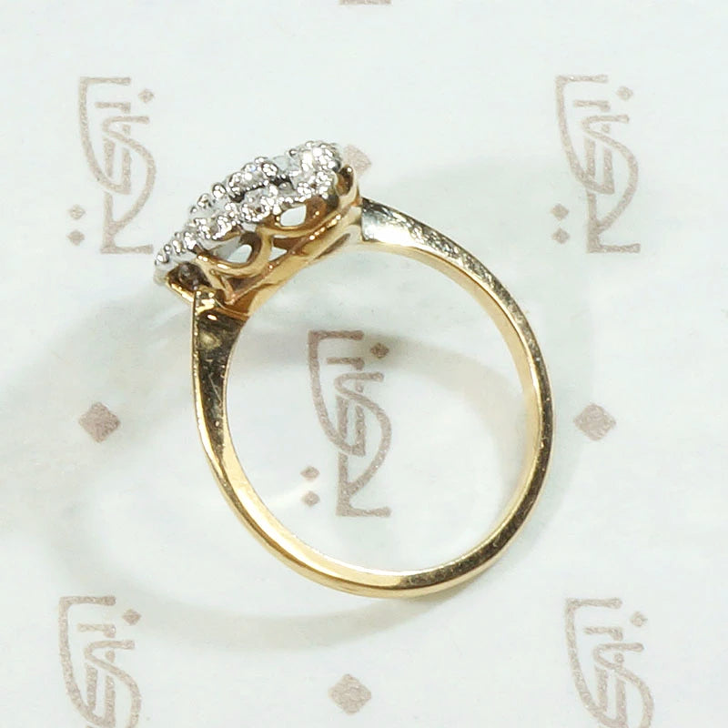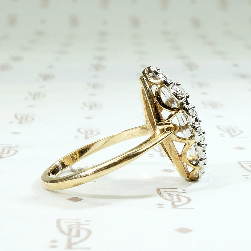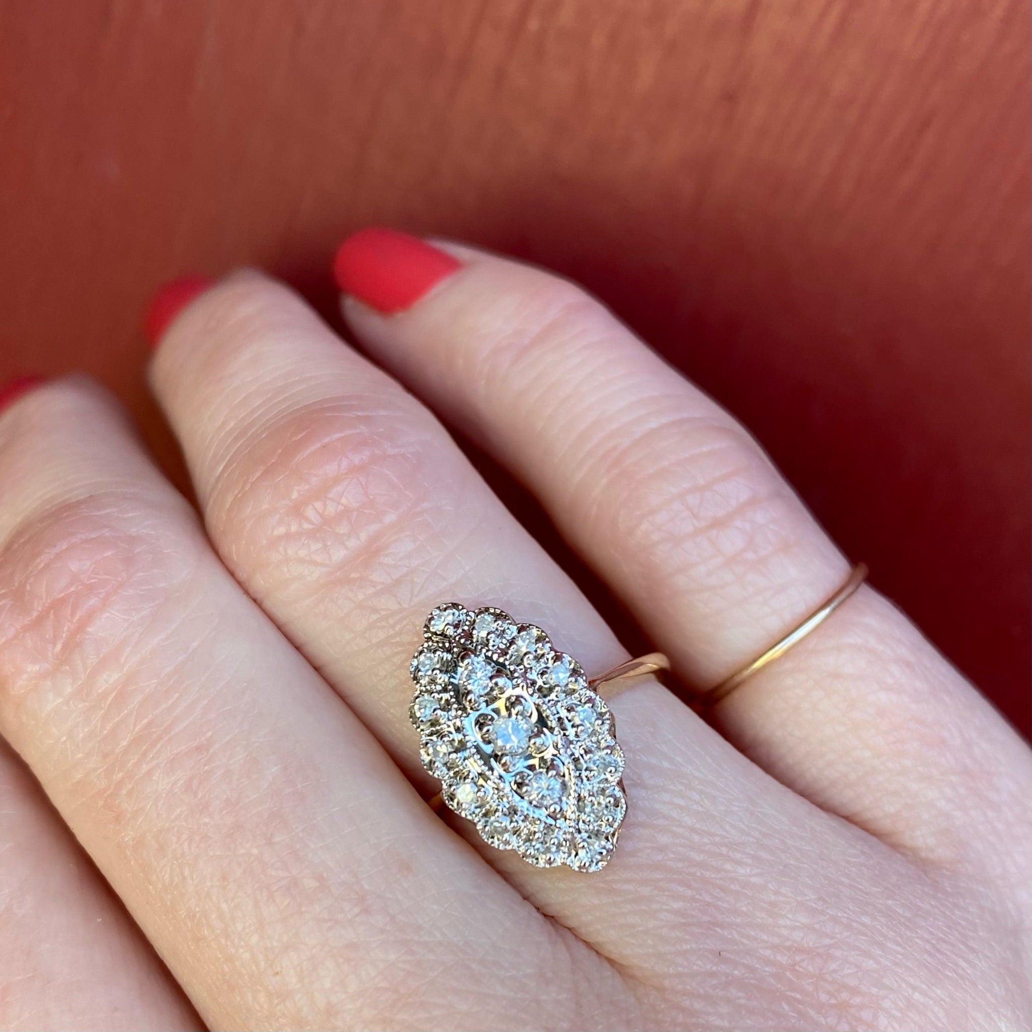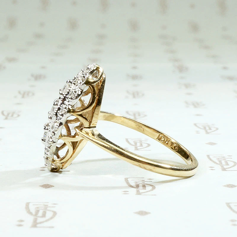 A chubby navette-shaped diamond cluster ring, so twinkly and pretty. 17 tiny diamonds are set in a beautifully scalloped two-tone 10k gold setting. The mix of white and yellow gold gives this beauty real versatility. It goes with everything, and the white gold prongs accent the sparkle of the diamonds. Circa 1960.