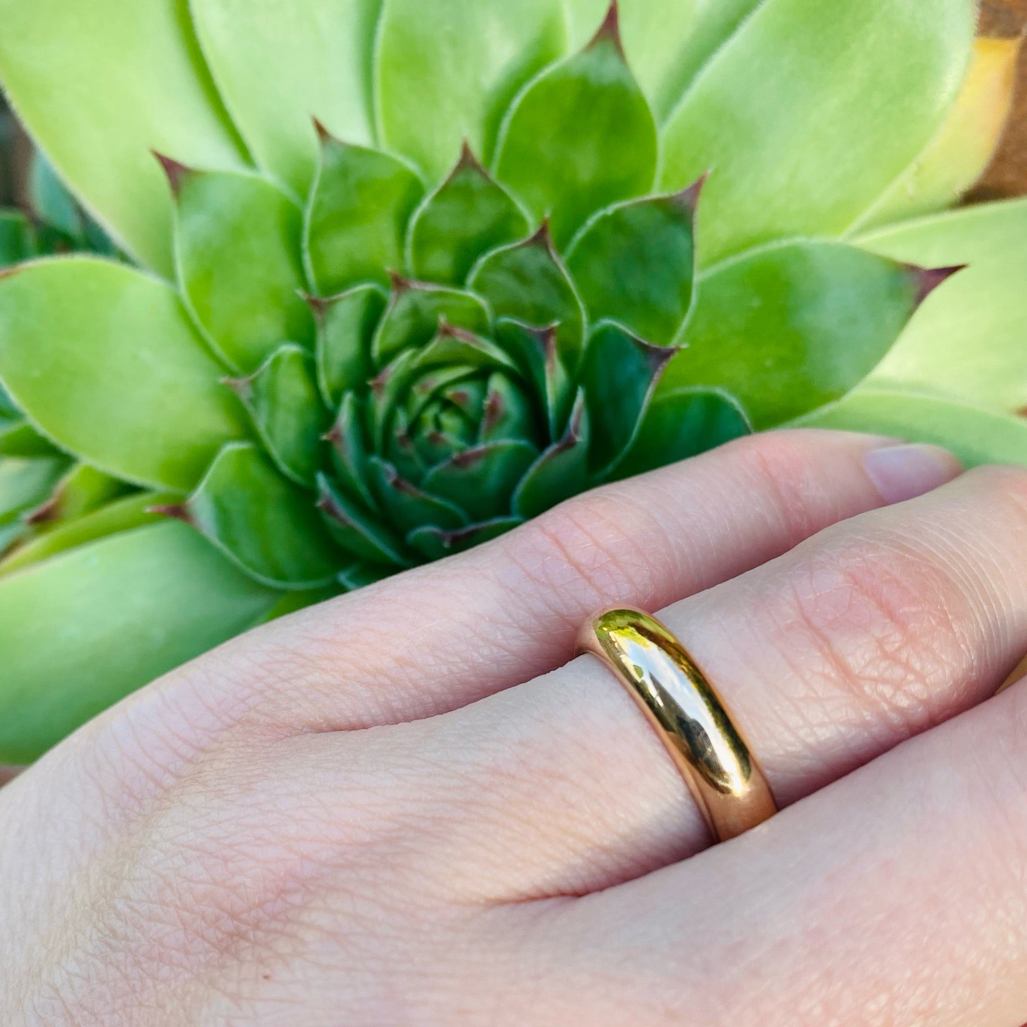 This chubby 14k gold wedding band dates to the Art Deco era. With a deep half round exterior, a soft interior curve and a wide flat edge, this band has a very satisfying weight on the finger. The interior of the band is stamped 14bK. Luxurious and timeless, this gold band is a classic. Circa 1920.