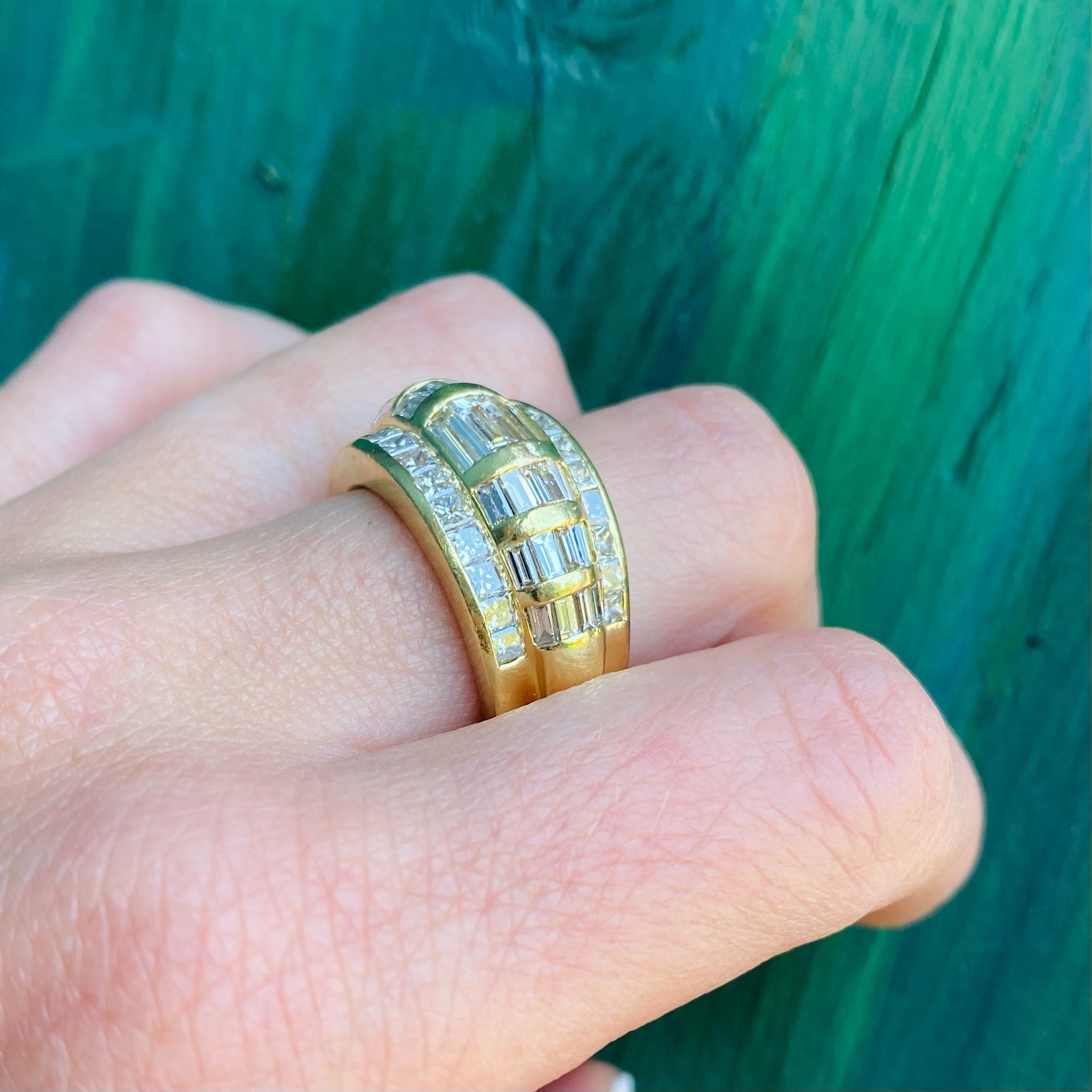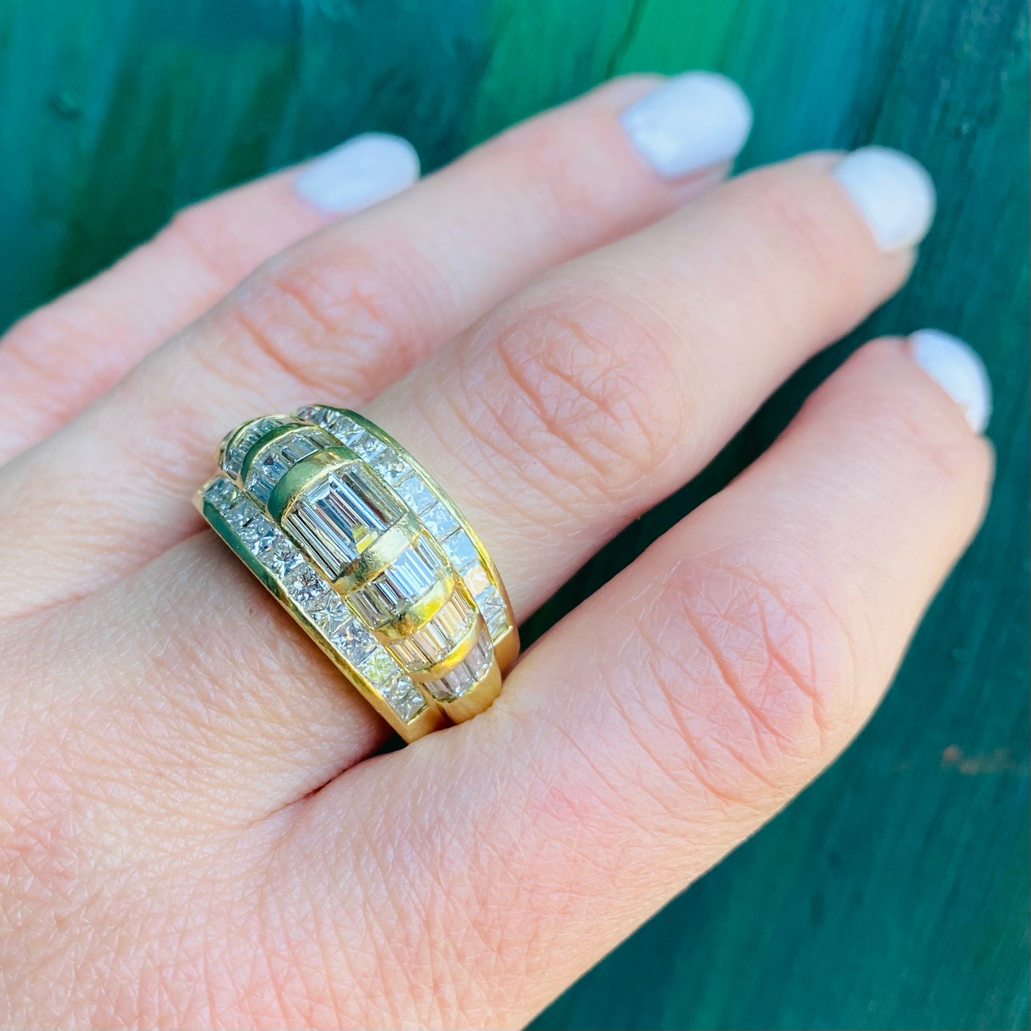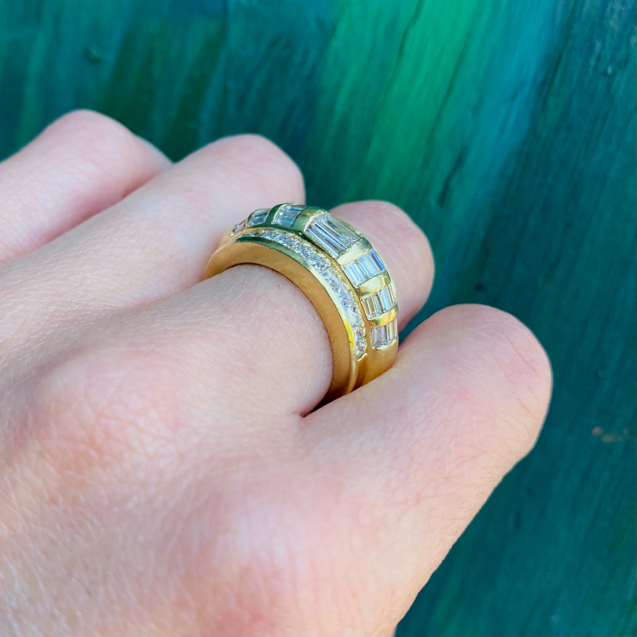 This absolute chunk of a ring shimmers and sparkles from every angle! In a delicious and rich 18k yellow gold a row of bar set baguette diamonds is set in the middle of the ring in an arc. Elegantly channel set above and below the baguettes are brilliant square cut diamonds. This ring feels marvelous on the hand with a weight of 16.71 grams. Circa 1980-90. Estate, Vintage and Antique Jewelry are a wonderful way to love our planet and yourself.