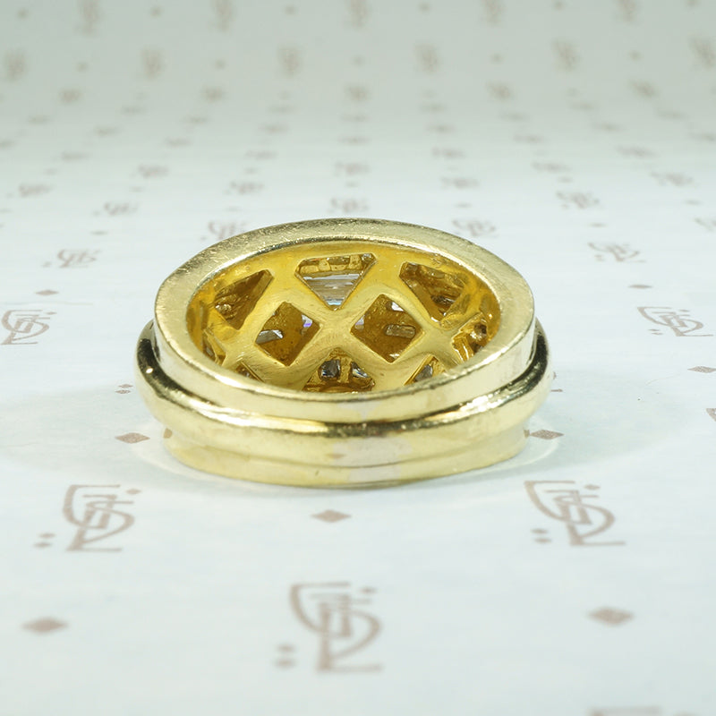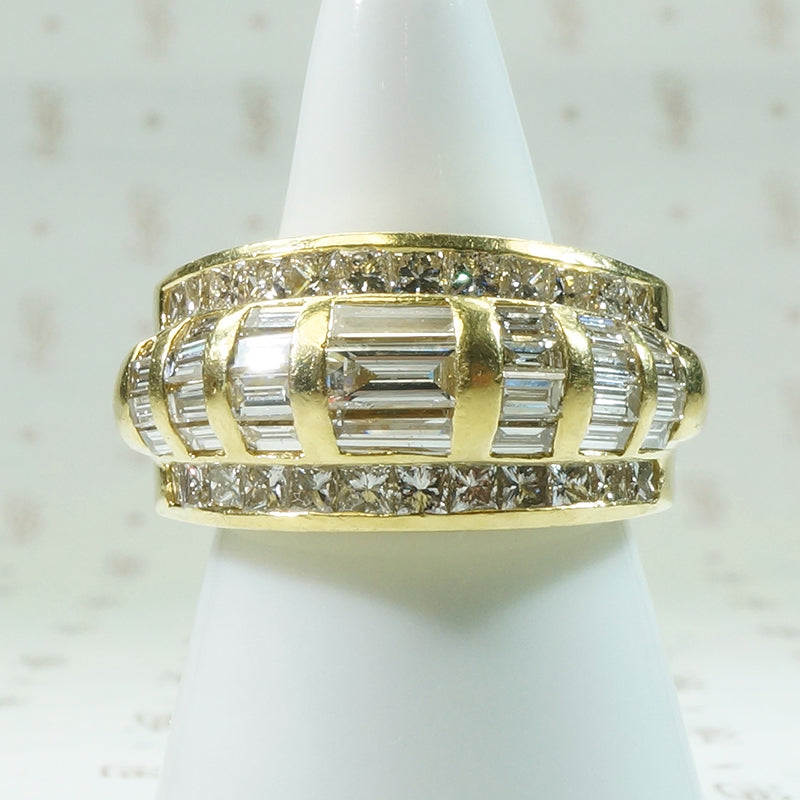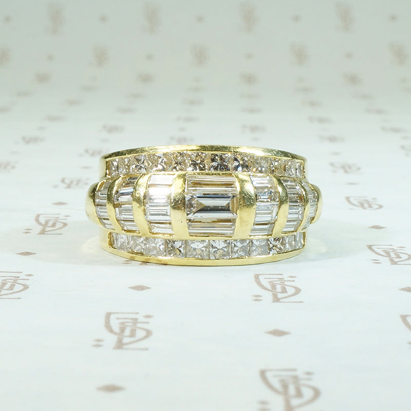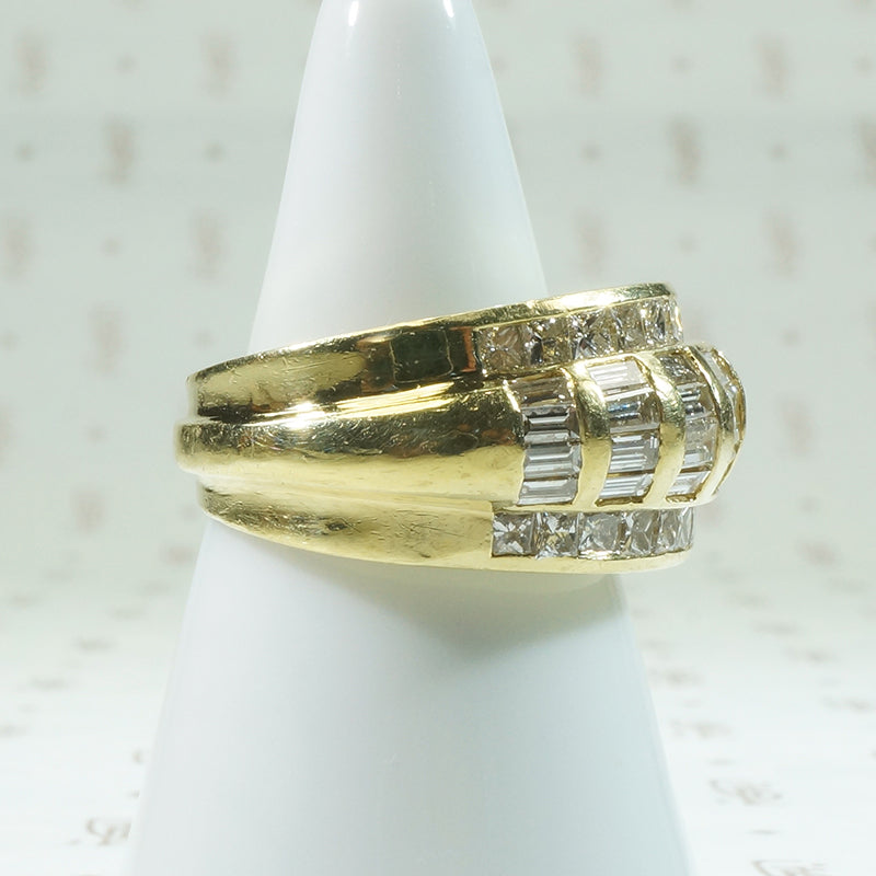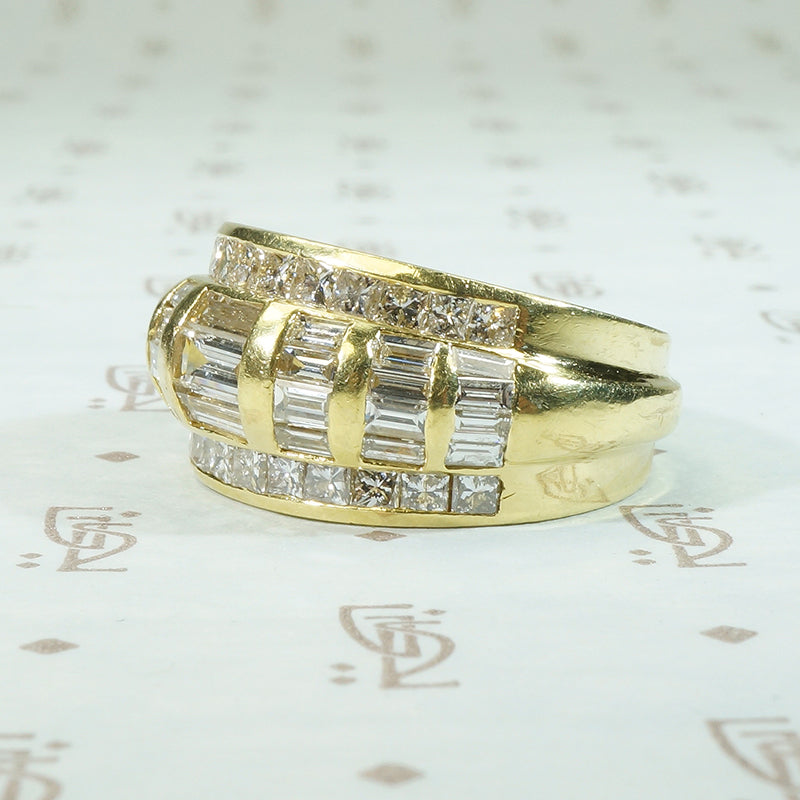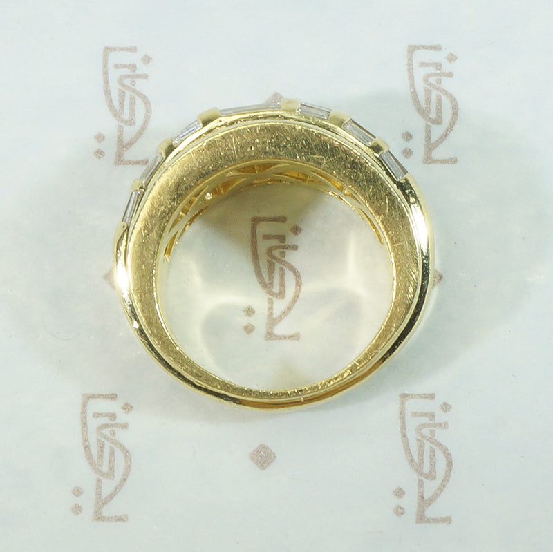 This absolute chunk of a ring shimmers and sparkles from every angle! In a delicious and rich 18k yellow gold a row of bar set baguette diamonds is set in the middle of the ring in an arc. Elegantly channel set above and below the baguettes are brilliant square cut diamonds. This ring feels marvelous on the hand with a weight of 16.71 grams. Circa 1980-90. Estate, Vintage and Antique Jewelry are a wonderful way to love our planet and yourself.