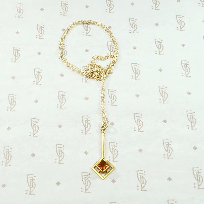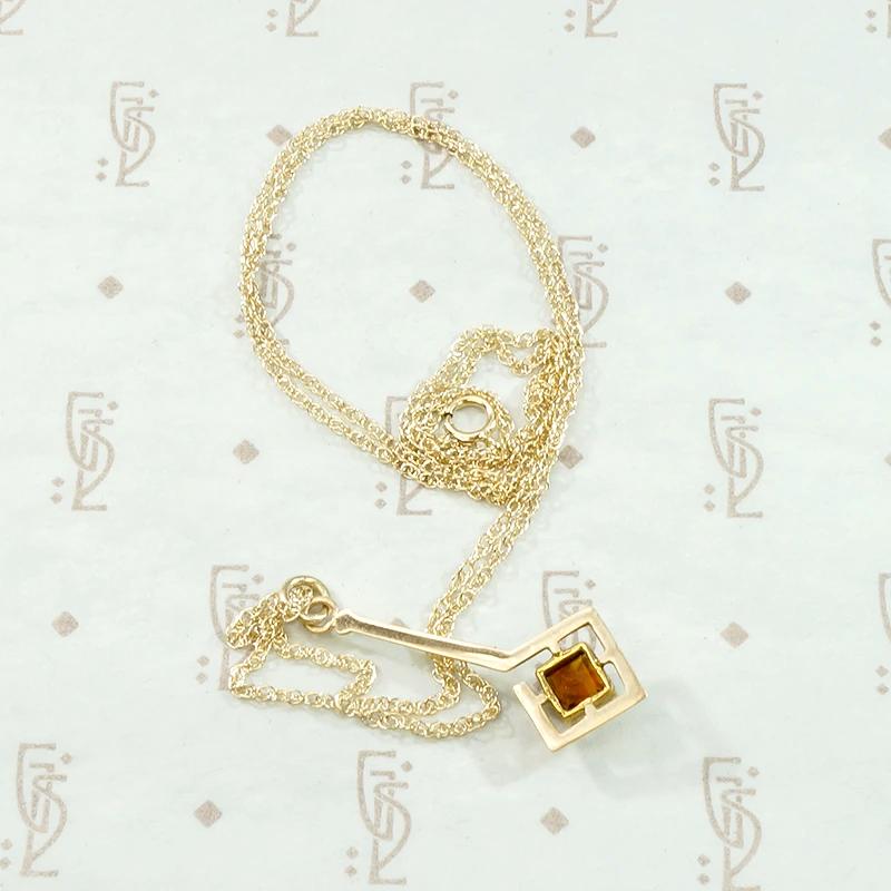 The sophisticated geometric lines of this citrine pendant display a marvelous design sensibility. A square, autumnally-toned natural citrine is bezel set in a 14k gold setting, the design framing and reflecting the shape of the gem. This is a conversion jewel; originally a stick pin, it has been re-purposed into a pendant. A lovely gift for your favorite November baby. Circa 1910.