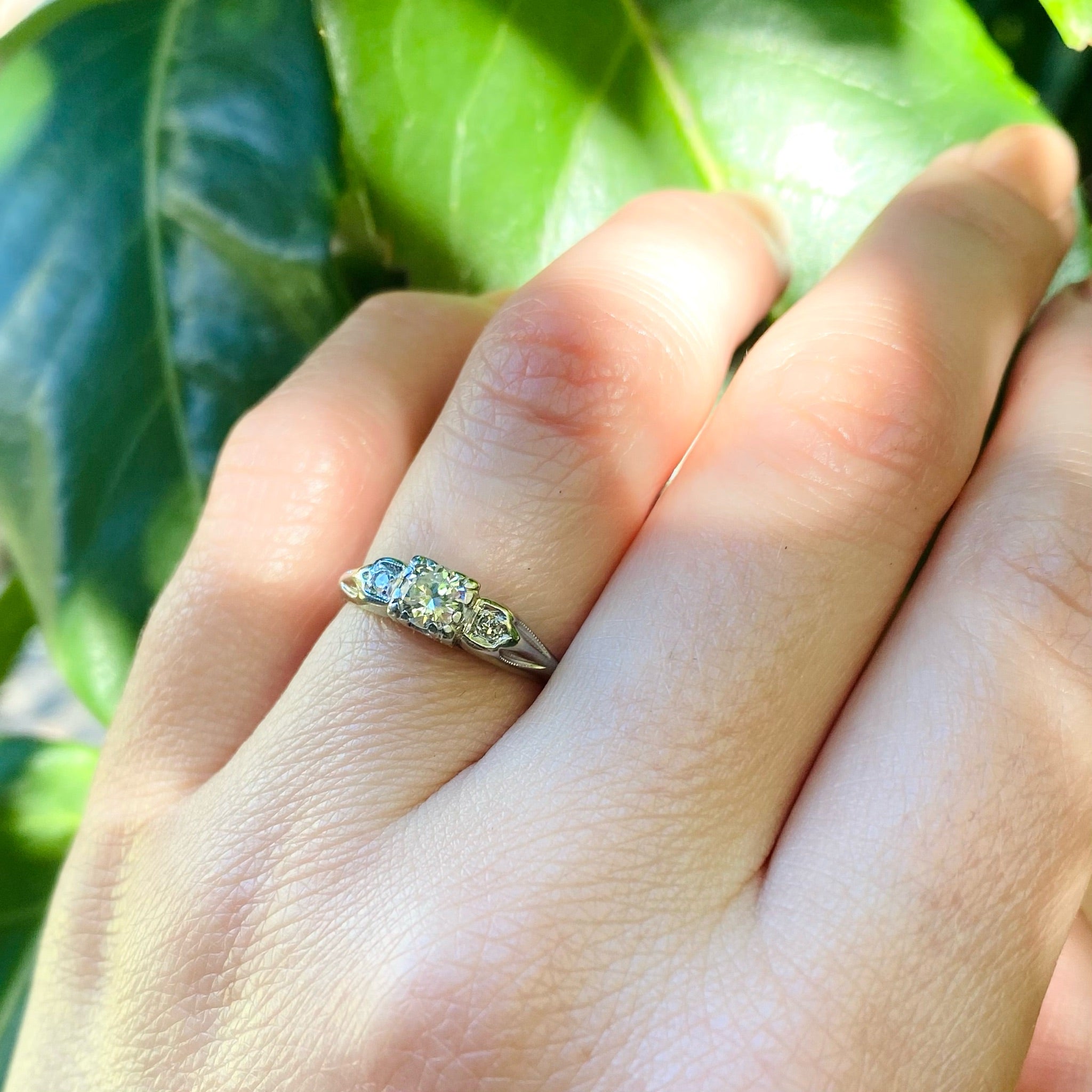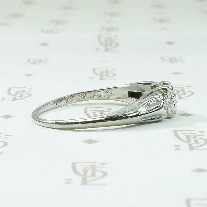 This sweet and simple vintage diamond engagement ring is a classic. The pretty center diamond is 0.40ct with an SI clarity and H color. This diamond is prong-set in a square head. The ring is gracefully sculpted in 18k white gold, with single accent diamonds set in pinched shoulders. The interior of the ring bears a personal inscription. Circa 1940.