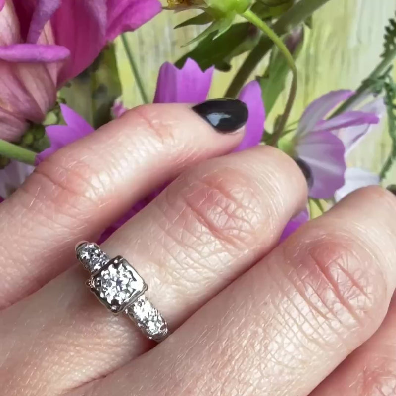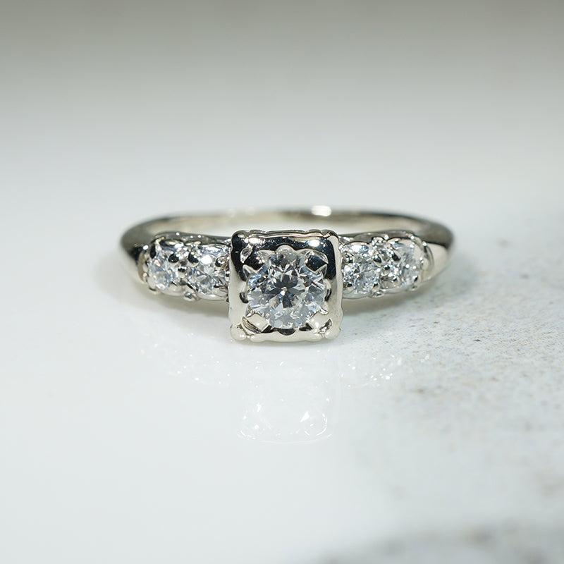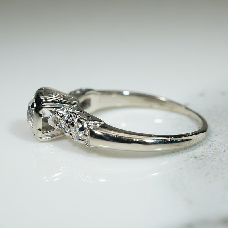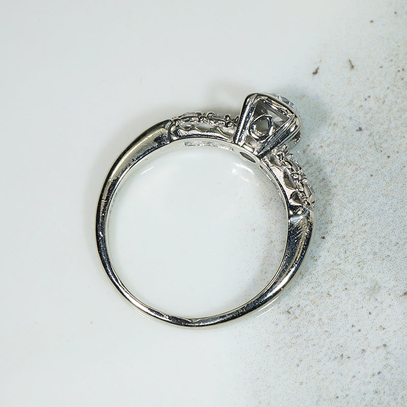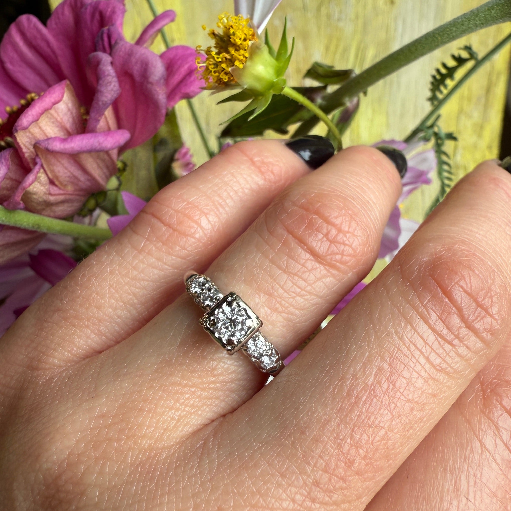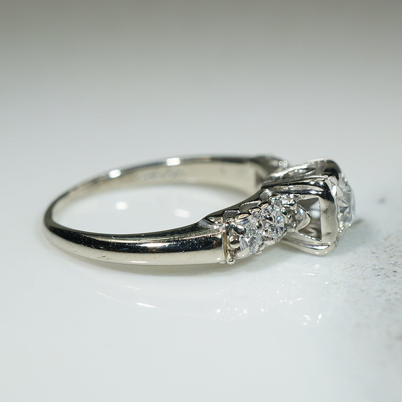 Pretty details on this classic 1940s 14k white gold engagement ring. Set in the center with a .25ct old euro diamond and twinkling side diamonds.