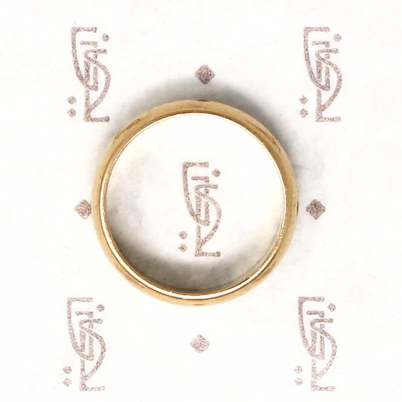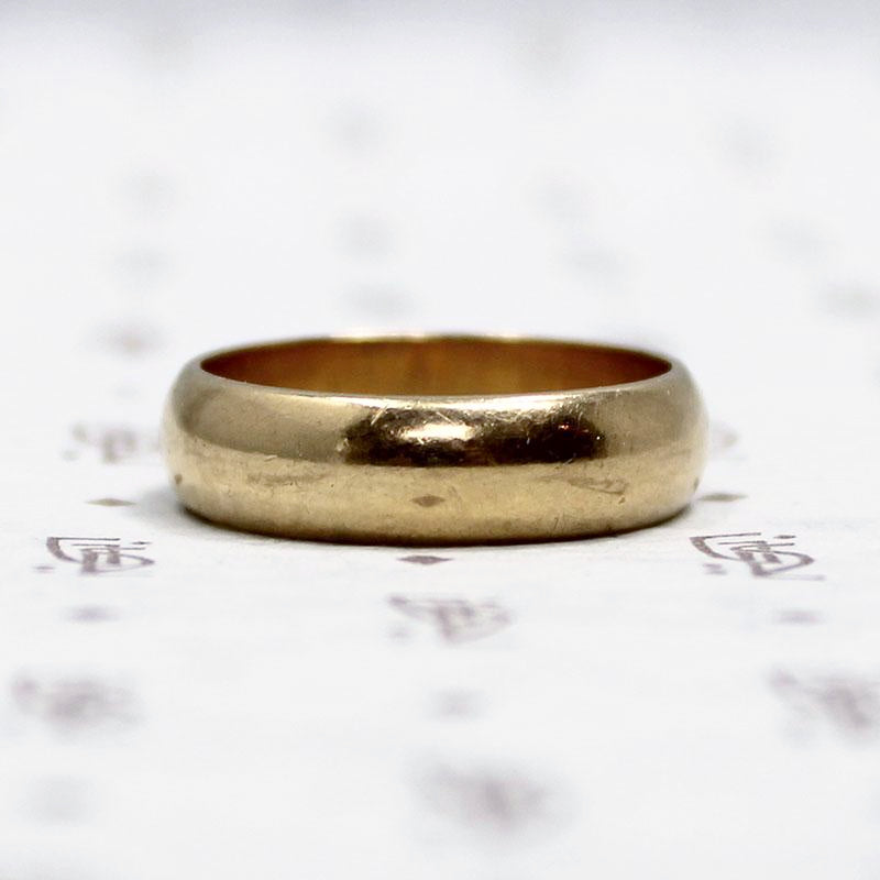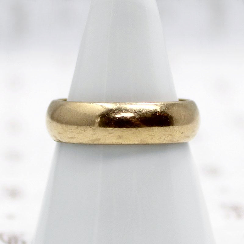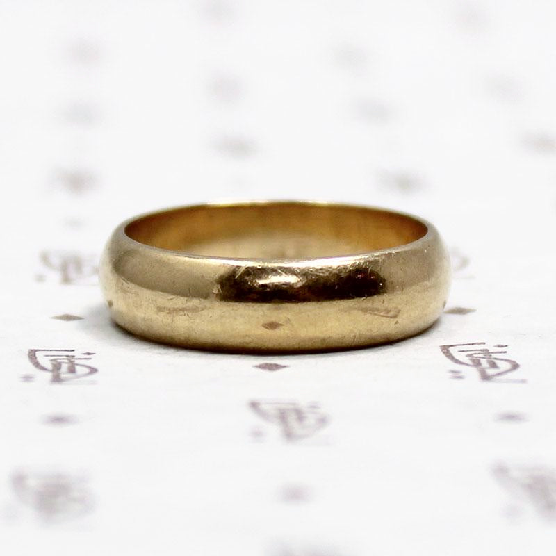 This gorgeous 14k gold half round band has a lovely weight on the hand. The vintage band shows some surface wear that adds textural interest to its beauty. At a size 9.5, this band can be made to fit both men and women. Circa 1950.