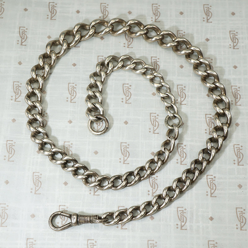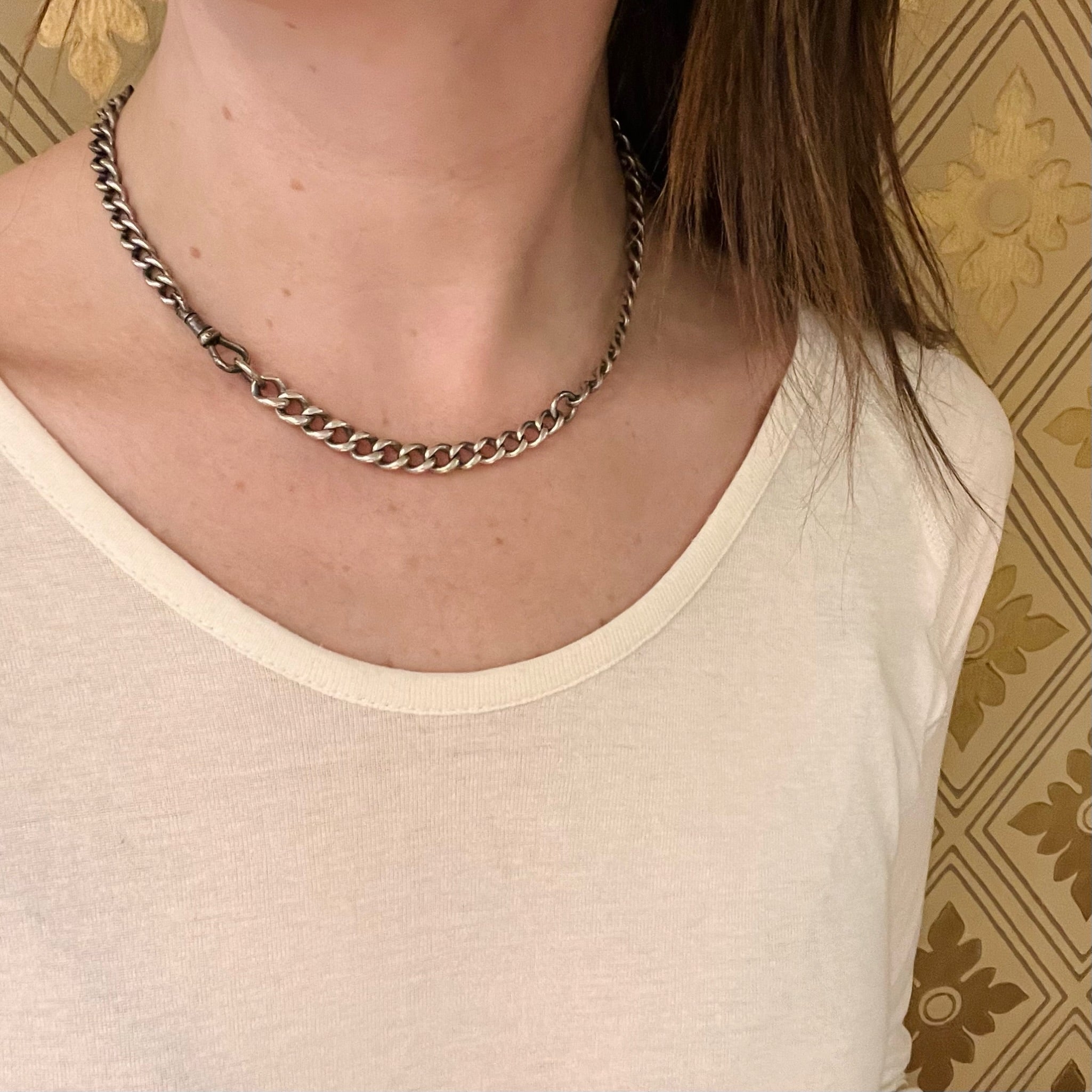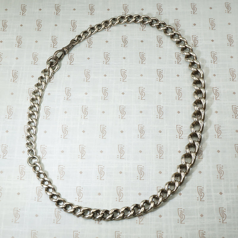 I love the feel of a classic chunky sterling curb chain from England. This one is from the late 1800's and has Lion Passant hallmarks on the links noting that it is Sterling Silver. I have used two chains to get this just right length tthey held together with a thick silver ring, the chain is finished with a Victorian silver watch swivel chain which acts as the clasp and the fob holder. This chain has a classic timeless vibe with a touch of punk. It weighs 1.85oz.