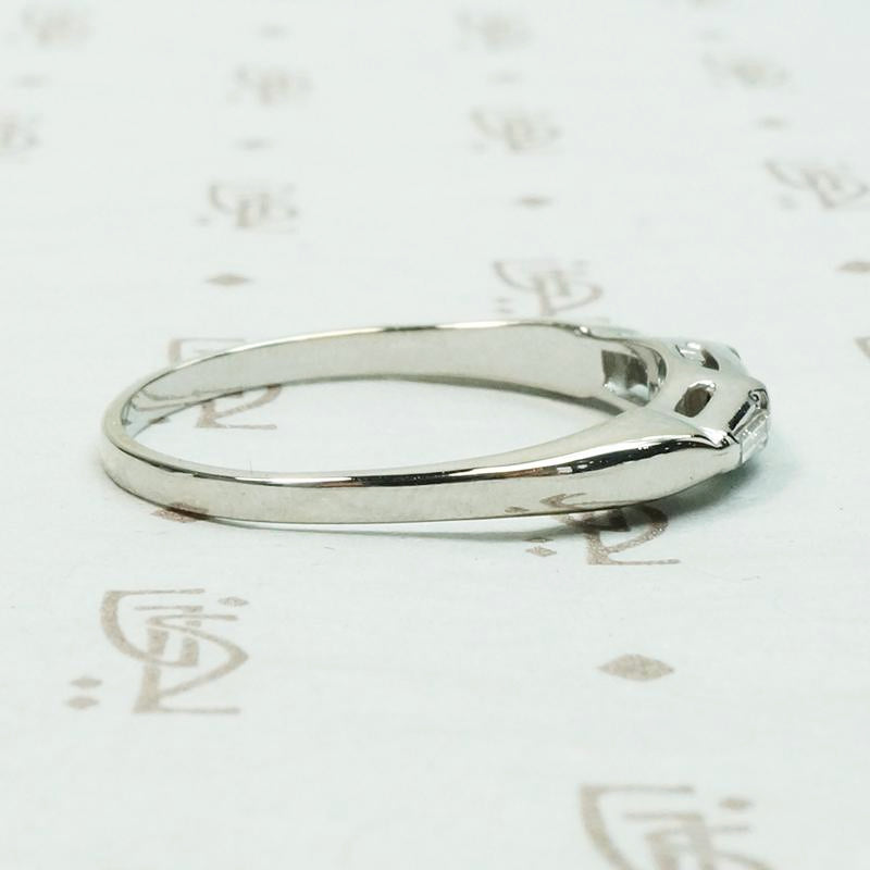 Classic Mid Century elegance. Two tapered diamond baguettes flank a central straight baguette, all bar set in a sleek 14k white gold band. The baguette set top arches slightly to meet the profile of your engagement ring. The shoulders are slightly pinched and the sides are sculpted and curved. Clean, modern lines with the craftsmanship only found in vintage. Circa 1940.