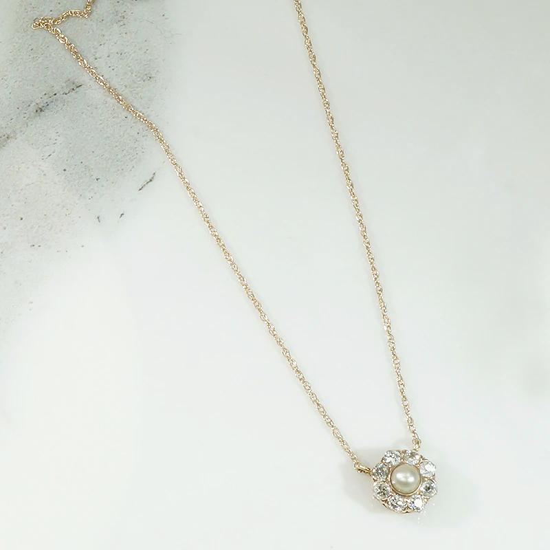 The classic halo jewel...timeless and always in style. This is a particularly lovely iteration, dating to the late 19th Century. A lucent natural pearl sits at the heart of a ring of old mine cut diamonds. The gems are prong set in a frame of 14k yellow gold. The chunky, sparkling diamonds have a total weight of 0.40cts. A perfect piece for any occasion. It is suspended on recycled 14k gold cable chain. Circa 1880.