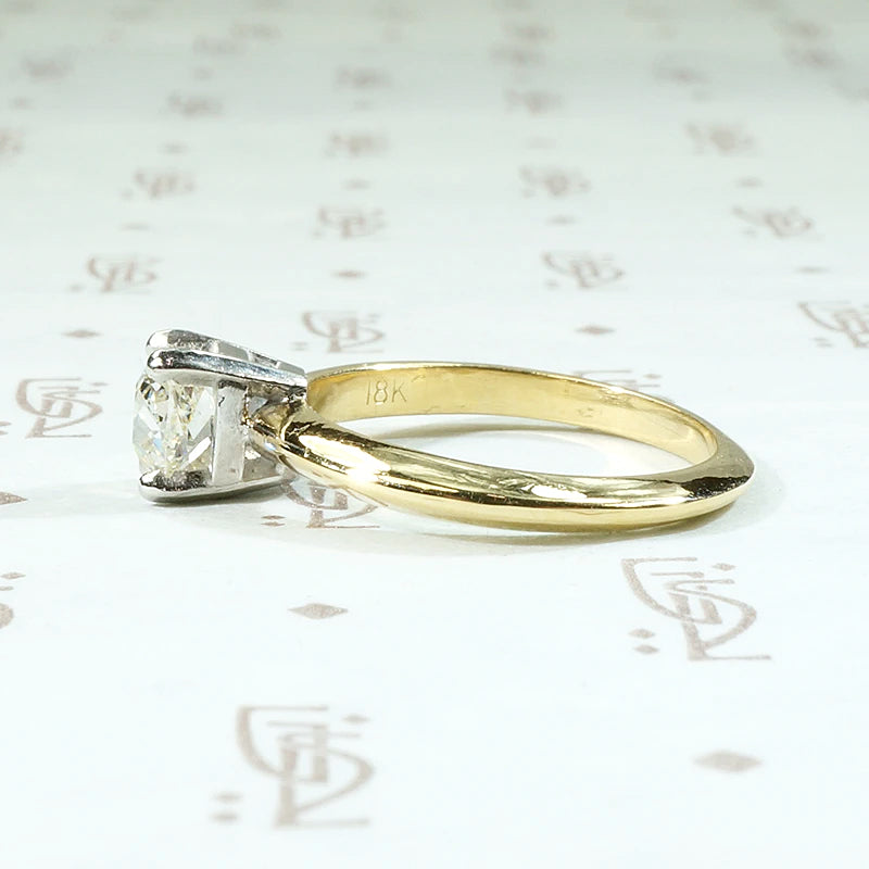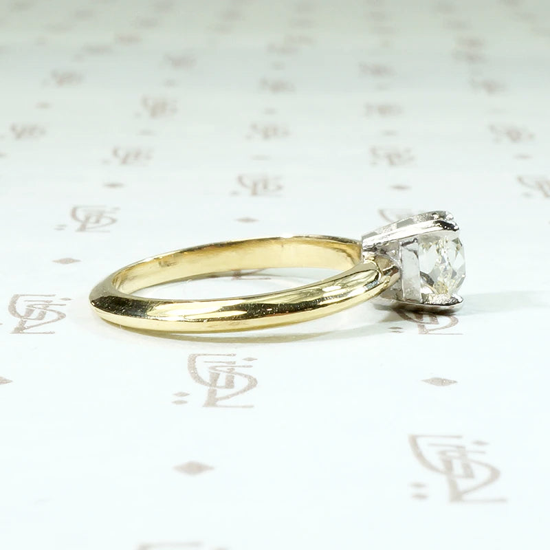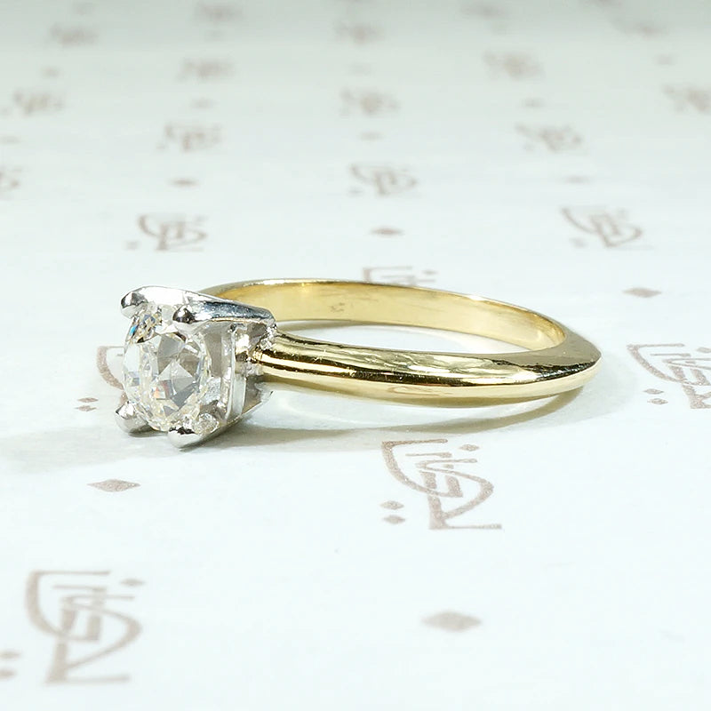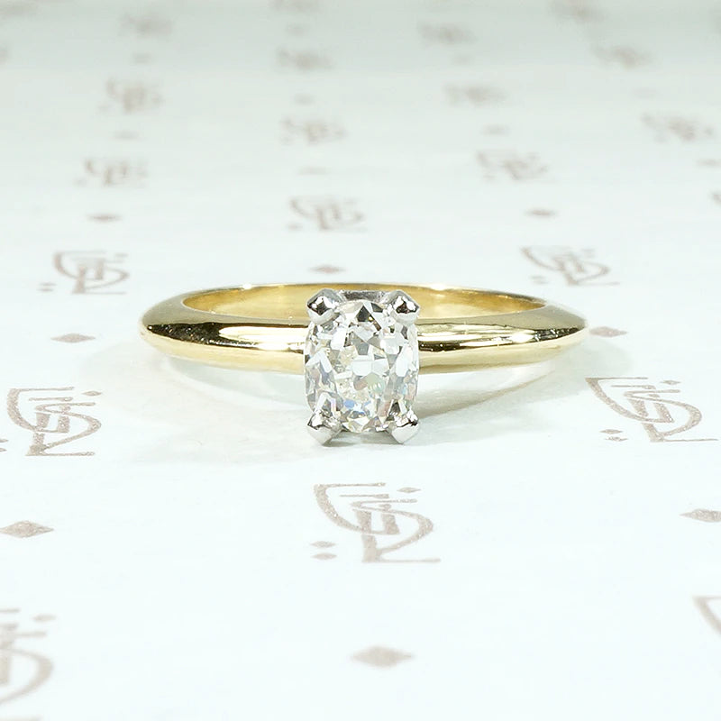 An antique old mine cut diamond is the star in this gorgeous solitaire engagement ring; it is an oval shape, deep and chunky with a fat open culet. The diamond is four-prong set in a raised platinum basket head. The band is crafted of 18k yellow gold, with a tapered knife edge. A classic solitaire with a unique diamond, this bright beauty was hand crafted with love using age old techniques in our own in house studio.